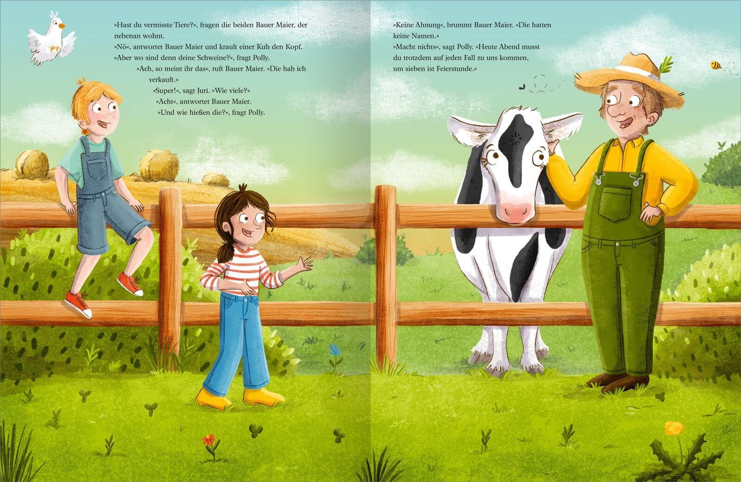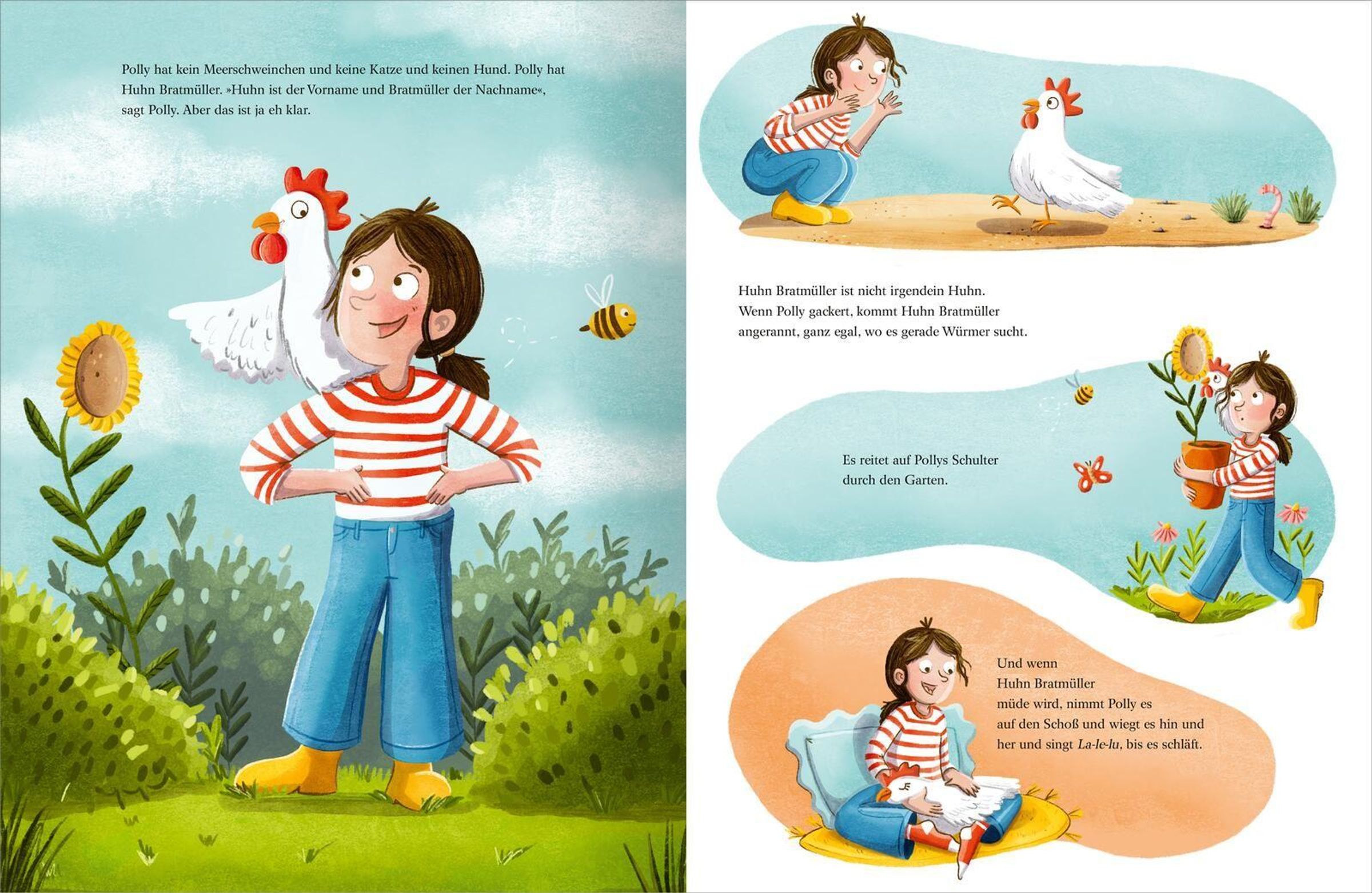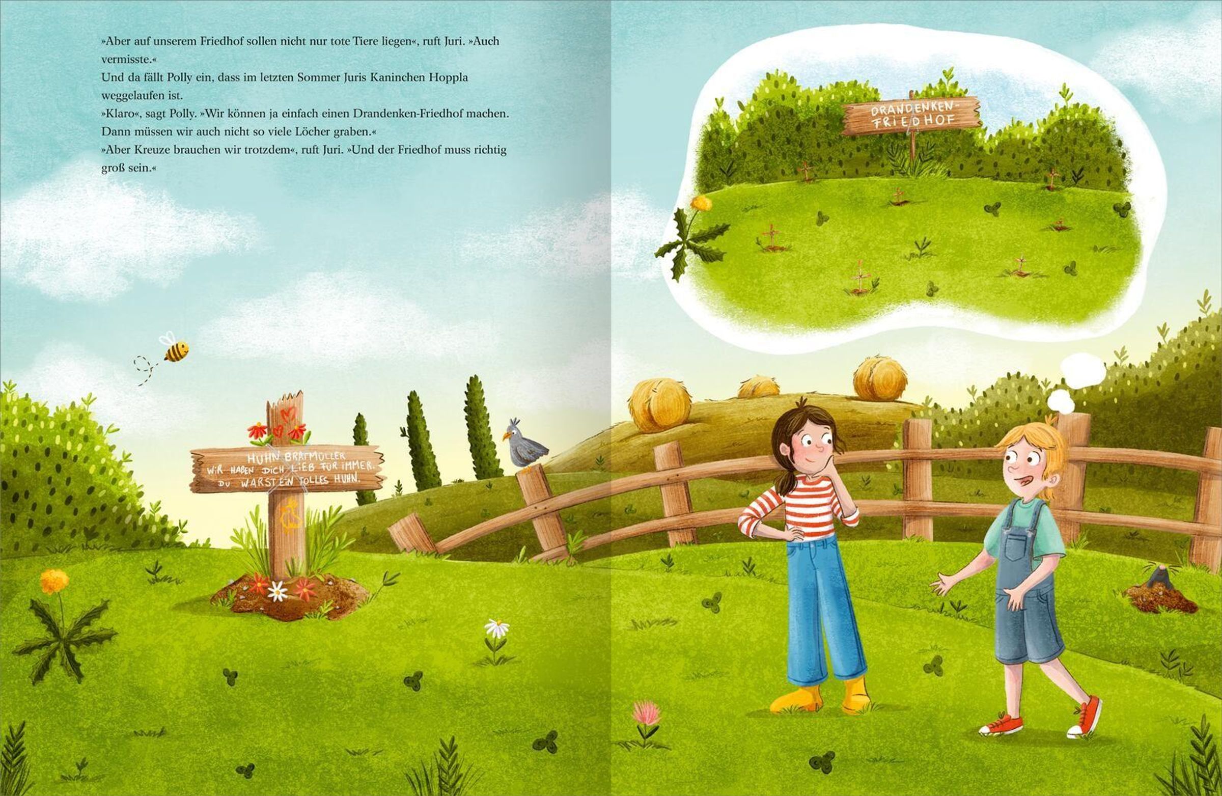Polly hat kein Meerschweinchen und keine Katze und keinen Hund. Polly hat ein Huhn. Wenn Polly gackert, kommt Huhn Bratmüller angerannt, ganz egal, wo es gerade Würmer sucht. Es reitet auf Pollys Schultern durch den Garten, und wenn Huhn Bratmüller müde wird, nimmt Polly es auf den Schoß und wiegt es hin und her. Doch plötzlich geht es Huhn Bratmüller nicht mehr gut. Es ist sehr müde und dann wacht es eines Tages nicht mehr auf. Polly ist furchtbar traurig und weint dicke Tränen in Mamas Kuschelpullover. Und dann beschließt sie, einen Drandenken-Friedhof zu errichten, direkt im Garten. Da können alle Tiere ein Grab bekommen. Egal ob verkaufte Schweine, kleine Kaninchen oder ausgeflogene Kanarienvögel. Polly findet für jedes Tier ein passendes Plätzchen zum Erinnern und für die letzte Ruhe. Und Polly ist sicher, ihr Huhn Bratmüller ist im Himmel das allerschnellste Huhn. Schließlich hat es ja Doppelflügel.