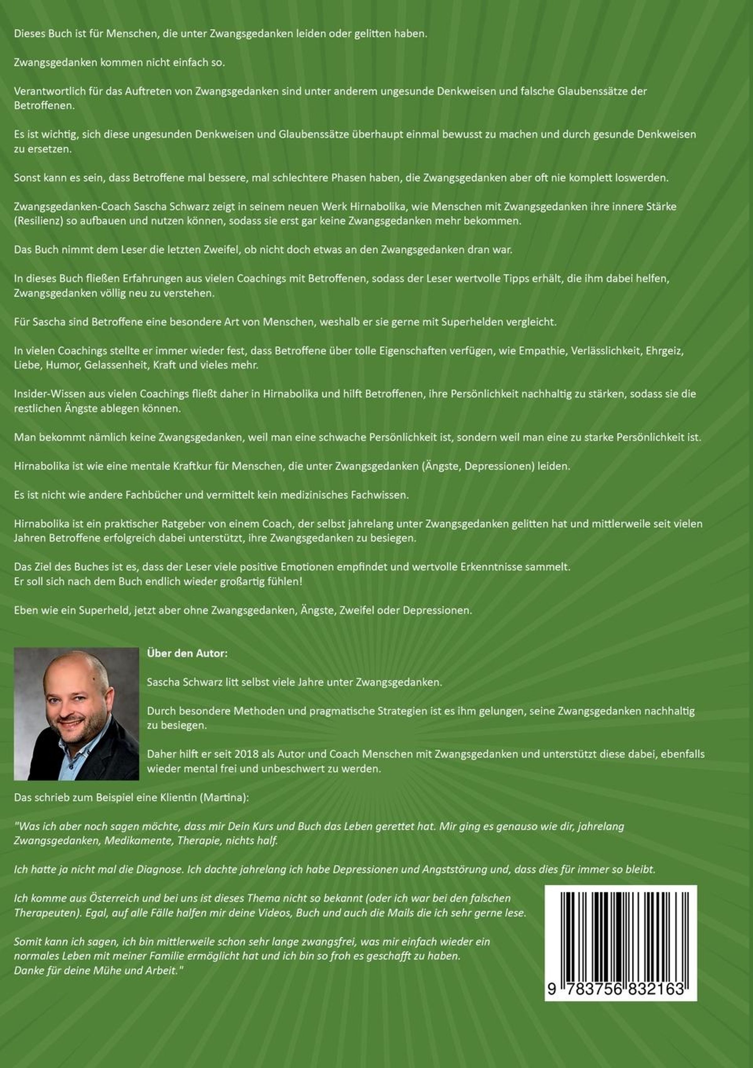 Dieses Buch ist für Menschen, die unter Zwangsgedanken leiden oder gelitten haben. Vielleicht kennst du bereits Für-immer-Urlaub-von-Zwangsgedanken von Sascha Schwarz, das Buch mit konkreten (praxisorientierten) Methoden, um den Weg aus dem Gedankenlabyrinth zu finden. Viele Betroffene haben damit die Grübelorgien beendet und ihre mentale Freiheit zurückgewonnen. Hirnabolika setzt dort an, wo der akute Leidensdruck aufhört und die eigentliche Frage beginnt: Wie sorge ich dafür, dass Zwangsgedanken gar nicht mehr zurückkommen? Denn Zwangsgedanken kommen nicht einfach so. Verantwortlich sind unter anderem ungesunde Denkweisen und falsche Glaubenssätze. Solange man sich diese nicht bewusst macht, bleibt man anfällig. Es gibt bessere Phasen, schlechtere Phasen, aber die Zwangsgedanken finden leider häufig wieder einen Nährboden. Hirnabolika zeigt dir, wie du ein gesundes Denkklima aufbaust. Ein inneres Fundament, das so stabil ist, dass Zwangsgedanken schlicht keinen Platz mehr finden. Kein Kampf, kein Wegdrücken, sondern ein mentales Grundgerüst, an dem solche Gedanken nicht mehr hängenbleiben. Was Zwangsgedanken-Coach Sascha Schwarz in hunderten Coachings immer wieder beobachtet: Menschen mit Zwangsgedanken sind keine schwachen Persönlichkeiten. Sie sind empathisch, ehrgeizig, belastbar. Genau diese Stärke wird ihnen zum Stolperstein, weil sie sich zu viel zumuten und zu wenig auf ihr inneres Gleichgewicht achten. Hirnabolika hilft dir, deine vorhandene Stärke so einzusetzen, dass sie dich schützt statt überfordert. Das Buch ist kein medizinisches Fachbuch, sondern ein praktischer Ratgeber von einem Coach, der selbst jahrelang unter Zwangsgedanken gelitten hat und heute Betroffene dabei begleitet, sie dauerhaft hinter sich zu lassen. Das Ziel: Dass du dieses Buch zuklappst und dich wieder mit neuer Kraft und mentaler Energie spürst. Nicht trotz allem, was du durchgemacht hast. Sondern gerade deswegen.