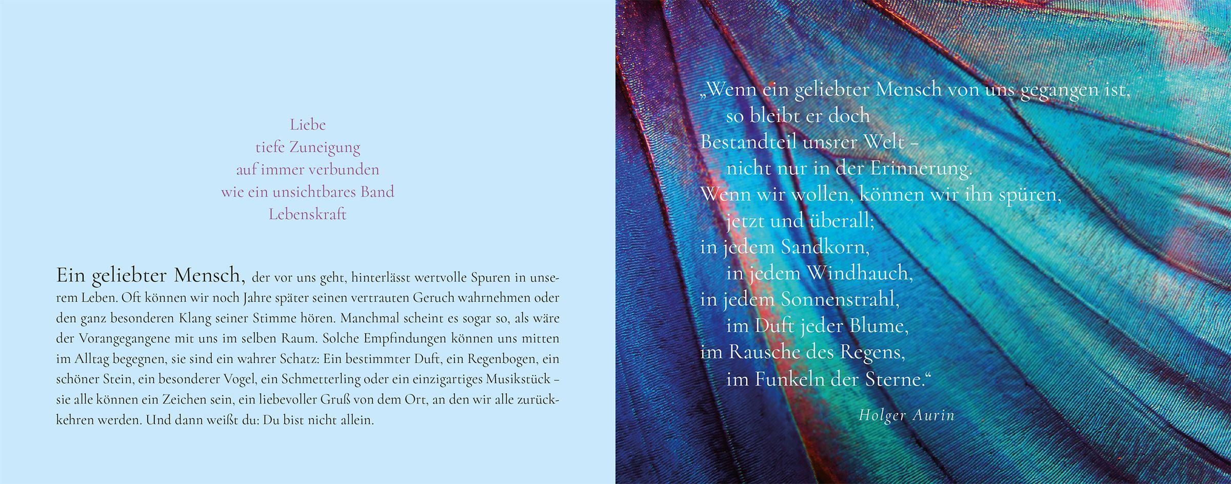 "Wenn ein geliebter Mensch von uns gegangen ist, so bleibt er doch Bestandteil unserer Welt - nicht nur in der Erinnerung. Wenn wir wollen, können wir ihn spüren, jetzt und überall: in jedem Sandkorn, in jedem Windhauch, in jedem Sonnenstrahl, im Duft jeder Blume, im Rauschen des Regens, im Funkeln der Sterne." (Holger Aurin)
