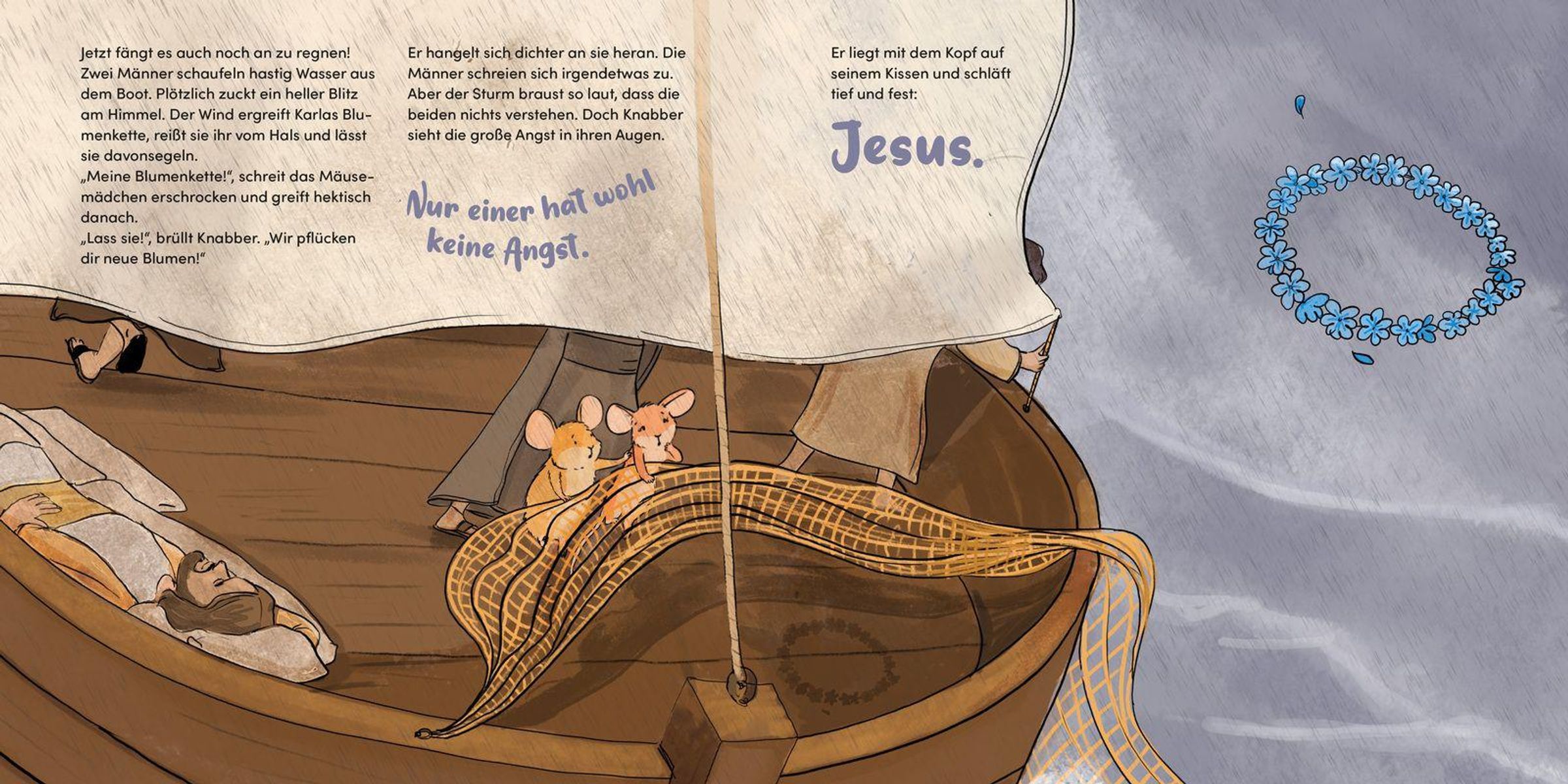 Die Mäuse Karla und Knabber erleben hautnah mit, wie Jesus den Sturm stillt - und zeigen Kindern auf liebevolle Weise: Auch wenn es um uns tobt, dürfen wir wissen, dass Jesus bei uns ist. Aus der kindgerechten Sicht der beiden Mäuse wird die biblische Geschichte lebendig, nahbar und spannend erzählt. So lernen Kinder: Angst ist okay - aber wir sind nicht allein mit diesem Gefühl. Denn Jesus ist größer als alles, was uns Angst machen kann.