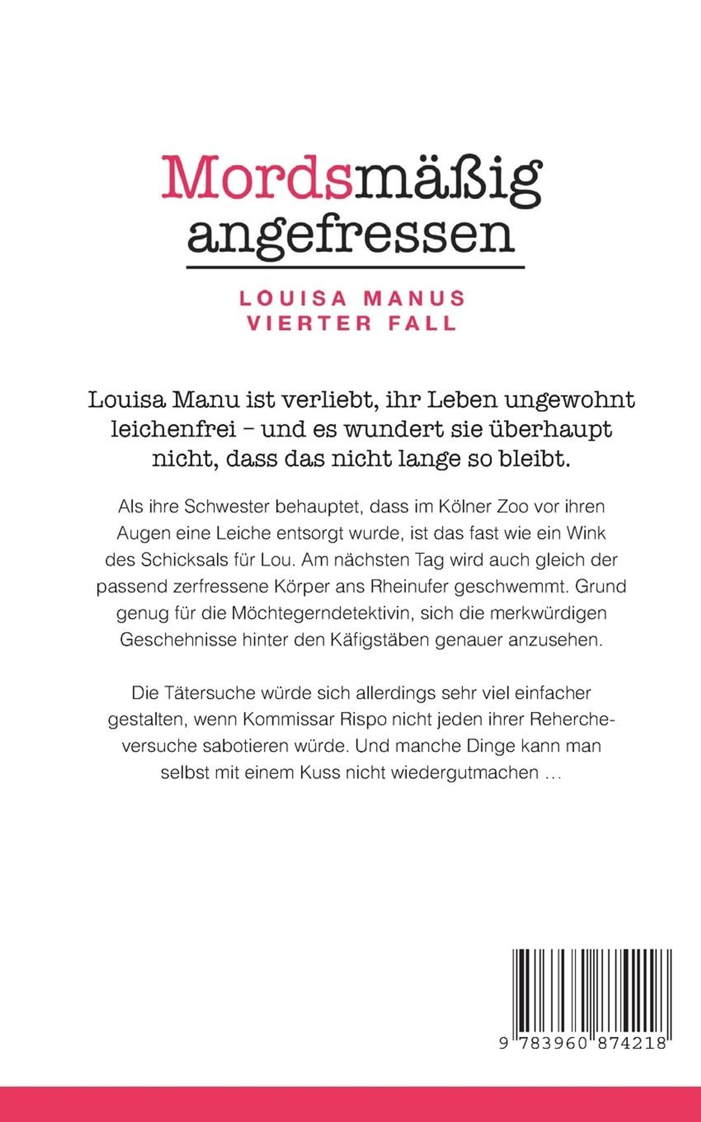 Eine Leiche im Zoo und jede Menge Chaos: Der vierte Fall für Louisa Manu! Louisa Manu ist verliebt, ihr Leben ungewohnt leichenfrei -- und es wundert sie überhaupt nicht, dass das nicht lange so bleibt. Als ihre Schwester behauptet, dass im Kölner Zoo vor ihren Augen eine Leiche entsorgt wurde, ist das fast wie ein Wink des Schicksals für Lou. Am nächsten Tag wird auch gleich der passend zerfressene Körper ans Rheinufer geschwemmt. Grund genug für die Möchtegerndetektivin, sich die merkwürdigen Geschehnisse hinter den Käfigstäben genauer anzusehen. Die Tätersuche würde sich allerdings sehr viel einfacher gestalten, wenn Kommissar Rispo nicht jeden ihrer Rehercheversuche sabotieren würde. Und manche Dinge kann man selbst mit einem Kuss nicht wiedergutmachen ... Jeder Band der Reihe ist in sich abgeschlossen und kann unabhängig voneinander gelesen werden. Erste Leserstimmen „Saskia Louis gelingt es einfach immer, mich zum Lachen zu bringen!" „Ich kann diese Reihe jedem empfehlen. Aber Achtung: Louisa macht süchtig ..." „spritzig, humorvoll, spannend, mitreißend und mit einer guten Portion Gefühle" „Vergnüglich und frech wie auch die vorigen Bände!"