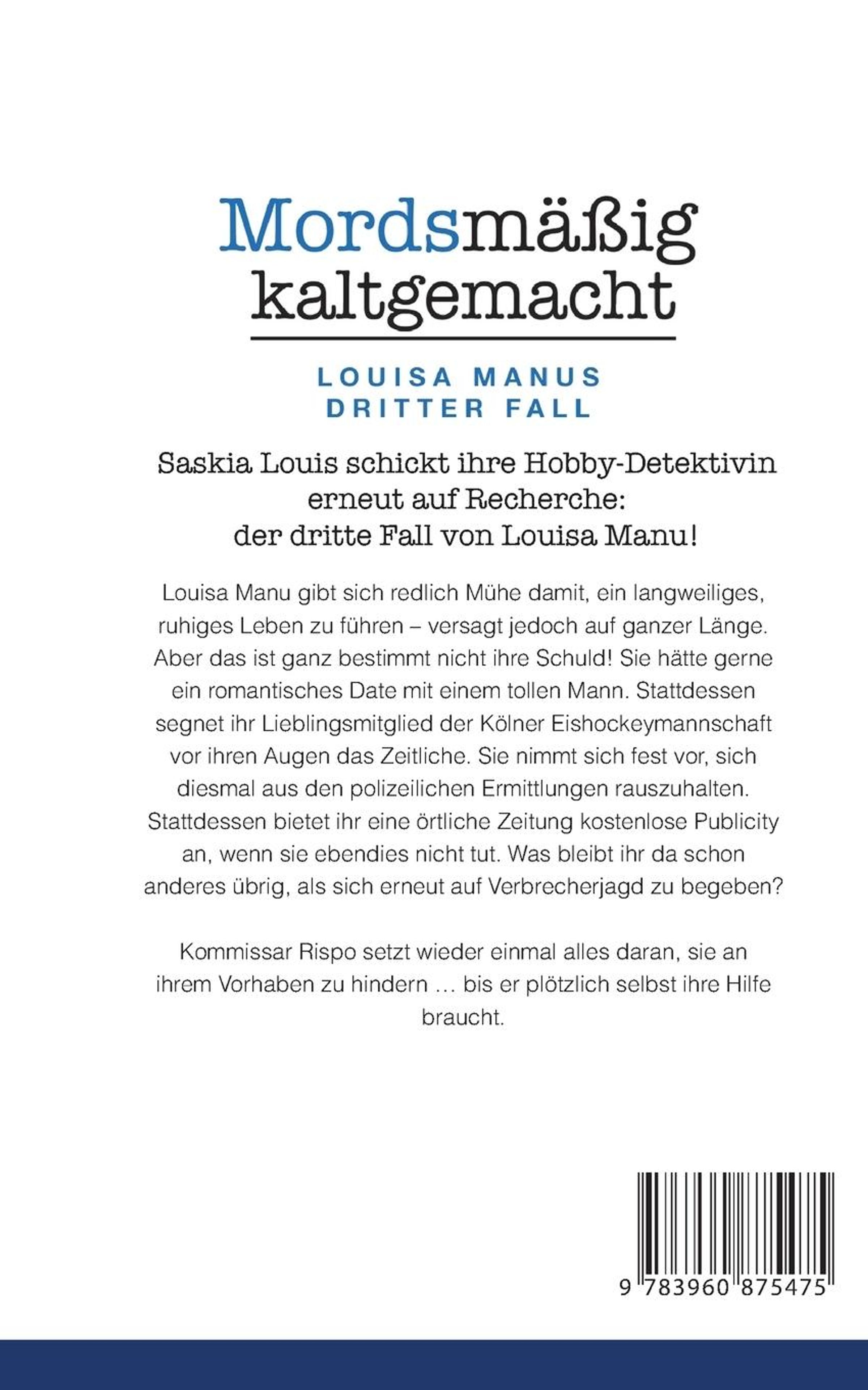 Saskia Louis schickt ihre Hobby-Detektivin erneut auf Recherche: der dritte Fall von Louisa Manu! Louisa Manu gibt sich redlich Mühe damit, ein langweiliges, ruhiges Leben zu führen --versagt jedoch auf ganzer Länge. Aber das ist ganz bestimmt nicht ihre Schuld! Sie hätte gerne ein romantisches Date mit einem tollen Mann. Stattdessen segnet ihr Lieblingsmitglied der Kölner Eishockeymannschaft vor ihren Augen das Zeitliche. Sie nimmt sich fest vor, sich diesmal aus den polizeilichen Ermittlungen rauszuhalten. Stattdessen bietet ihr eine örtliche Zeitung kostenlose Publicity an, wenn sie ebendies nicht tut. Was bleibt ihr da schon anderes übrig, als sich erneut auf Verbrecherjagd zu begeben? Kommissar Rispo setzt wieder einmal alles daran, sie an ihrem Vorhaben zu hindern ... bis er plötzlich selbst ihre Hilfe braucht.