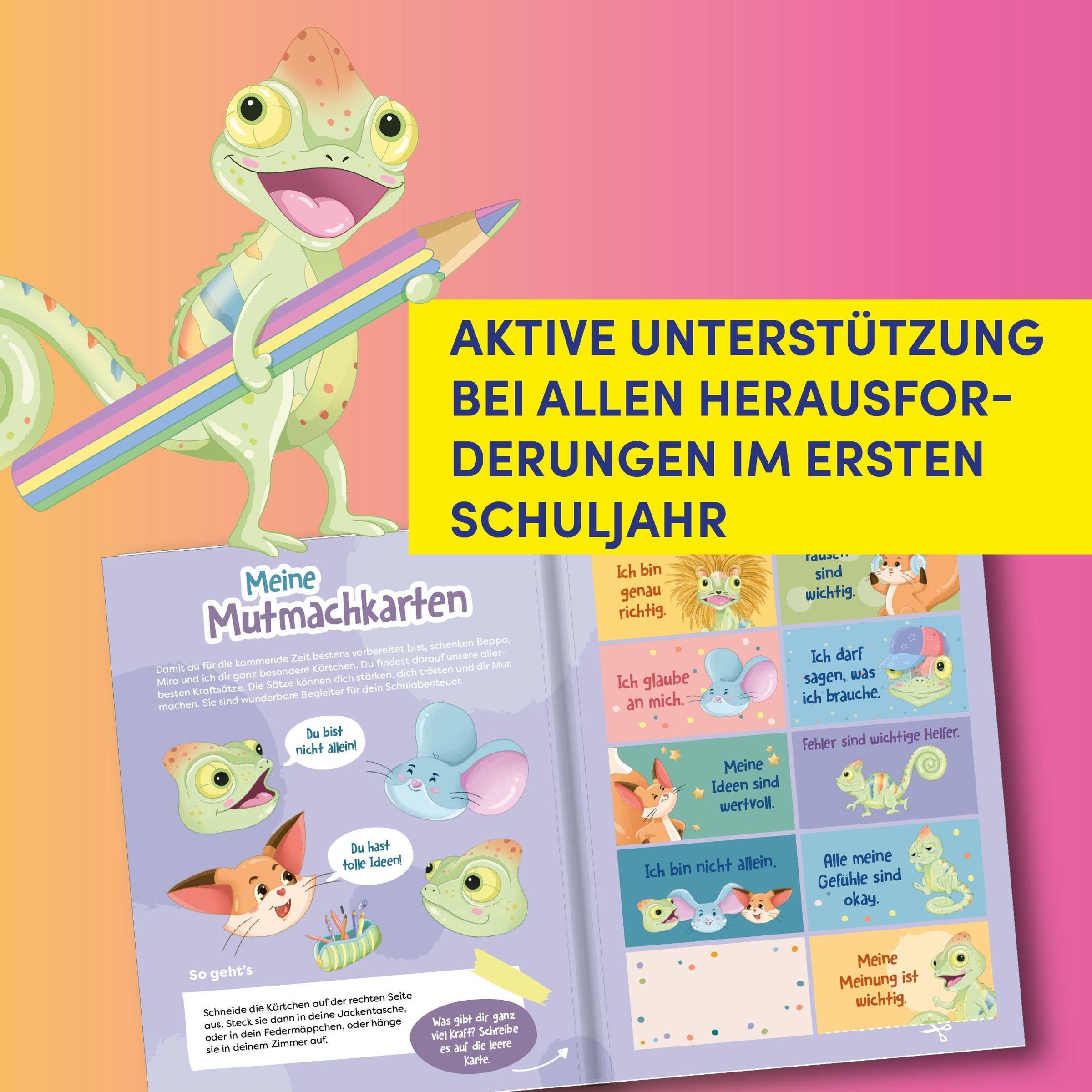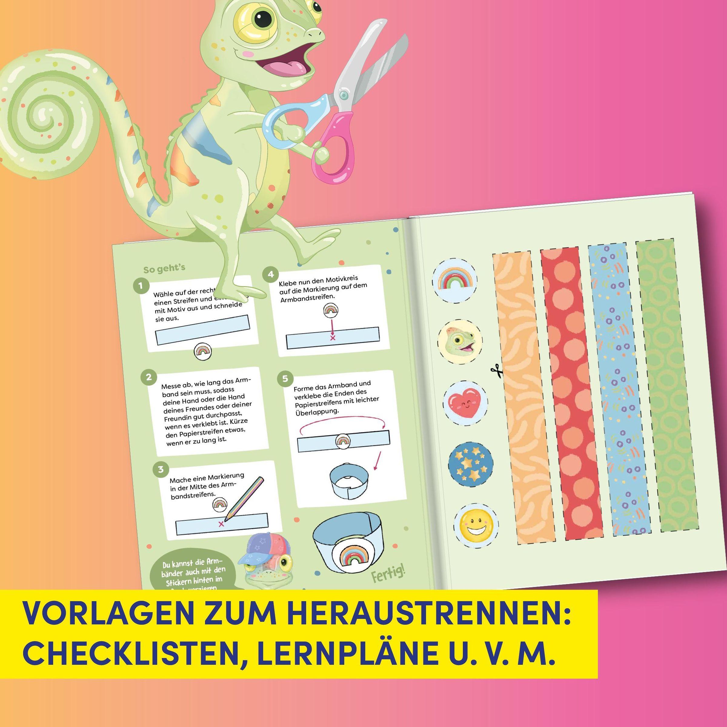 Mit herausnehmbaren Vorlagen wie Checklisten, Lernplänen und Motivationskarten können Kinder und Eltern sofort starten. Von der Vorfreude auf die Einschulung und die neuen Freunde über hilfreiche Unterstützung beim Lernen bis hin zum individuellen Rückblick auf große und kleine Erfolge - für jeden Meilenstein gibt es die passende Unterstützung. Die bunten Seiten lassen sich leicht entnehmen und direkt beschreiben - ideal als Arbeitshilfe im Alltag. Darüber hinaus gibt es Motivations-Sticker , mit denen Erfolge visualisiert werden können und die Motivation steigt.