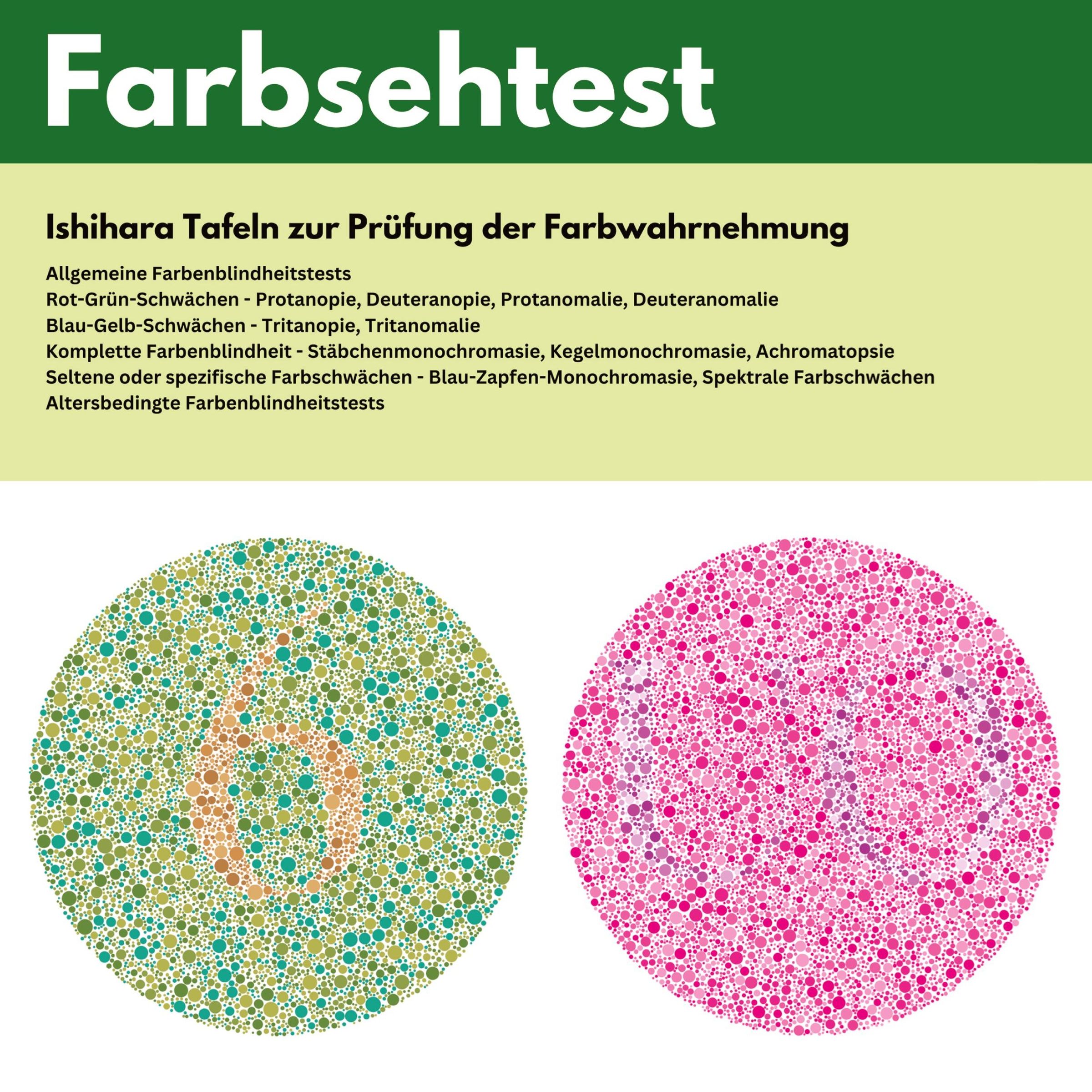 • Ishihara Tafeln zur Prüfung der Farbwahrnehmung, Rot-Grün-Schwäche, Blau-Gelb-Schwäche, Seltene Farbwahrnehmungsstörungen, Altersbedingte Farbsehschwäche