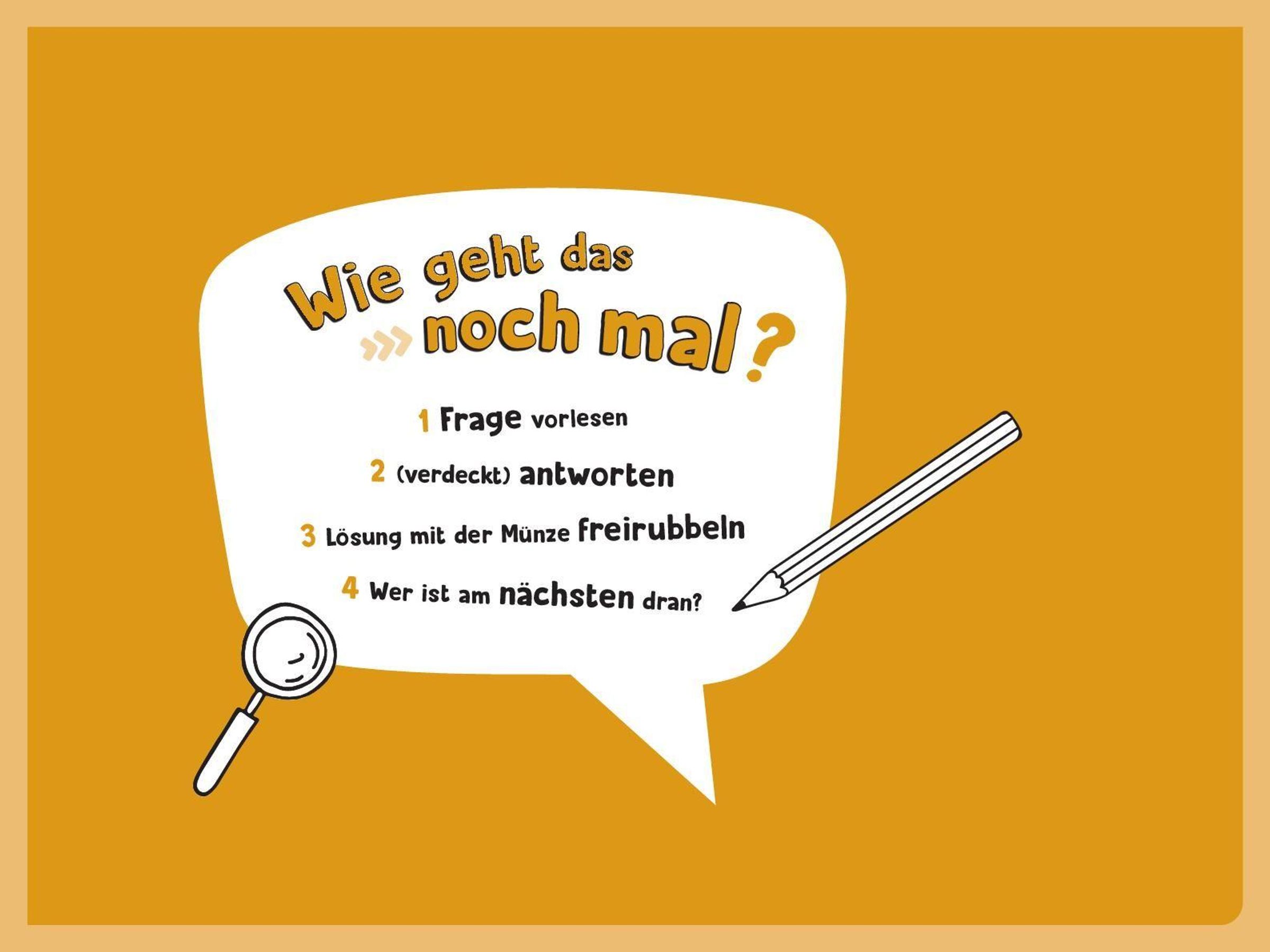 Die Antworten sind alle unter Rubbellack verborgen, so hat niemand einen Vorteil. Jedem Block liegt außerdem unsere coole Schätz-mal!-Münze bei, mit der die Antworten easy und stilsicher freigerubbelt werden können.