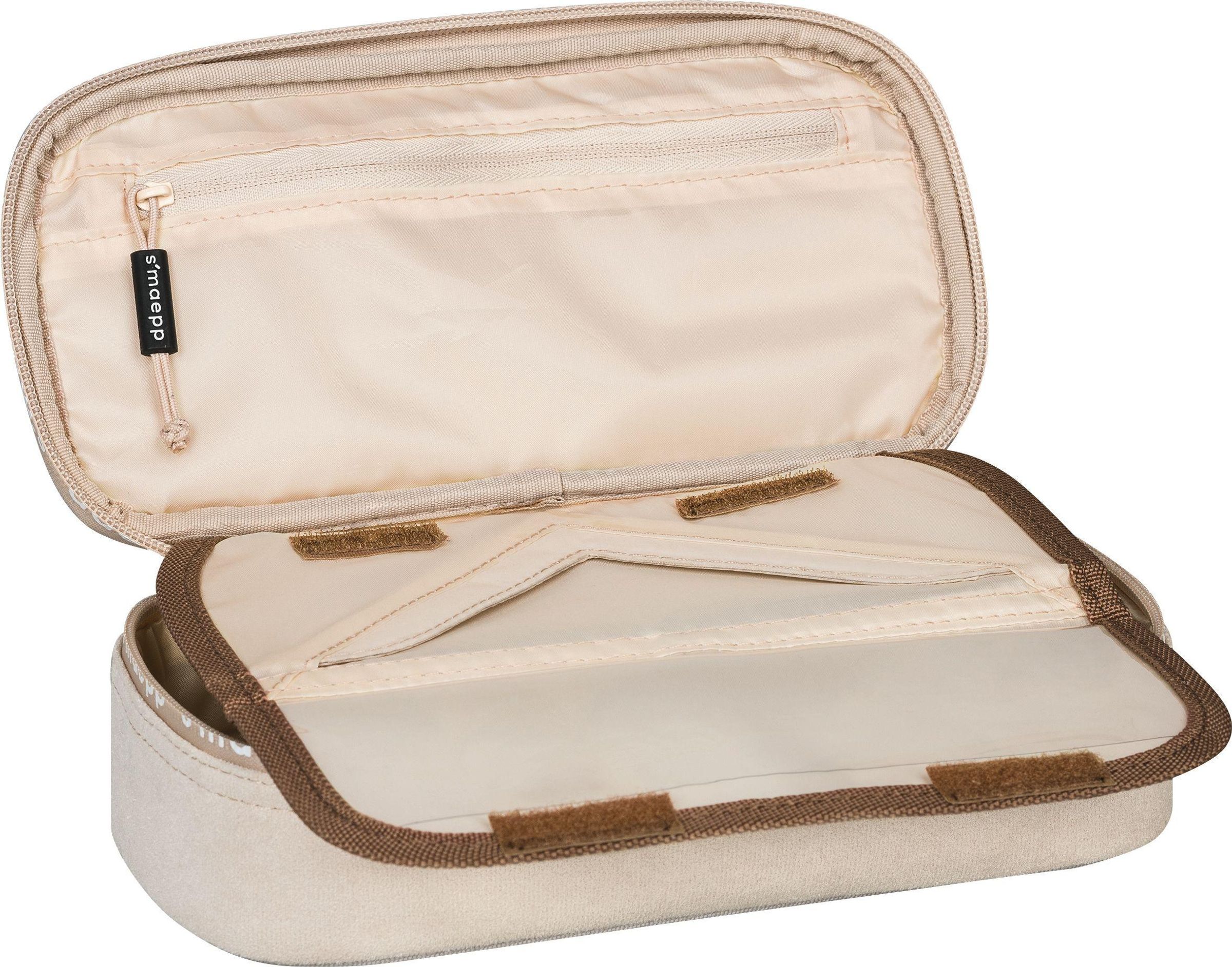 großer und übersichtlicher Stauraum bei kompakten Abmessungen, strukturierte Einteilung schafft Ordnung und Übersicht ? B/H/T: 220×60×110 mm ? Plüschmaterial, Farbe: beige ? extra Reißverschlussfach, passend auch für Smartphones, zusätzliche Innenklappe mit 5 extra robusten Stiftehaltern und praktischer Netztasche, Fach für Geometrie-Dreieck und Stundenplan, 2 Einsteckfächer, sehr gute Übersichtlichkeit und leichteres Entnehmen , der charakteristische, verdeckte Outdoor-Reißverschluss ist leichtgängig und robust, stabile und hochwertig verarbeitete Nähte sowie elegante Doppelziernähte, gummierter Zipper mit markantem Seemannsknoten an einer Outdoor-Reepschnur - zum leichten Aufziehen des Reißverschlusses ? 1 Klappe(n)