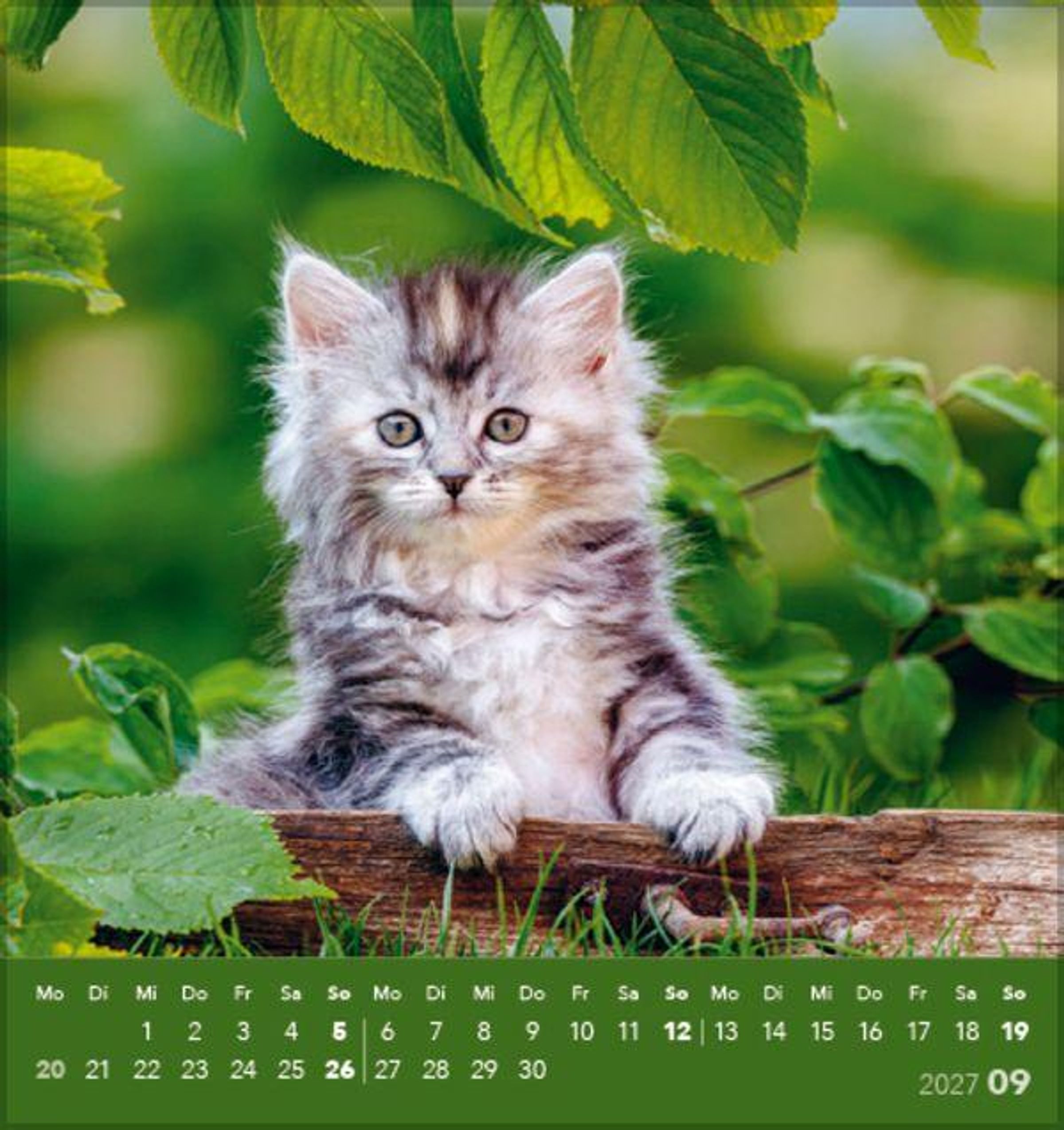 Aufstellbarer Postkartenkalender mit bezaubernden Fotos von eleganten Stubentigern und rührend niedlichen Kätzchen.