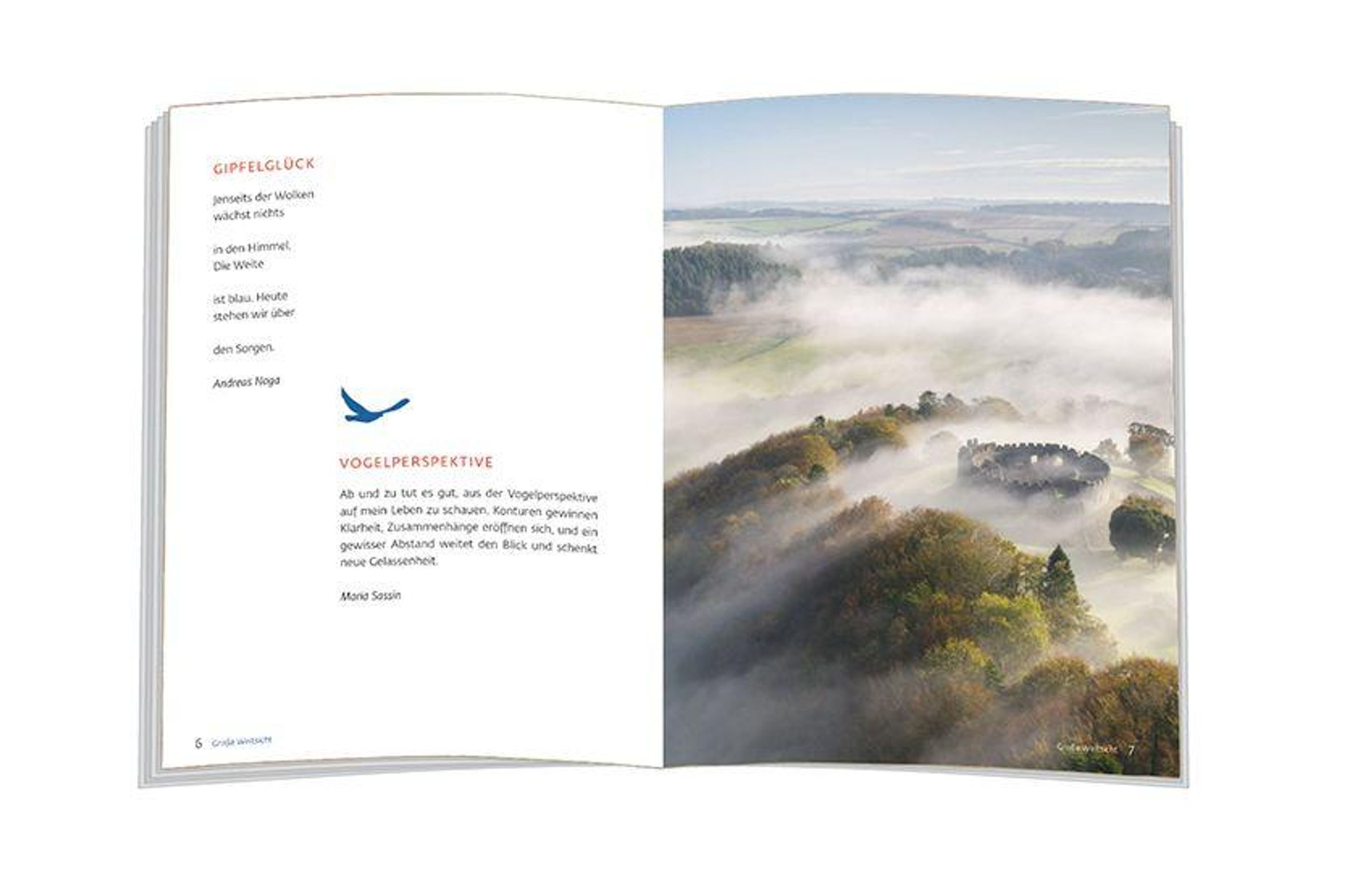 Einfach mal abheben und die Welt von oben betrachten. Die Gedichte, Gedanken und Geschichten und die überraschenden Luftbilder in diesem Buch schenken schöne Aussichten, tiefe Einsichten und eine gute Übersicht, um mit hoffnungsvoller Zuversicht und frischen Perspektiven ins neue Lebensjahr zu starten. Mit Texten von Doris Bewernitz, Michaela Deichl, Max Feigenwinter, Anselm Grün, Gerhard Heilmann, Mascha Kaléko, Wolfgang Krinninger, Elisabeth Lebherz, Eva Mutscher, Klaus Nagorni, Maria Sassin, Cornelia Elke Schray, Angelika Wolff u. a.