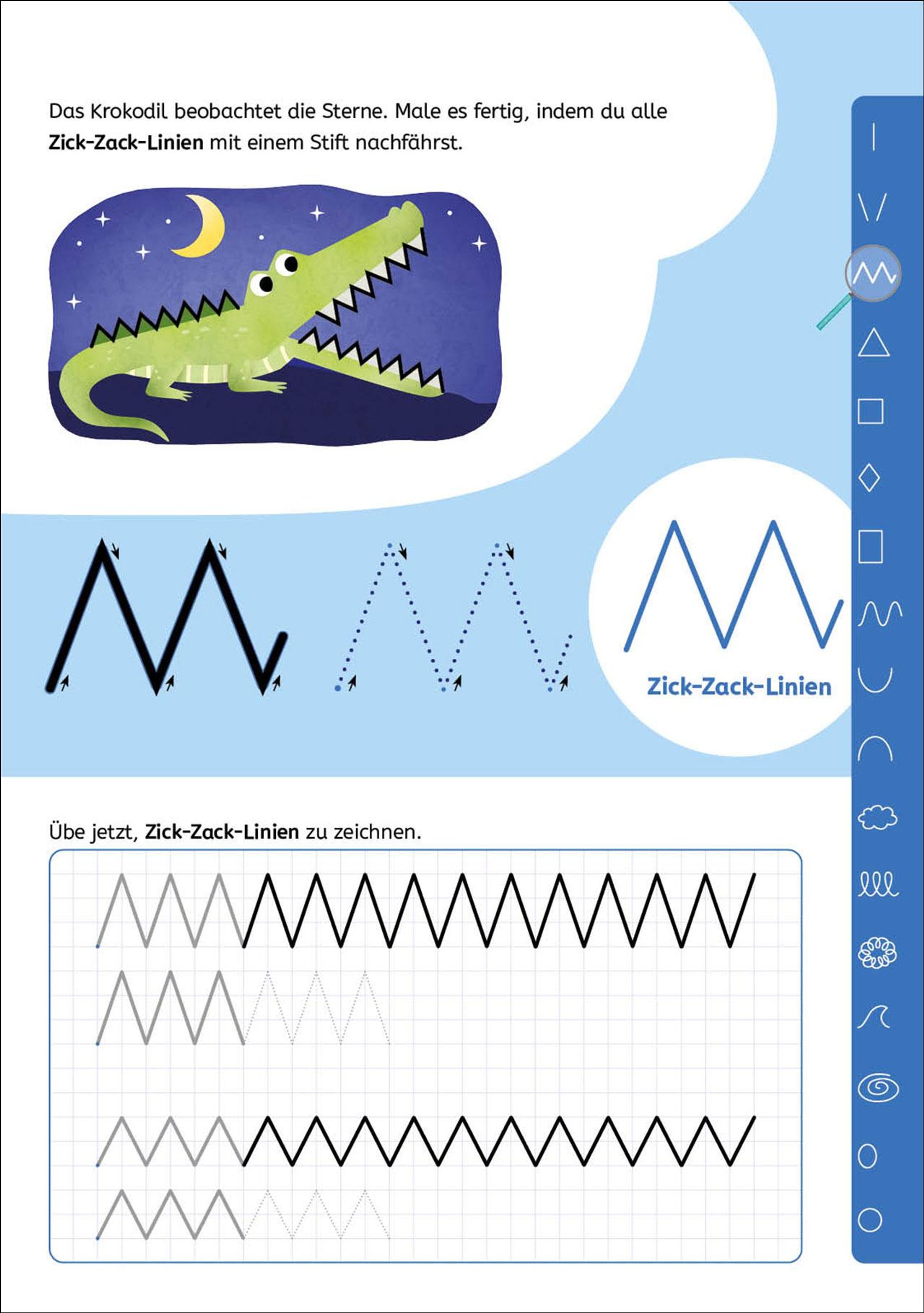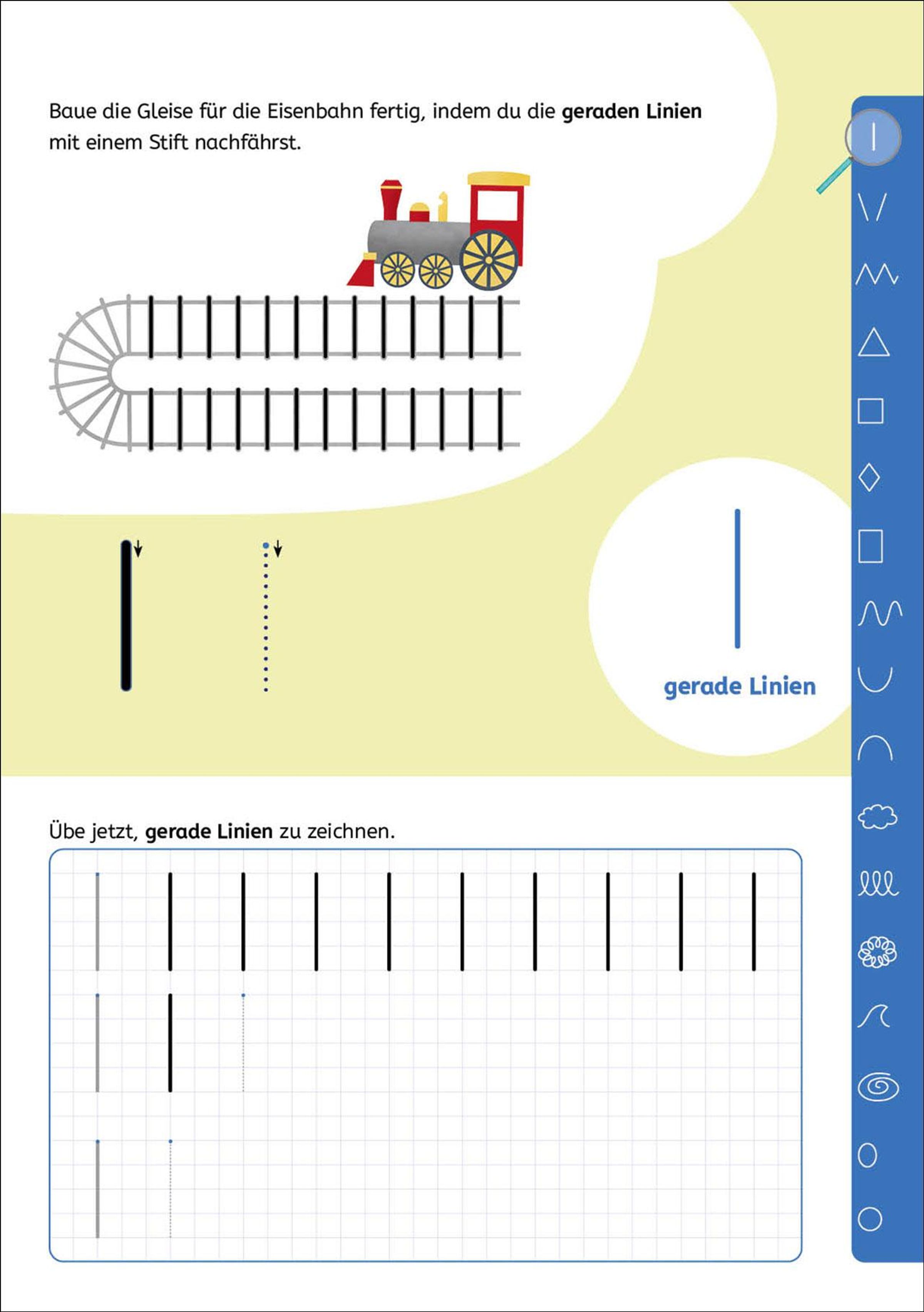 Mit Schwung zum Schreibprofi Mithilfe vorgeprägter Linien werden die ersten Schreibversuche zum Kinderspiel! Durch die Vertiefungen im Papier bleiben Kinder von Anfang an in der Spur, üben den Umgang mit dem Stift und trainieren so schon früh ein sauberes Schriftbild. Zusätzlich unterstützen abwechslungsreiche Übungen sie beim Einprägen der Formen.