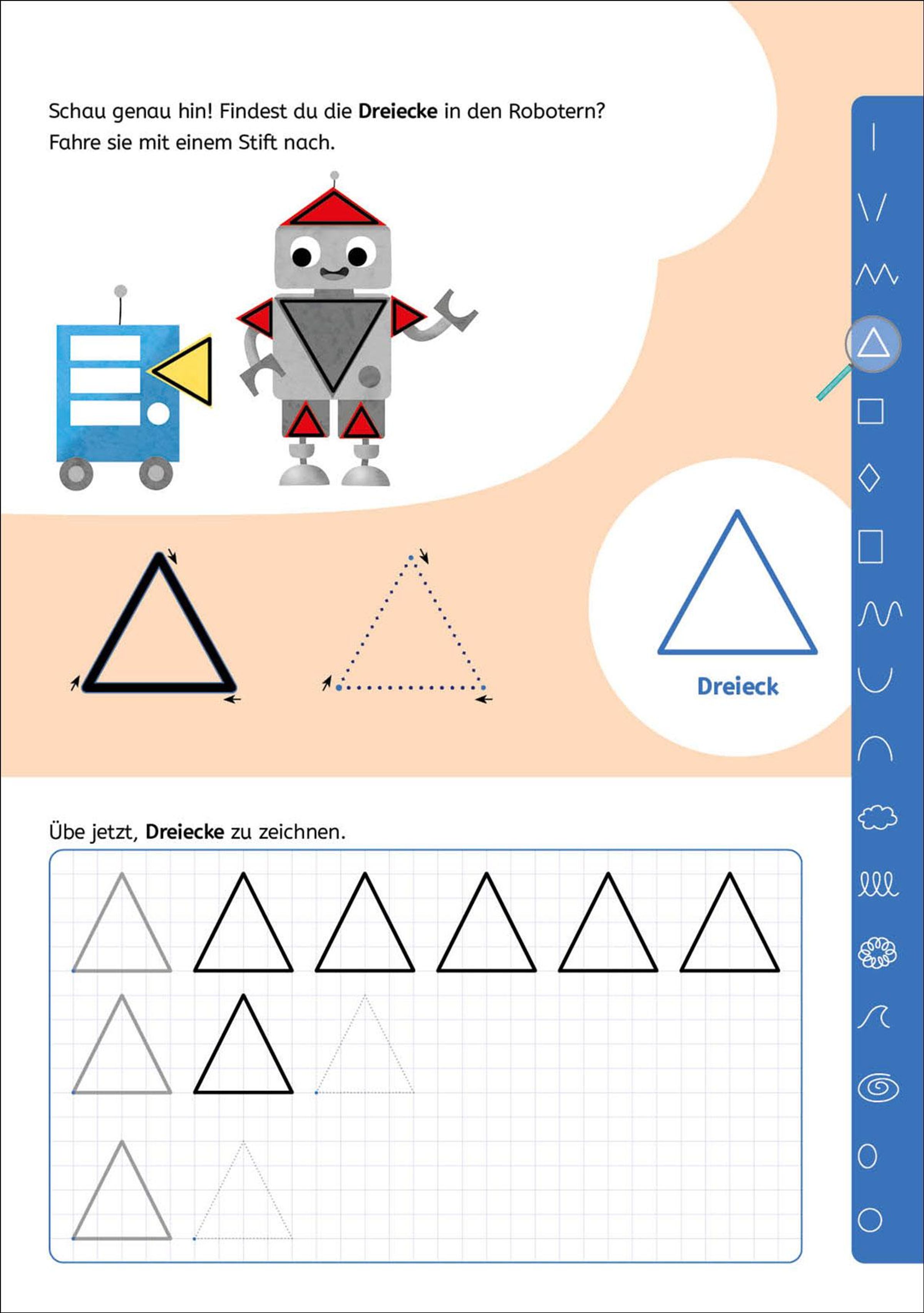 Dank der vorgeprägten Linien im Papier sind Schwungübungen und erste Schreibversuche so einfach wie noch nie! Die Spurrillen führen den Stift beim Nachfahren, sodass die Formen besser erfasst werden können. Bunte Aufgaben zu jeder Form helfen dabei, sie sich einzuprägen, und sorgen für mehr Spaß beim Lernen. Für Kinder ab 5 Jahren.