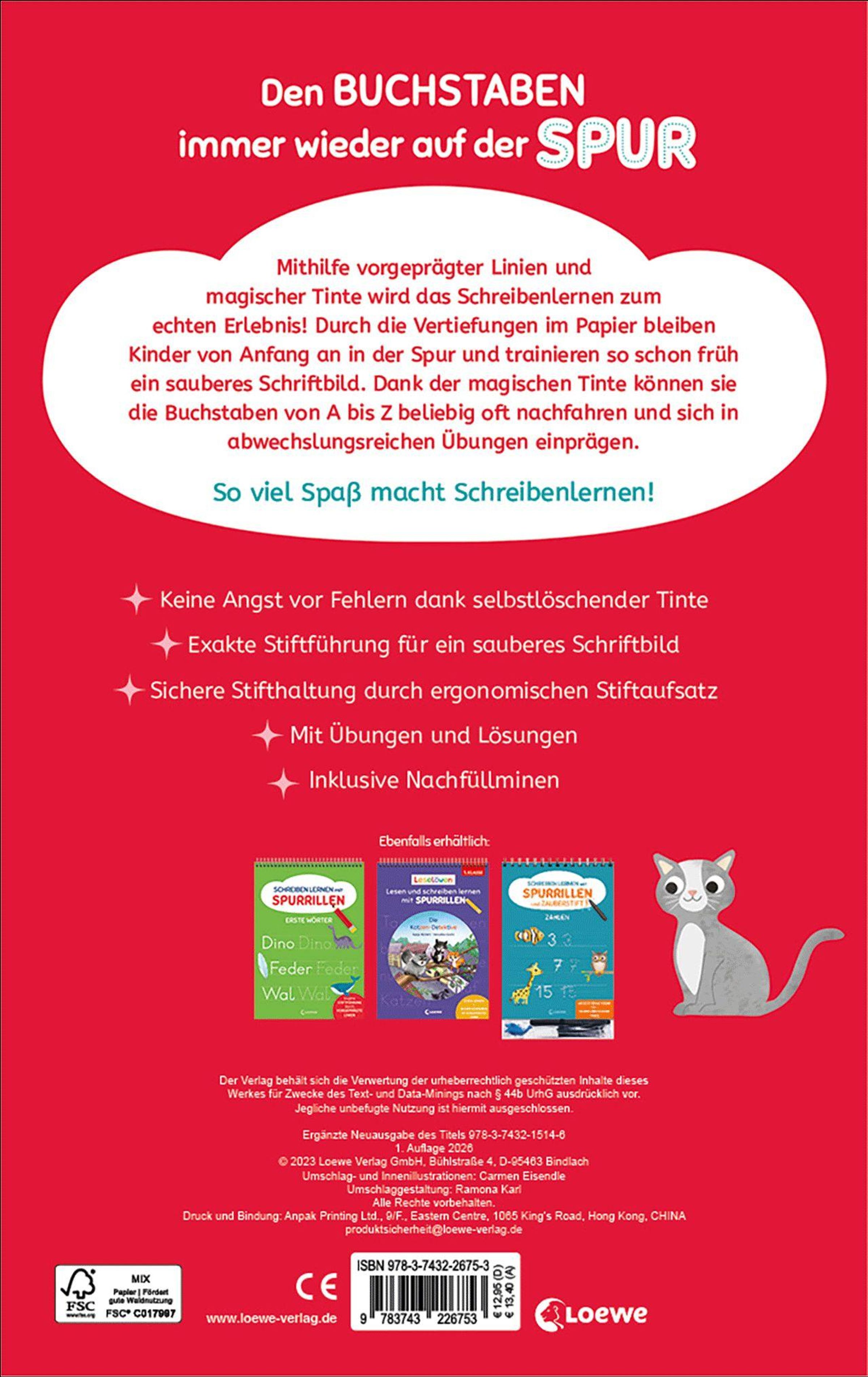 Den Buchstaben immer wieder auf der Spur Mithilfe vorgeprägter Linien und magischer Tinte wird das Schreibenlernen zum echten Erlebnis! Durch die Vertiefungen im Papier bleiben Kinder von Anfang an in der Spur und trainieren so schon früh ein sauberes Schriftbild. Dank der magischen Tinte können sie die Buchstaben von A bis Z beliebig oft nachfahren und sich in abwechslungsreichen Übungen einprägen.