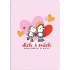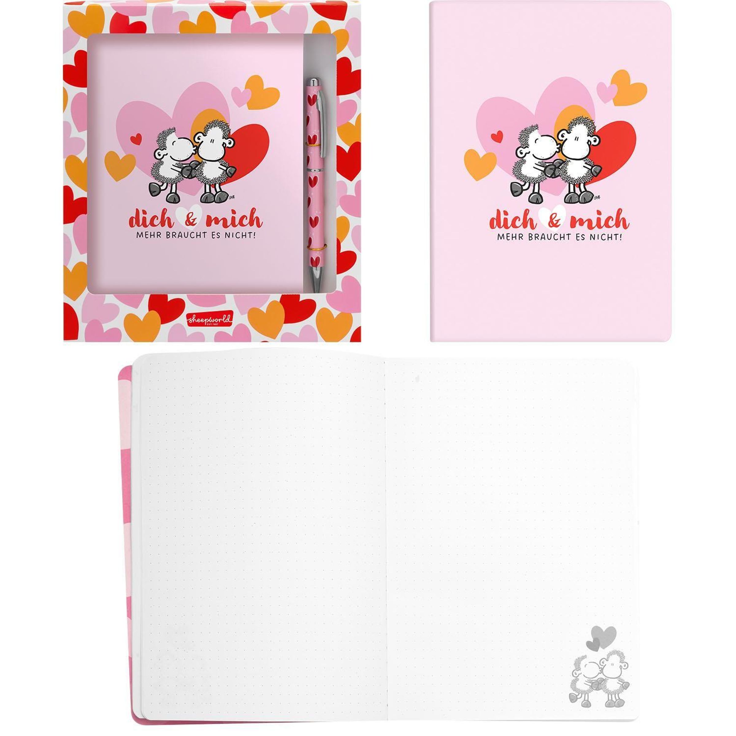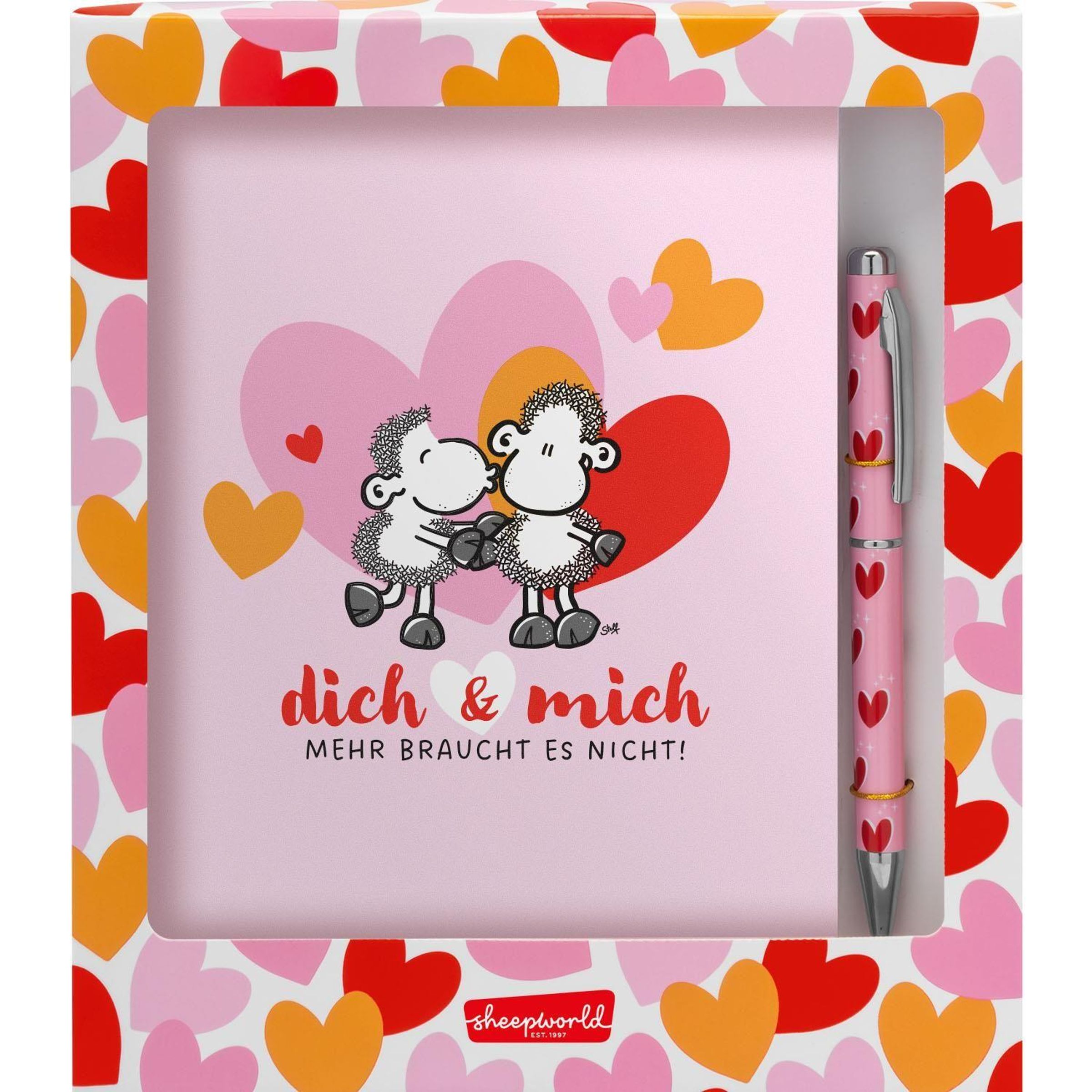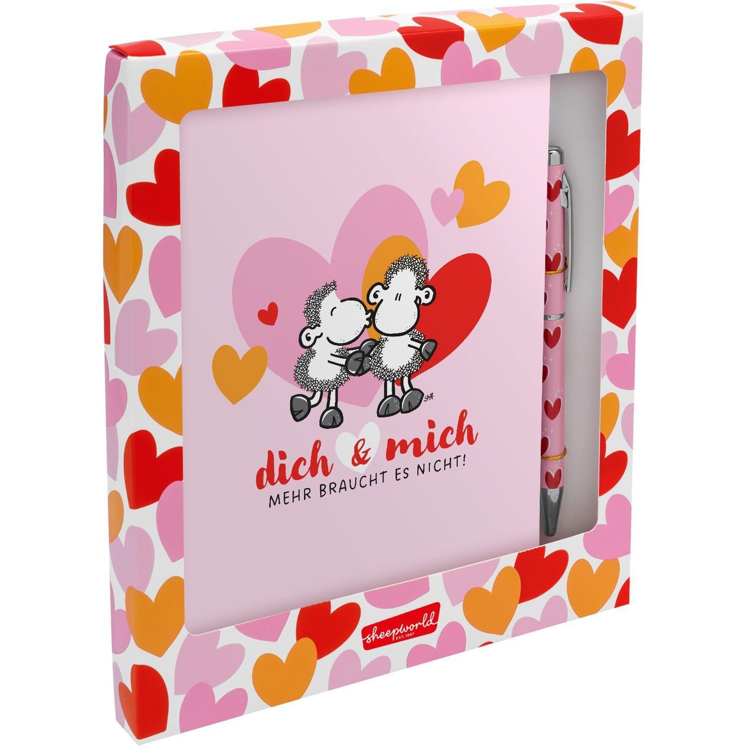 Schreibset bestehend aus einem Kugelschreiber mit Motivdruck: "Herzen", mit blauer, austauschbarer Mine, mit Drehmechanik, und einem Notizbuch mit Motivdruck: "dich & mich Mehr braucht es nicht", Größe DIN A5 mit 80 Seiten, in Geschenkbox,