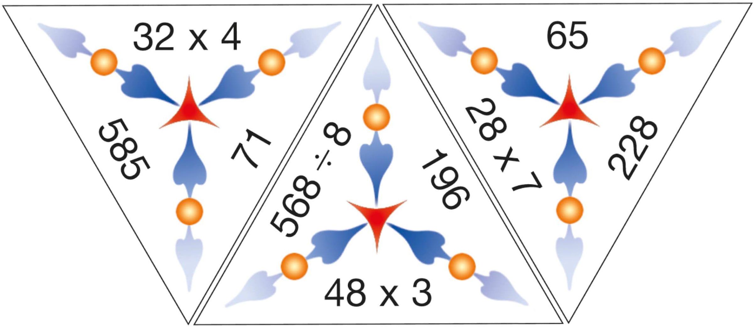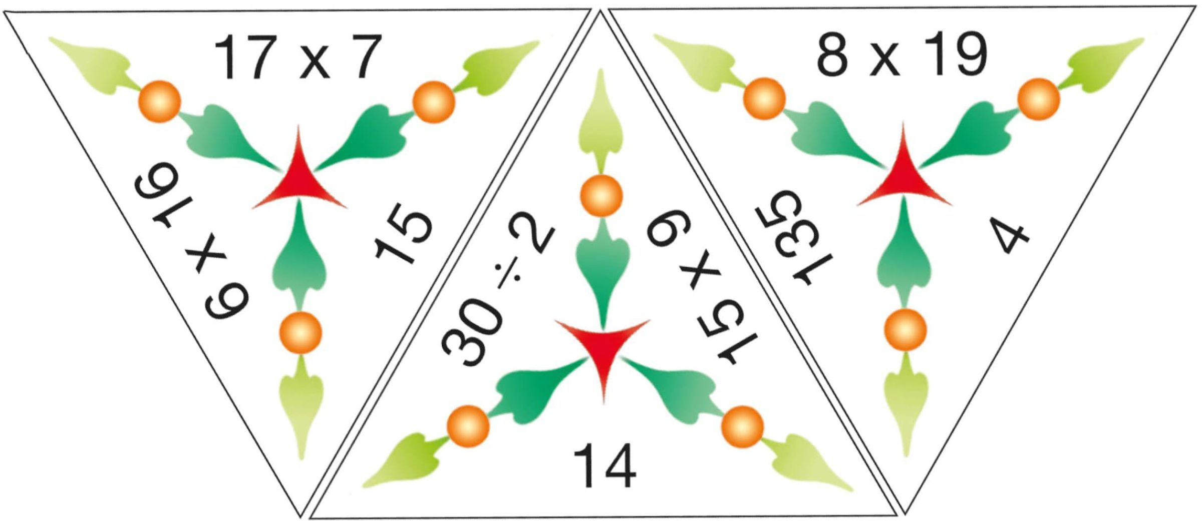 Doch aufgepasst: Es müssen immer alle drei Seiten der dreieckigen Spielkarten im Auge behalten werden! Die Dreiecke aus stabilem Karton werden so aneinandergelegt, dass Rechnung und Ergebnis zusammenpassen.