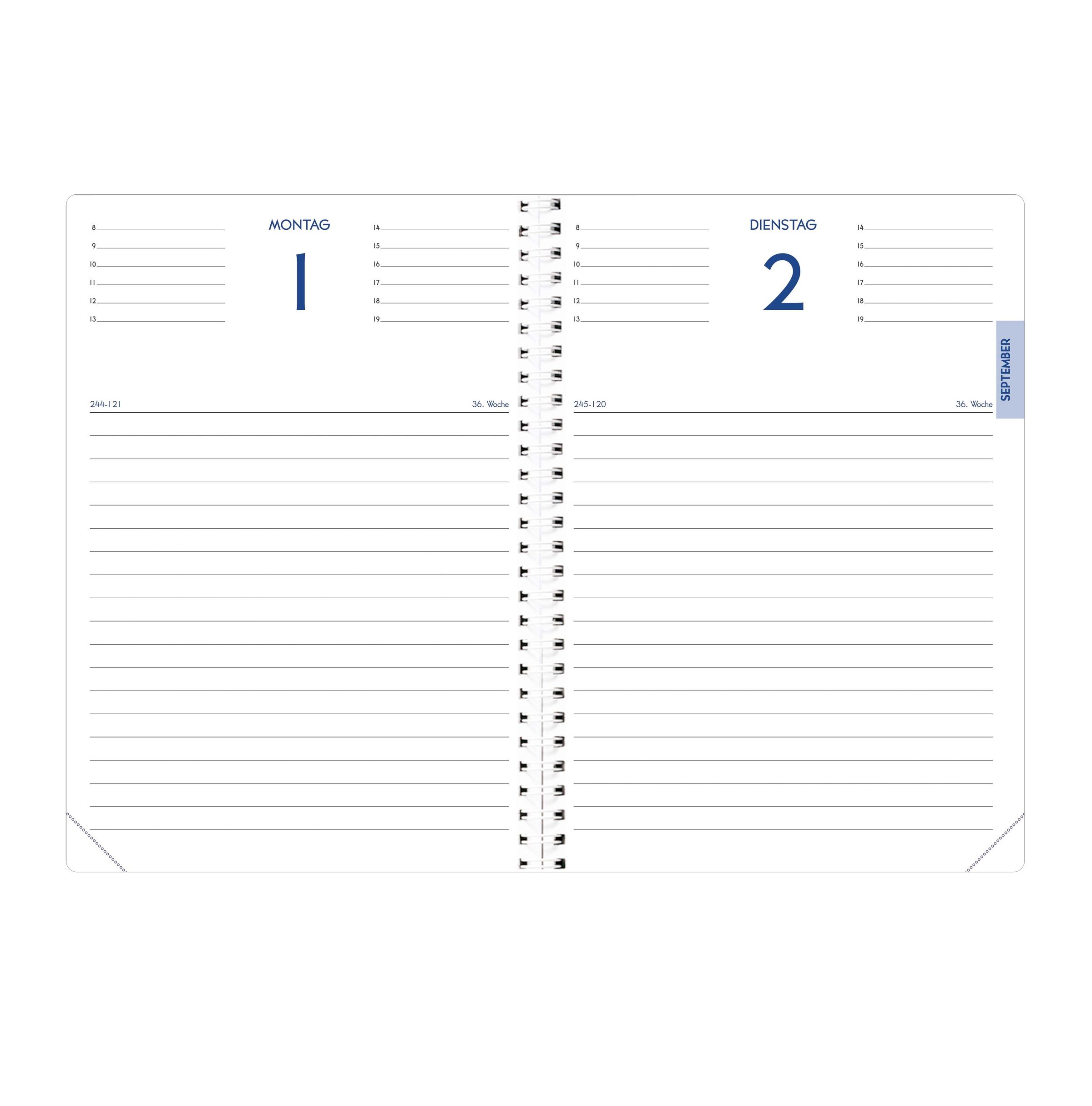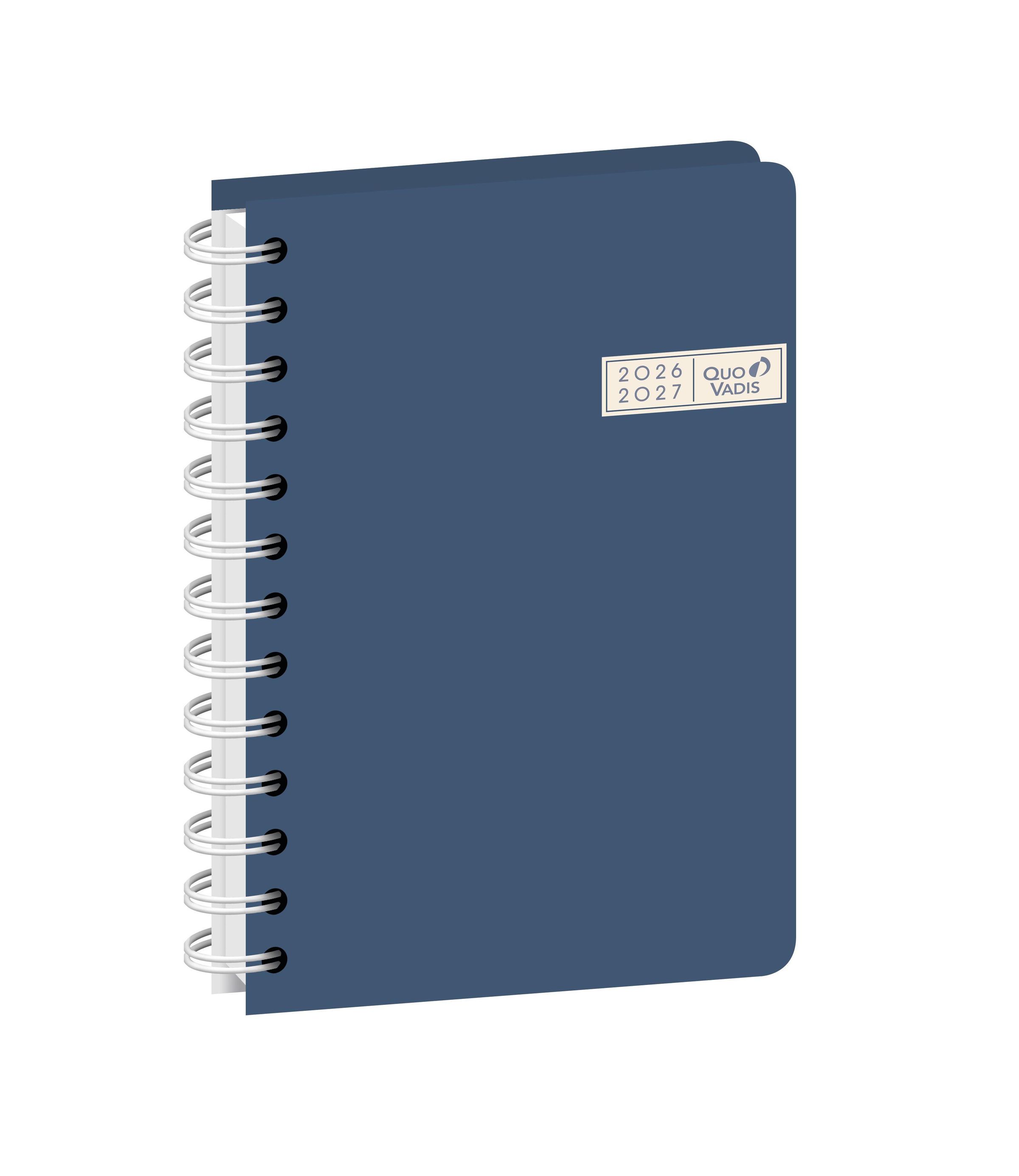 Text: "2026 2027 QUO VADIS". Eine Illustration eines dunkelblauen Spiralnotizbuches., Buch