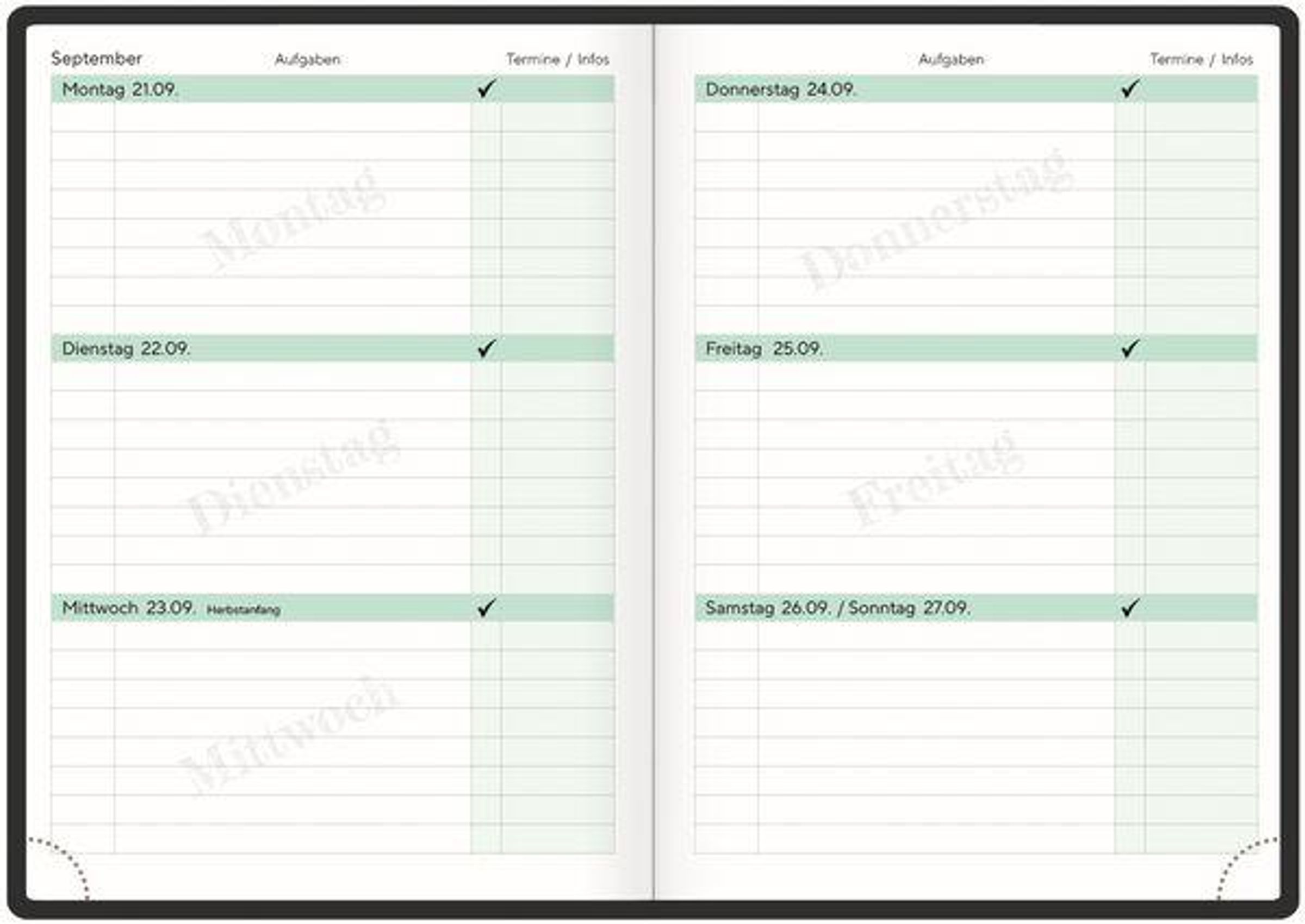 - Platz zum Eintragen der Fächer, To-dos, Termine und Infos sowie eine kleine Spalte zum Häkchensetzen