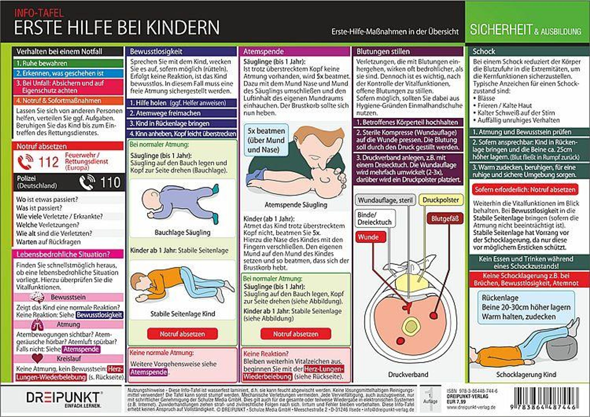 INFO-TAFEL: ERSTE HILFE BEI KINDERN. Verhalten bei einem Notfall: 1. Ruhe bewahren, 2. Erkennen, was geschehen ist., Buch
