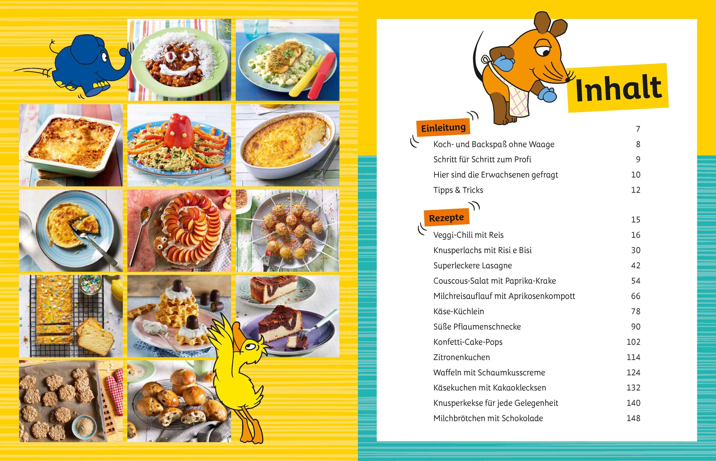 Die 5 bunten Becher sind zum Abmessen der Zutaten da. Die Kinder füllen Mehl, Zucker oder Milch einfach in den Becher und, schwupp, stehen die Mengen zum Kochen und Backen ganz ohne Abwiegen parat. Jeder Messbecher hat eine andere Größe und eine andere Farbe. So können die kleinen Bäcker sie ganz leicht auseinanderhalten. In den Zutatenlisten und bei den Zubereitungsschritten können die Kinder auf einen Blick sehen, welche Becher verwendet werden sollen. Die Maus, der Elefant und die Ente geben Tipps und freuen sich schon auf das gemeinsame Zubereiten der Speisen.