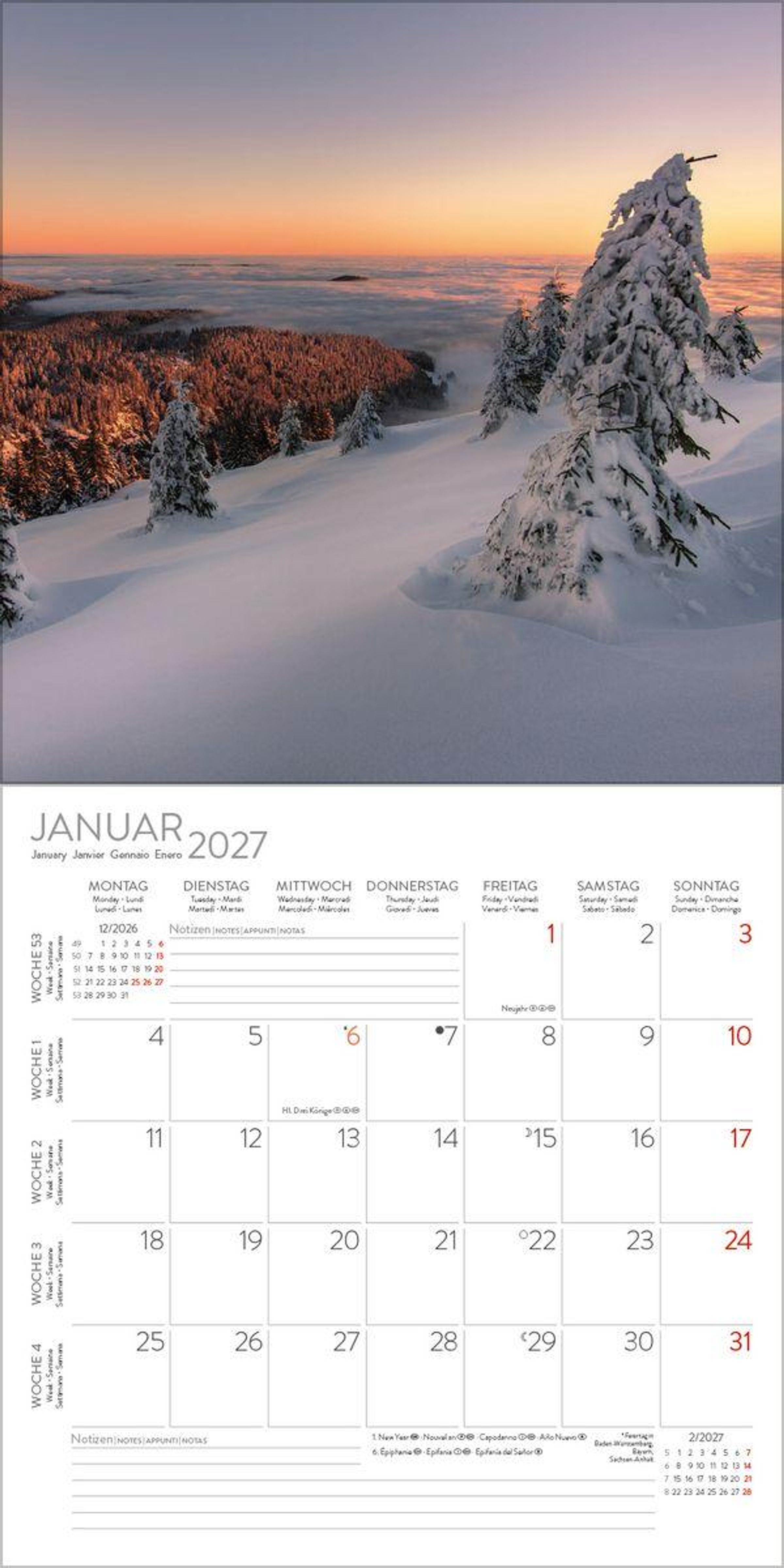 Format: 30 x 30 cm; Offen: 30 x 60 cm; umweltfreundliches FSC Papier Viel Platz im Kalendarium für Notizen und Termine Mehrsprachiges Kalendarium: D/GB/F/I/ES Regionale Ferienzeiten für DE/A/CH; Feiertage für D/A/CH/GB/F/I/ES Monatsübersicht für den Vor- und Nachmonat; Jahresübersicht