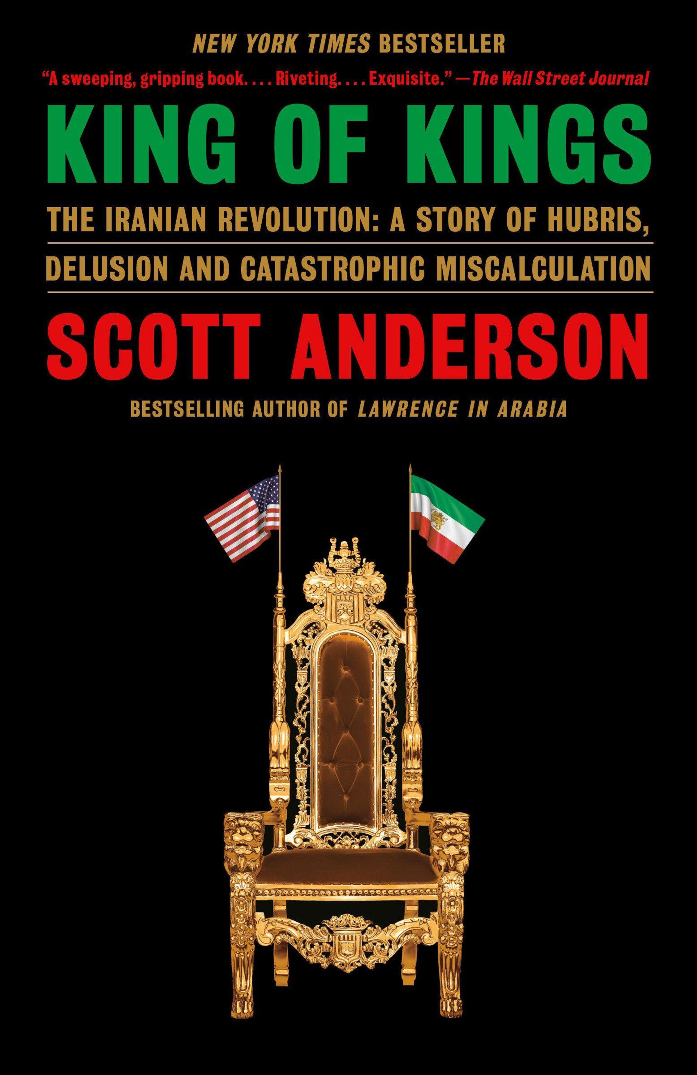 „King of Kings“ von Scott Anderson. Prunkvoller Thron mit US-amerikanischer und iranischer Flagge flankiert., Buch