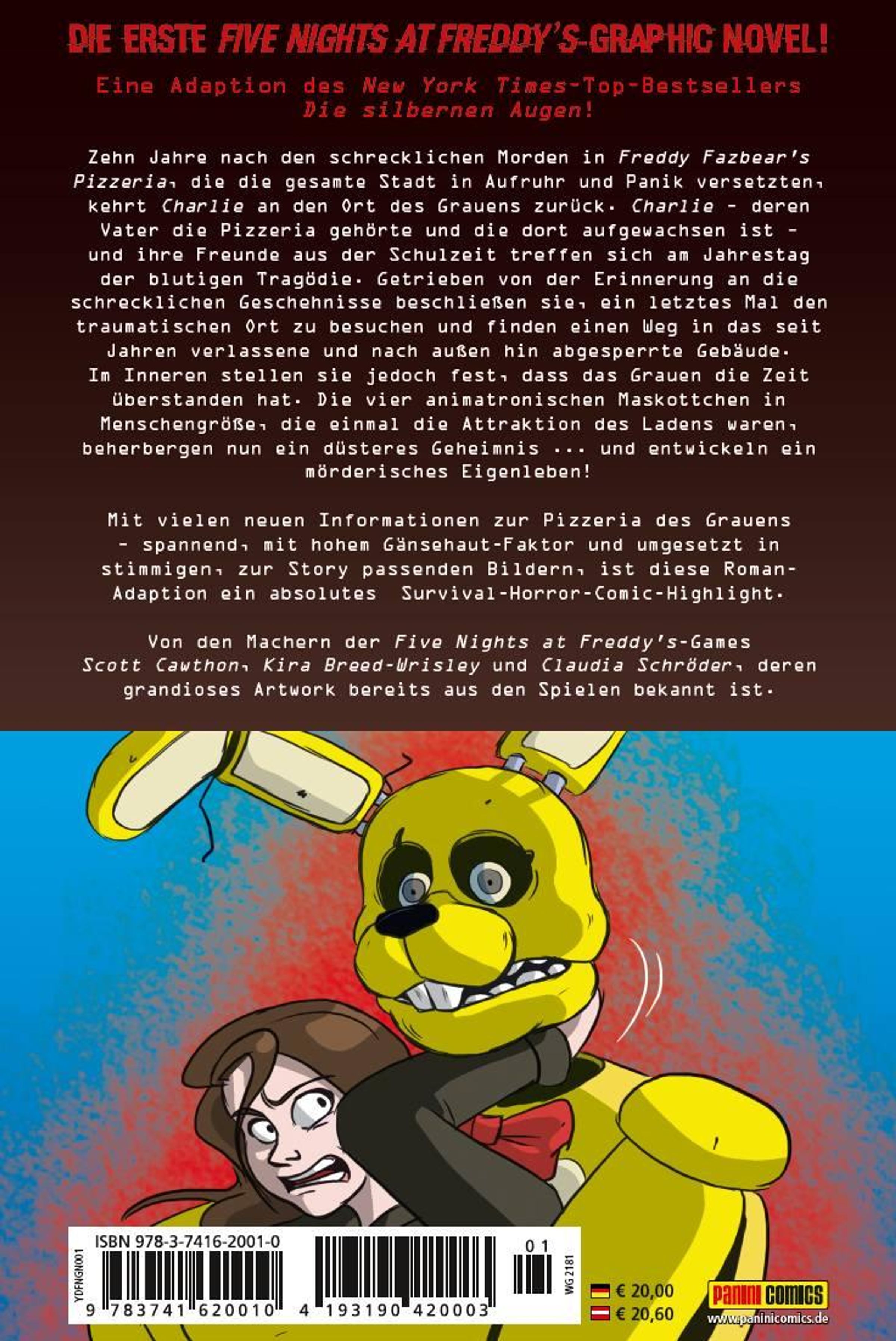 DIE ERSTE FIVE NIGHTS AT FREDDY'S-GRAPHIC NOVEL! Eine Adaption des New York Times-Top-Bestsellers Die silbernen Augen! Zehn Jahre nach den schrecklichen Morden in Freddy Fazbear's Pizzeria, die die gesamte Stadt in Aufruhr und Panik versetzten, kehrt Charlie an den Ort des Grauens zurück. Charlie - deren Vater die Pizzeria gehörte und die dort aufgewachsen ist - und ihre Freunde aus der Schulzeit treffen sich am Jahrestag der blutigen Tragödie. Getrieben von der Erinnerung an die schrecklichen Geschehnisse beschließen sie, ein letztes Mal den traumatischen Ort zu besuchen und finden einen Weg in das seit Jahren verlassene und nach außen hin abgesperrte Gebäude. Im Inneren stellen sie jedoch fest, dass das Grauen die Zeit überstanden hat. Die vier animatronischen Maskottchen in Menschengröße, die einmal die Attraktion des Ladens waren, beherbergen nun ein düsteres Geheimnis ... und entwickeln ein mörderisches Eigenleben!
