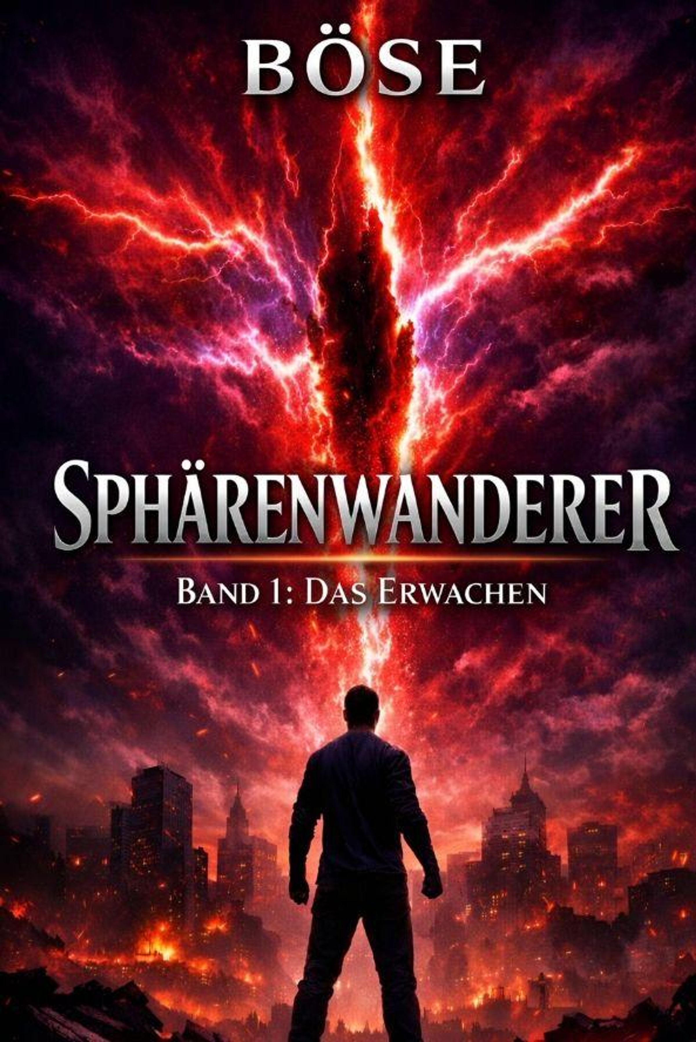"BÖSE. SPHÄRENWANDERER. Band 1: Das Erwachen." Ein Mann steht vor einem leuchtenden, roten Spalt am Himmel über einer Stadt., Buch