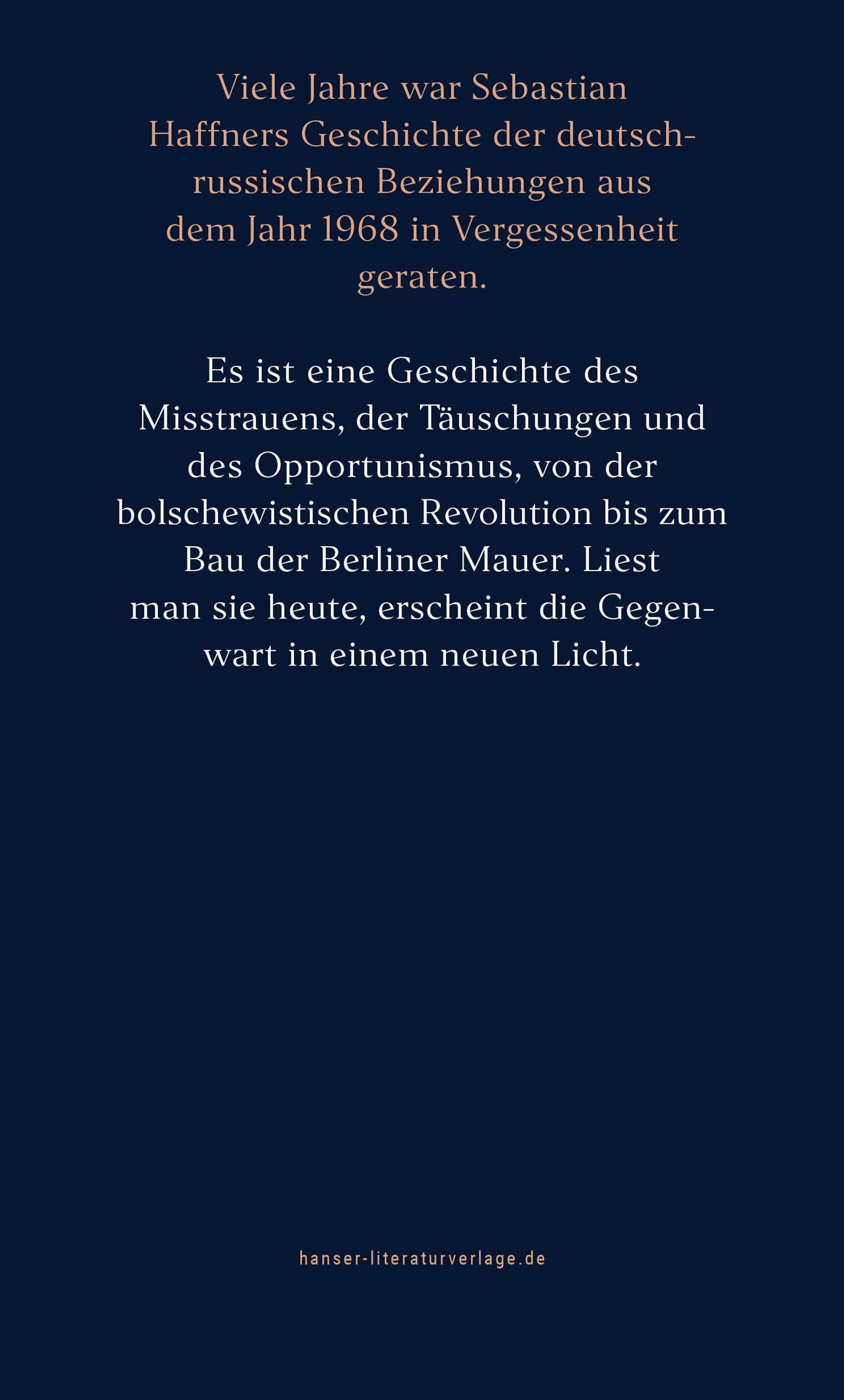 Aufregender als jeder Roman: So charakterisiert Sebastian Haffner die deutsch-russischen Beziehungen. In einem historischen Meisterwerk erzählt er eine verwickelte Geschichte voller Widersprüche, die mit der Unterstützung der bolschewistischen Revolution durch das kaiserliche Deutschland beginnt und 1961 mit dem Bau der Berliner Mauer endet. Wenn ein kurzfristiger Vorteil lockte, waren beide Seiten zu jeder Prinzipienlosigkeit bereit. Folgten die deutsch-russischen Beziehungen bis in die jüngste Zeit diesem Muster? In seinem ausführlichen Nachwort zeigt der große Osteuropa-Historiker Karl Schlögel, dass Haffners pointierte Einschätzungen auch heute noch gültig sind. 1968 zum ersten Mal erschienen, lange Jahre nur in einer verkürzten Ausgabe erhältlich, ist dieses Buch bis heute von beklemmender Aktualität.