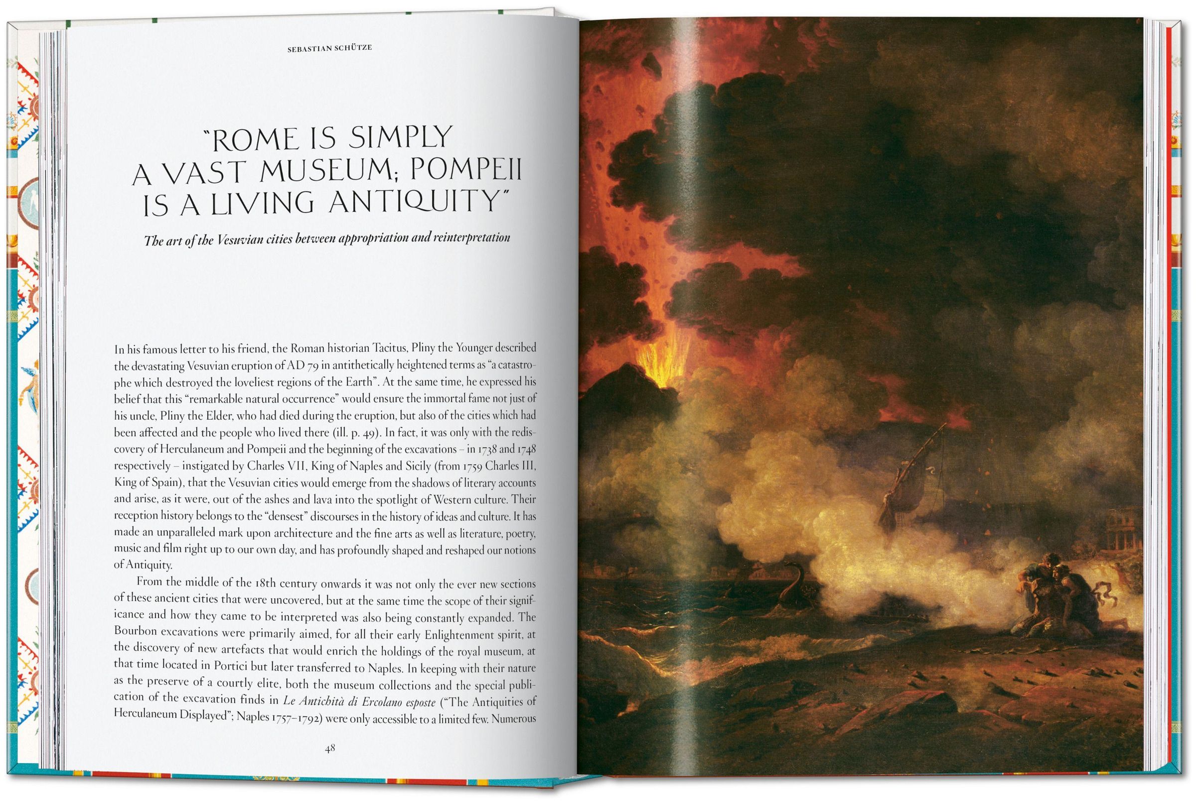 Zwei einleitende Essays führen uns die historischen Voraussetzungen und die Protagonisten der Ausgrabungsgeschichte vor Augen. Welche Wirkung die pompejanische Kunst und die unvergesslichen Gipsabdrücke menschlicher Überreste auf Werke der bildenden Kunst hatten, zeigen etwa Arbeiten von Robert Adam, Anton Raphael Mengs, Angelika Kaufmann, Jean-Auguste-Dominique Ingres, Lawrence Alma-Tadema, Pablo Picasso, Giorgio de Chirico bis hin zu Duane Hanson und George Segal.