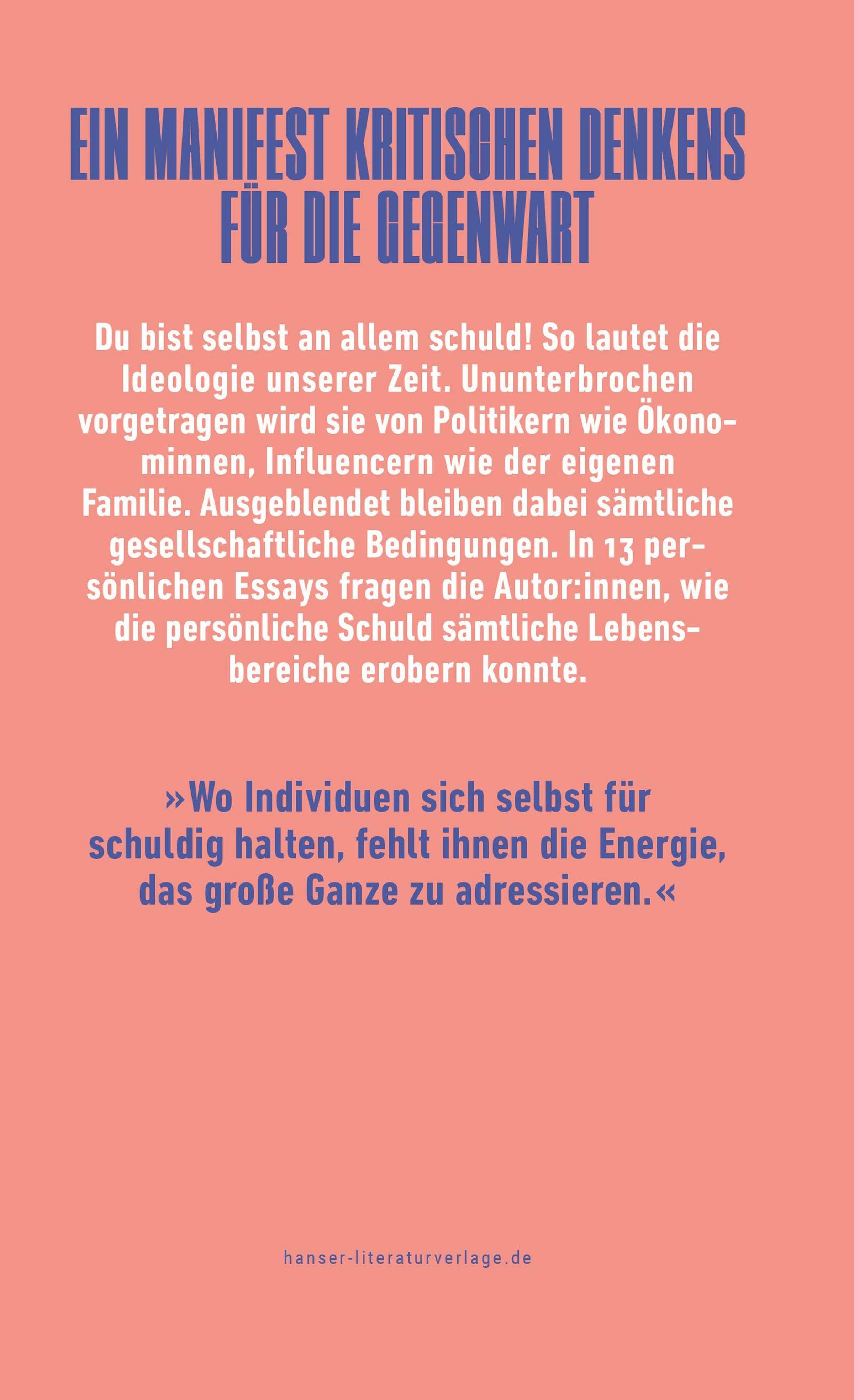 Du bist überfordert, weil du deine Zeit nicht richtig planst. Du verdienst nicht genug Geld, weil du nicht hart genug arbeitest. Du bist verantwortlich für die Klimakatastrophe, weil du die Joghurtbecher nicht richtig entsorgst. Kurzum: Du bist selbst an allem schuld! So lautet die Ideologie unserer Zeit. Vorgetragen wird sie von Politikern wie Ökonominnen, Influencern wie der eigenen Familie. Ausgeblendet werden dabei sämtliche gesellschaftlichen Bedingungen. In 15 persönlichen Essays fragen die Autor: innen, wie die persönliche Schuld sämtliche Lebensbereiche erobern konnte. Ihr Buch leistet sich den Luxus des Zweifels am scheinbar Selbstverständlichen. Es ist ein Manifest kritischen Denkens für die Gegenwart.