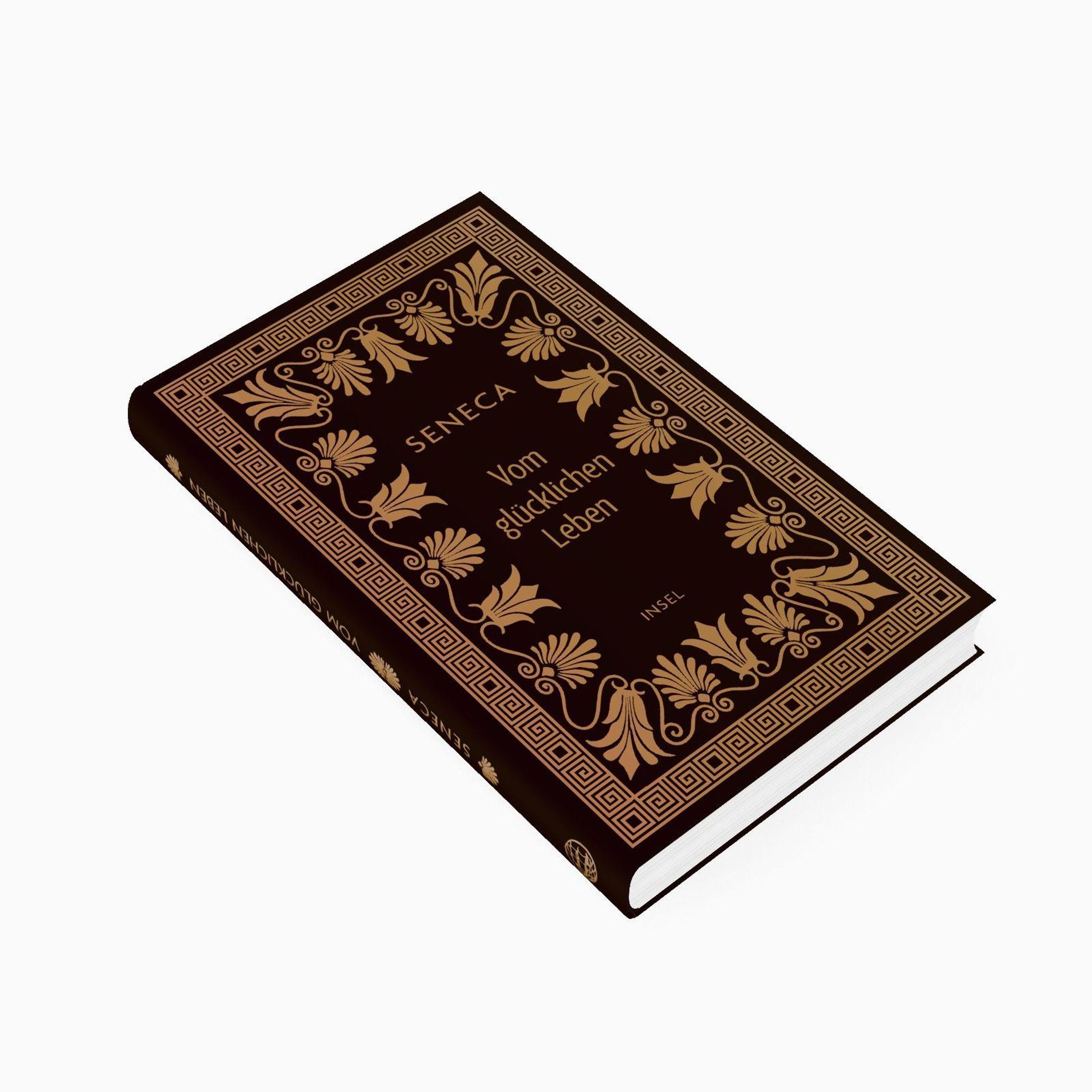 "Seneca, Vom glücklichen Leben, Insel" in goldener Schrift, umrahmt von einem dekorativen griechischen Muster., Buch