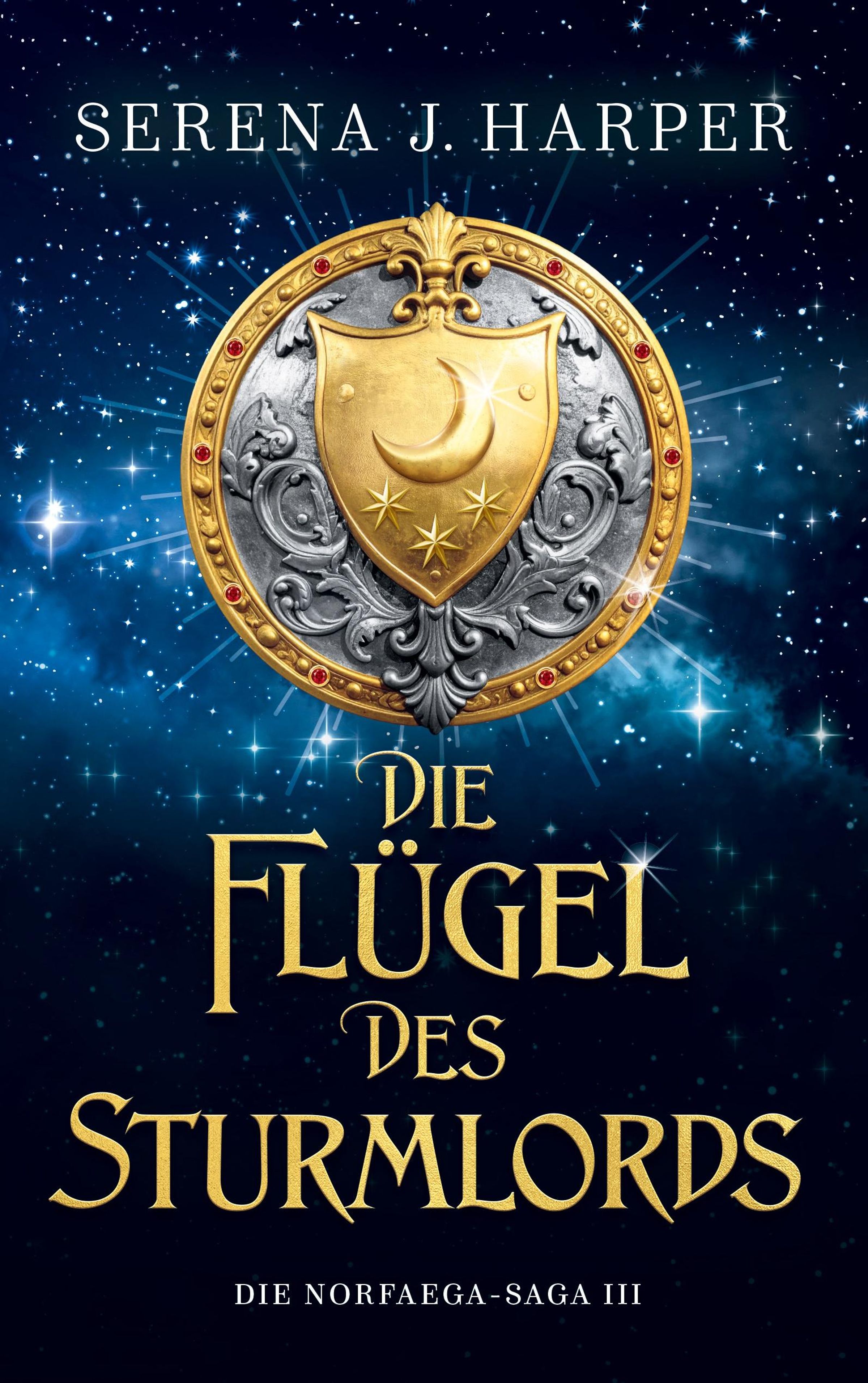 "SERENA J. HARPER. DIE FLÜGEL DES STURMLORDS. DIE NORFAEGA-SAGA III." Ein Wappen mit Mondsichel und Sternen auf Nachthimmel., Buch