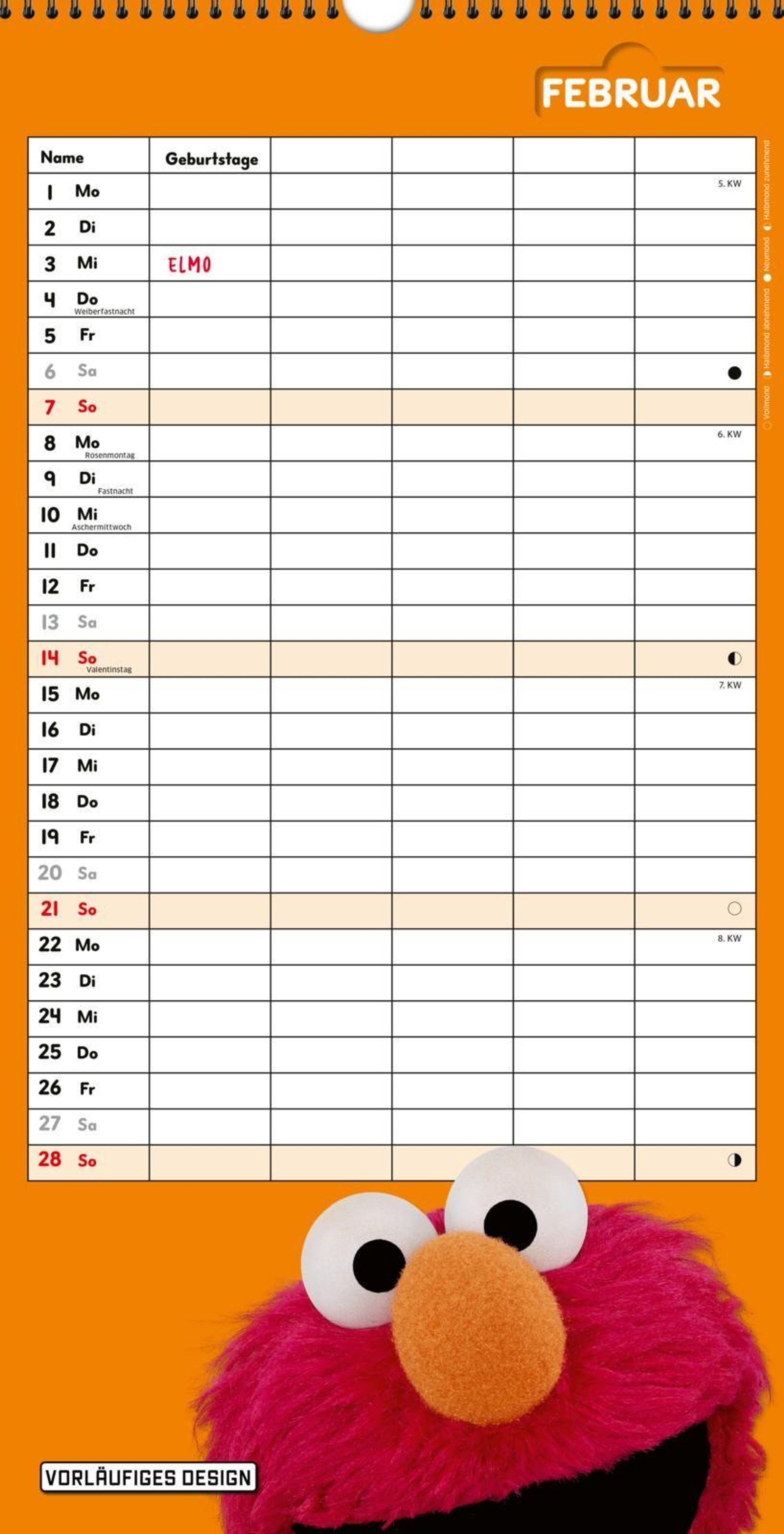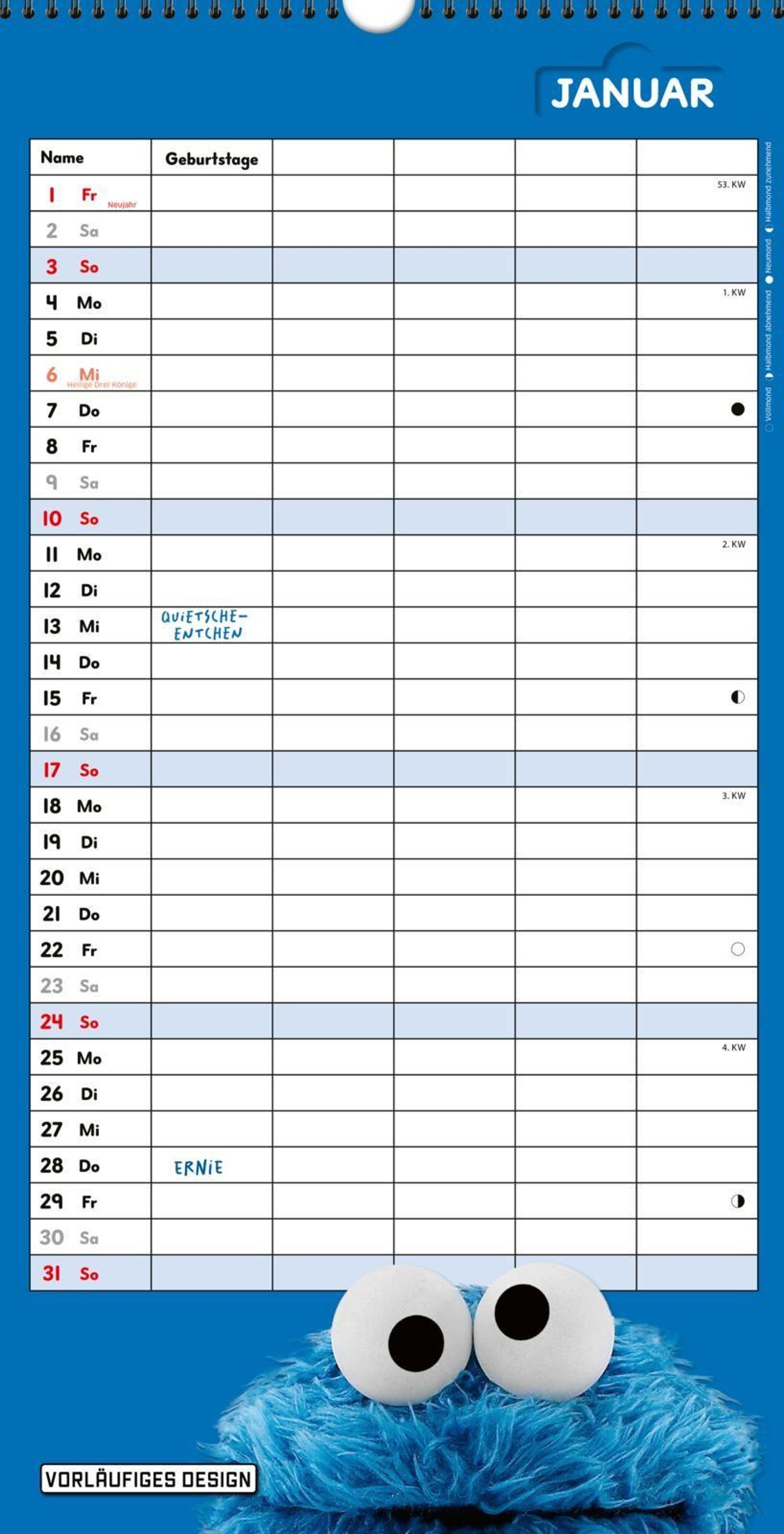 „Sesamstraße Familienplaner 2027“ in bunten Streifen. Charaktere wie Oscar, Ernie, Bert und das Krümelmonster sind abgebildet., Kalender