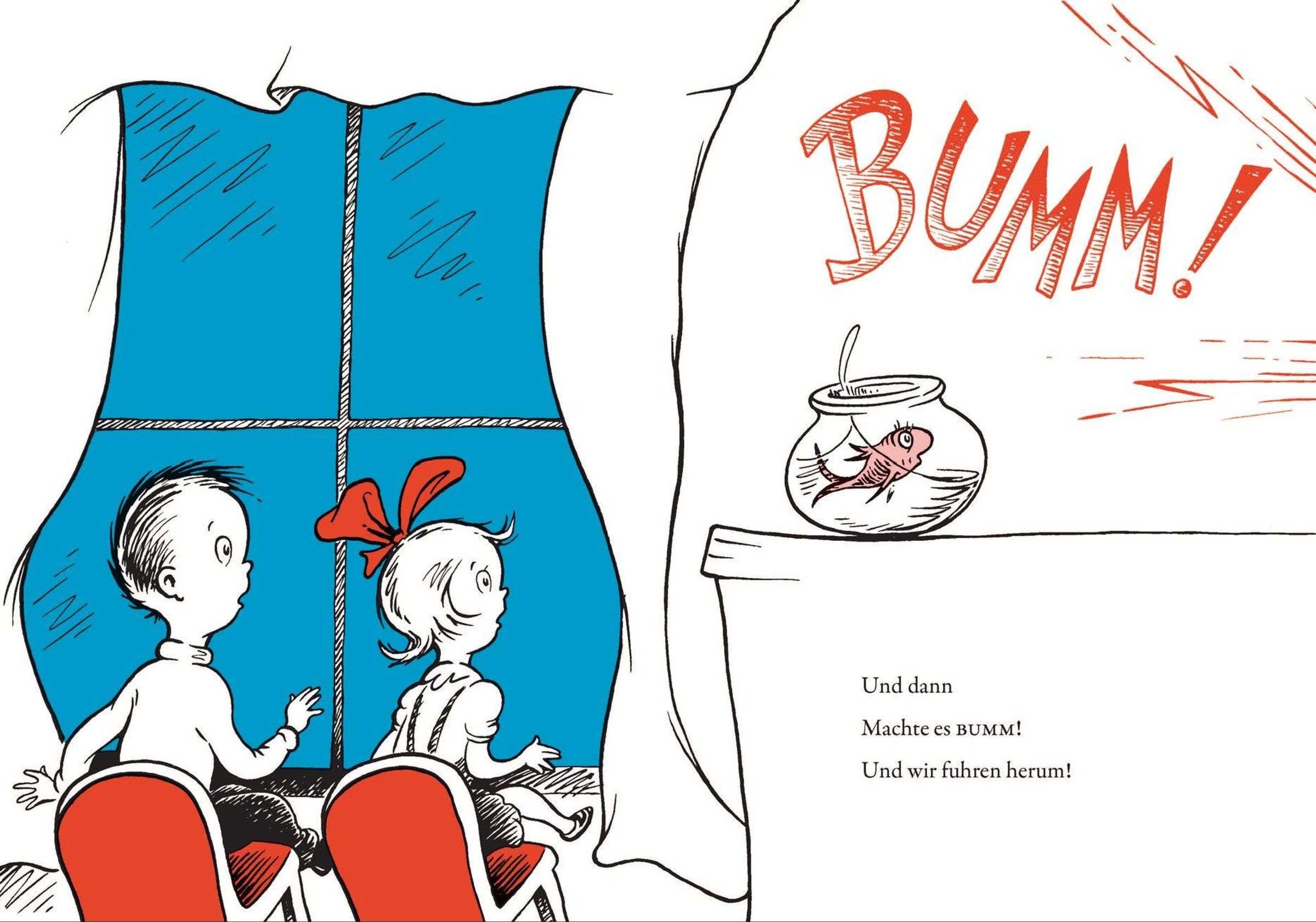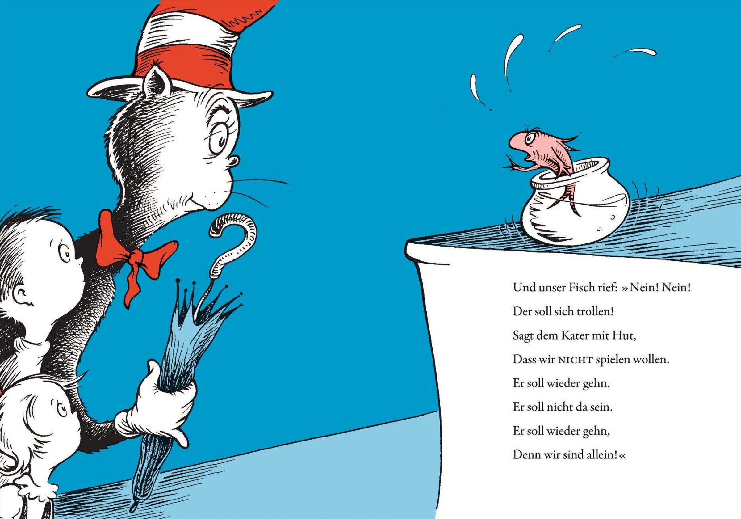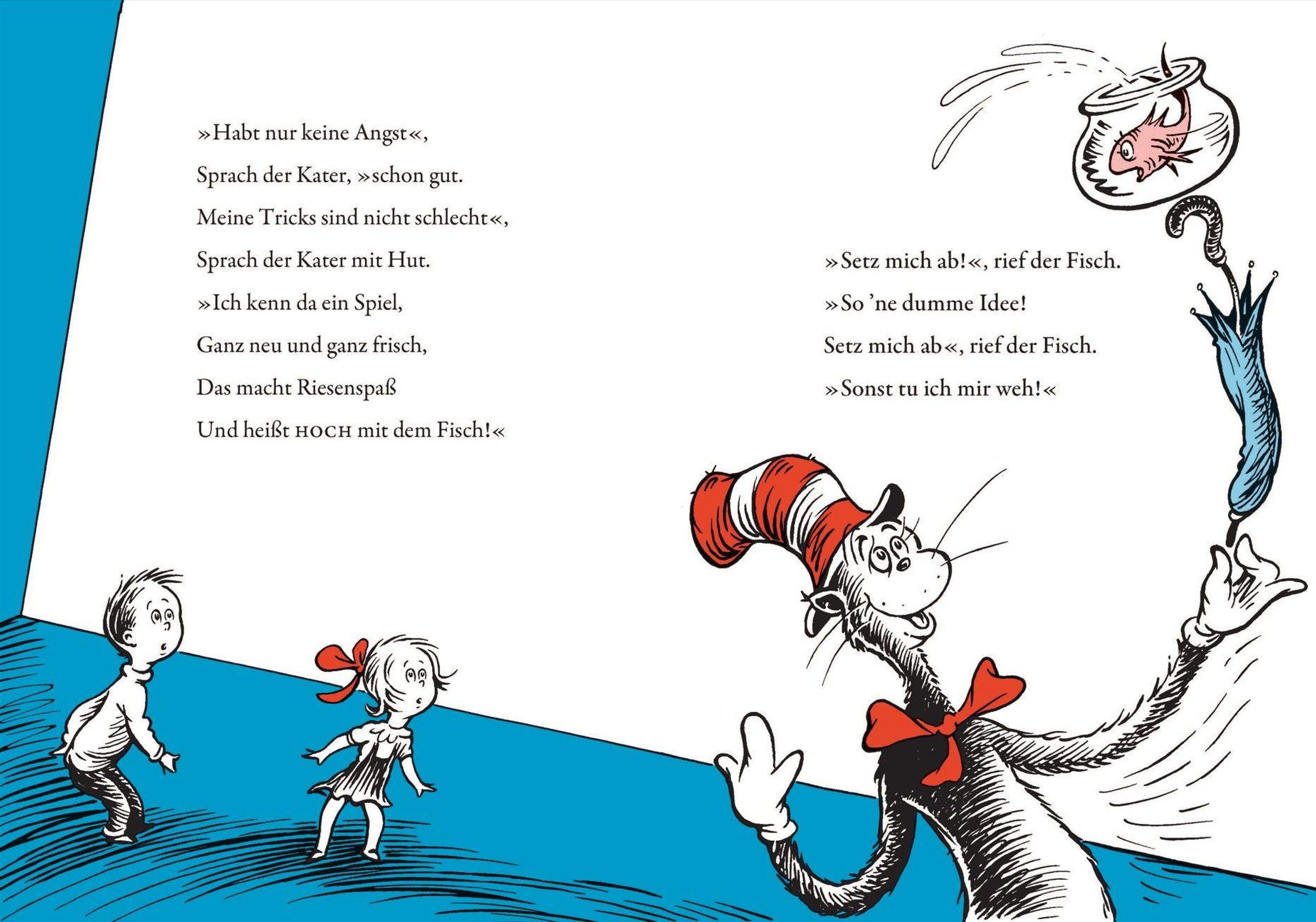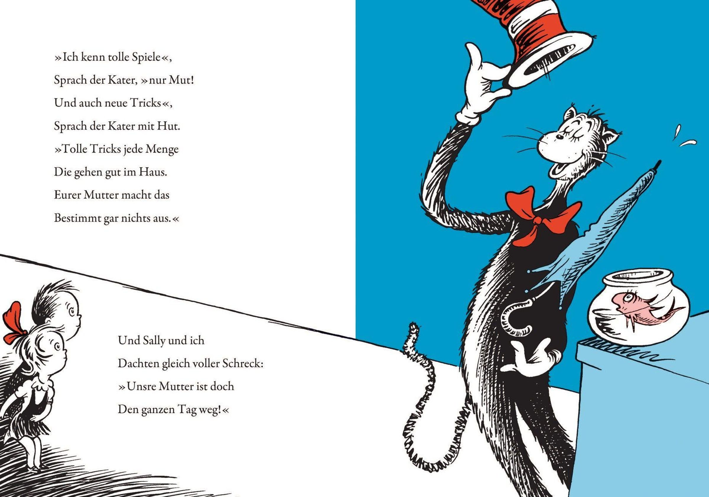 'Und dann machte es BUMM' und der Kater mit Hut platzt bei Sally und ihrem Bruder zur Tür hinein. Die beiden hatten sich schon auf einen öden Regentag allein zu Hause eingerichtet, doch der Kater hat jede Menge anarchische Ideen gegen Langeweile. Er prahlt, balanciert und tänzelt, er jongliert Rechen und Fächer, Torte und Tasse, Milch und Schiff. Der Kater stellt die Bude im Nullkommanix auf den Kopf, nichts als 'Krach und Krawall, Geklirr und Geknall'. Das macht Spaß, aber auch Angst: Was wird bloß die Mutter sagen, wenn sie nach Hause kommt? Aber da der Kater mit Hut im Grunde seines Herzens liebenswert ist, hilfsbereit und höflich, bringt er die Welt rechtzeitig wieder in Ordnung ... 'Der Kater mit Hut' ist neben dem 'Grinch' das erfolgreichste Bilderbuch der amerikanischen Kinderbuch-Legende Dr. Seuss. Anlässlich des großen Kinofilms, der am 6. November 2026 in die Kinos kommen wird, erscheint das lang vergriffene, von Eike Schönfeld exzellent übersetzte Buch in einer hochwertigen Neuausgabe.