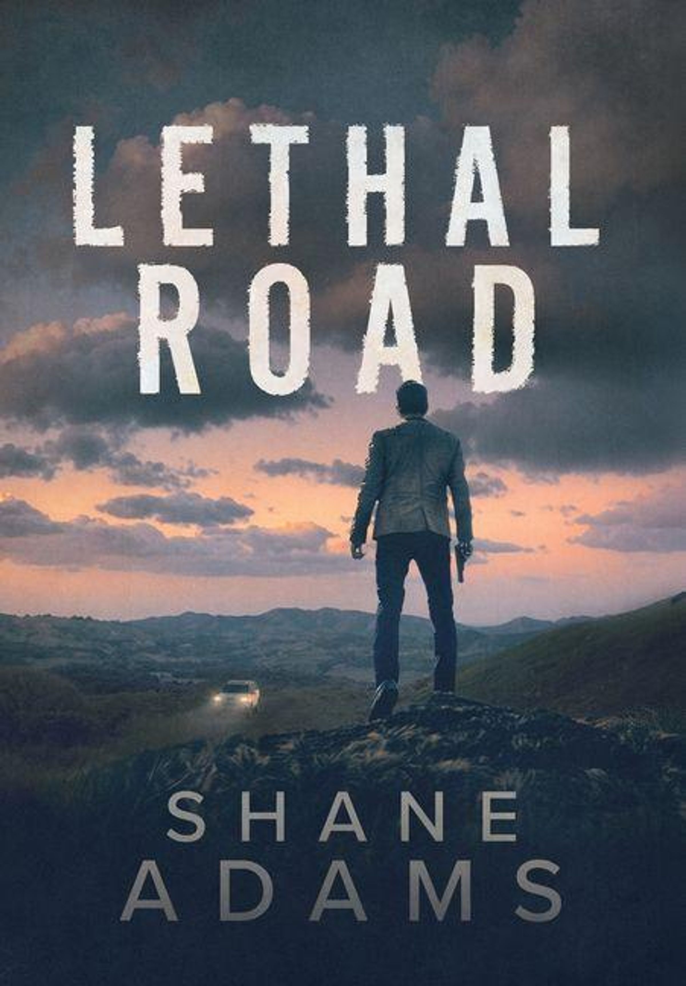 „LETHAL ROAD“ oben, „SHANE ADAMS“ unten. Eine Person steht vor einer dramatischen Landschaft, gegen Abendhimmel., Buch