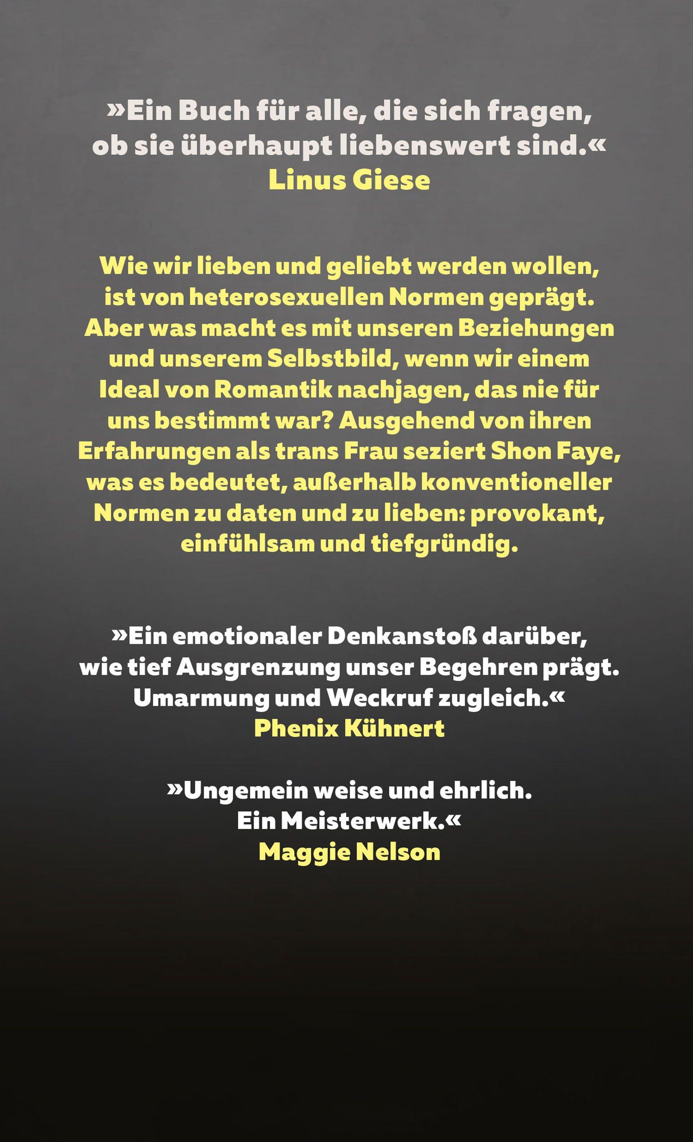 Den Großteil ihres Lebens verbrachte Shon Faye in der stillen Überzeugung, dass sie es nicht verdient, geliebt zu werden. Was macht es mit einer Person, Abhängigkeit mit Liebe zu verwechseln, wenn der eigene Körper objektifiziert und entwertet wird? Oder wenn der Partner sich trennt, weil man keine biologischen Kinder bekommen kann? Als queere Transfrau weiß Faye schon immer, dass das Private auch politisch ist, und seziert in ihrem provokanten, zutiefst persönlichen Buch unsere moderne Gesellschaft. Wie lieben wir eigentlich - und wer sind wir, wenn wir uns in diesem übermächtigen Gefühl verlieren?