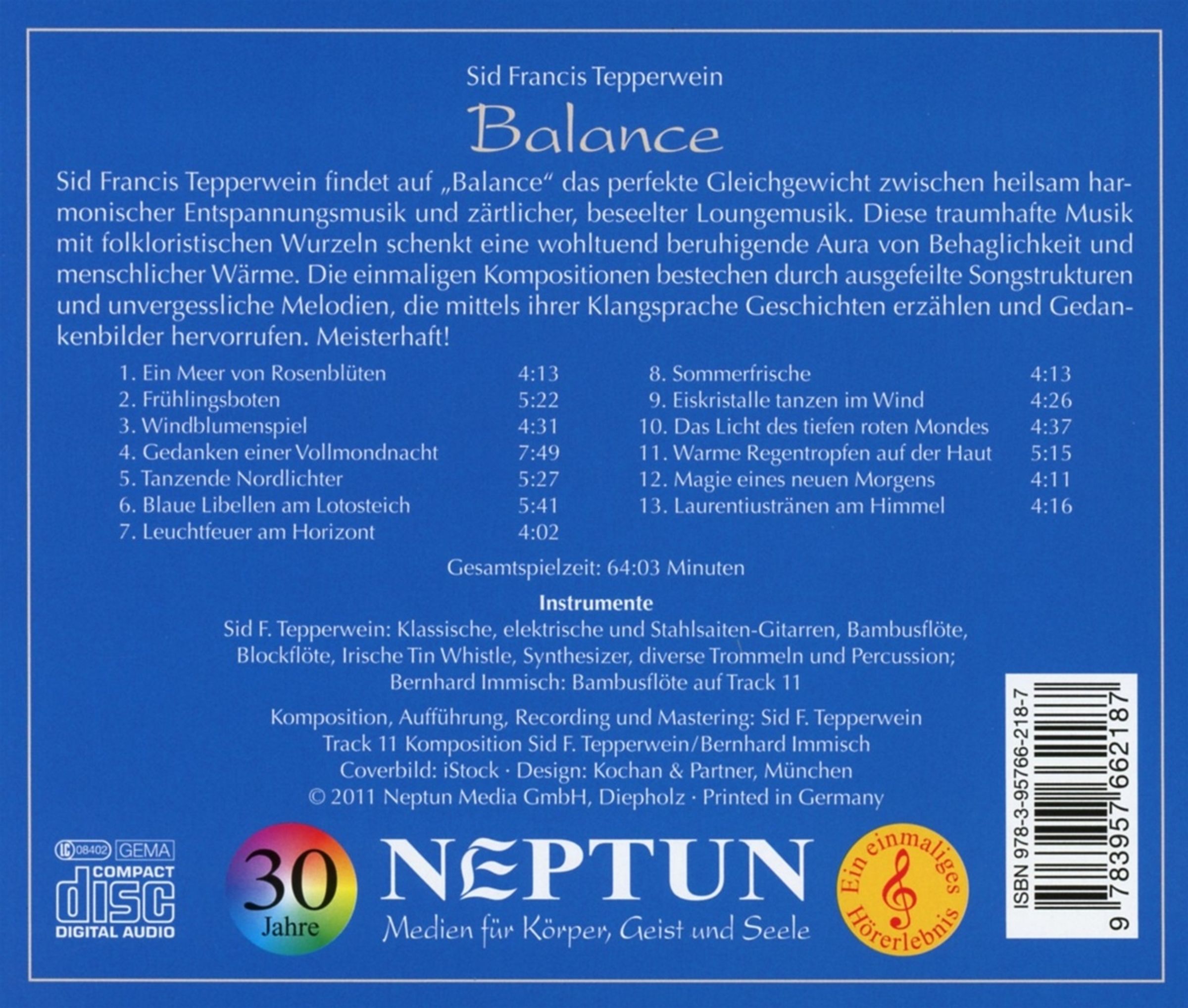 Sid Francis Tepperwein findet auf "Balance" das perfekte Gleichgewicht zwischen heilsam harmonischer Entspannungsmusik und zärtlicher, beseelter Loungemusik. Diese traumhafte Musik mit folkloristischen Wurzeln schenkt eine wohltuend beruhigende Aura von Behaglichkeit und menschlicher Wärme. Die einmaligen Kompositionen bestechen durch ausgefeilte Songstrukturen und unvergessliche Melodien, die mittels ihrer Klangsprache Geschichten erzählen und Gedankenbilder hervorrufen. Meisterhaft!