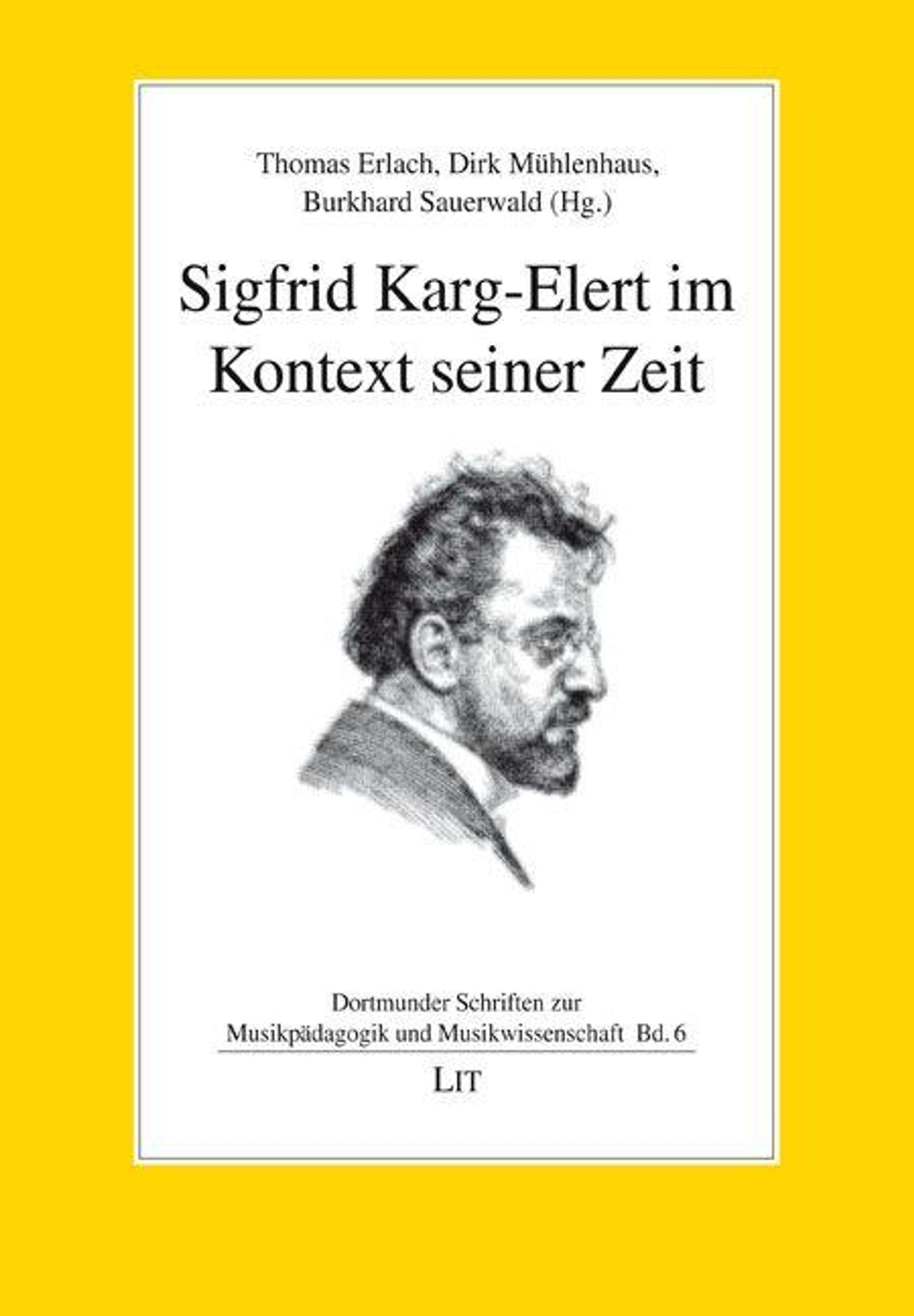 „Sigfrid Karg-Elert im Kontext seiner Zeit“ über einer Zeichnung eines Mannes. Unten: "Dortmunder Schriften", "LIT"., Buch
