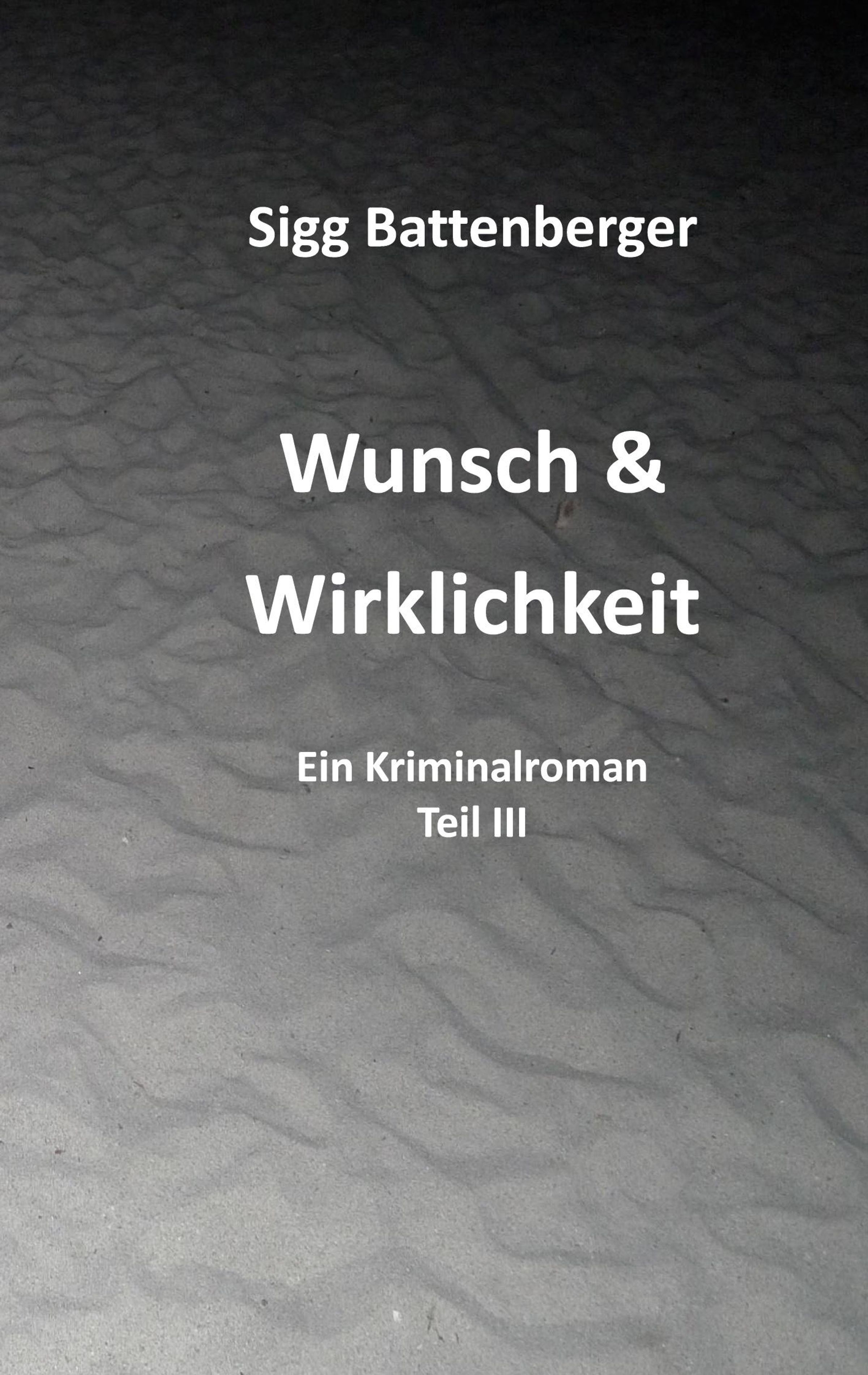 Text: "Sigg Battenberger - Wunsch & Wirklichkeit - Ein Kriminalroman Teil III." Dünenähnlicher, grauer Hintergrund., Buch