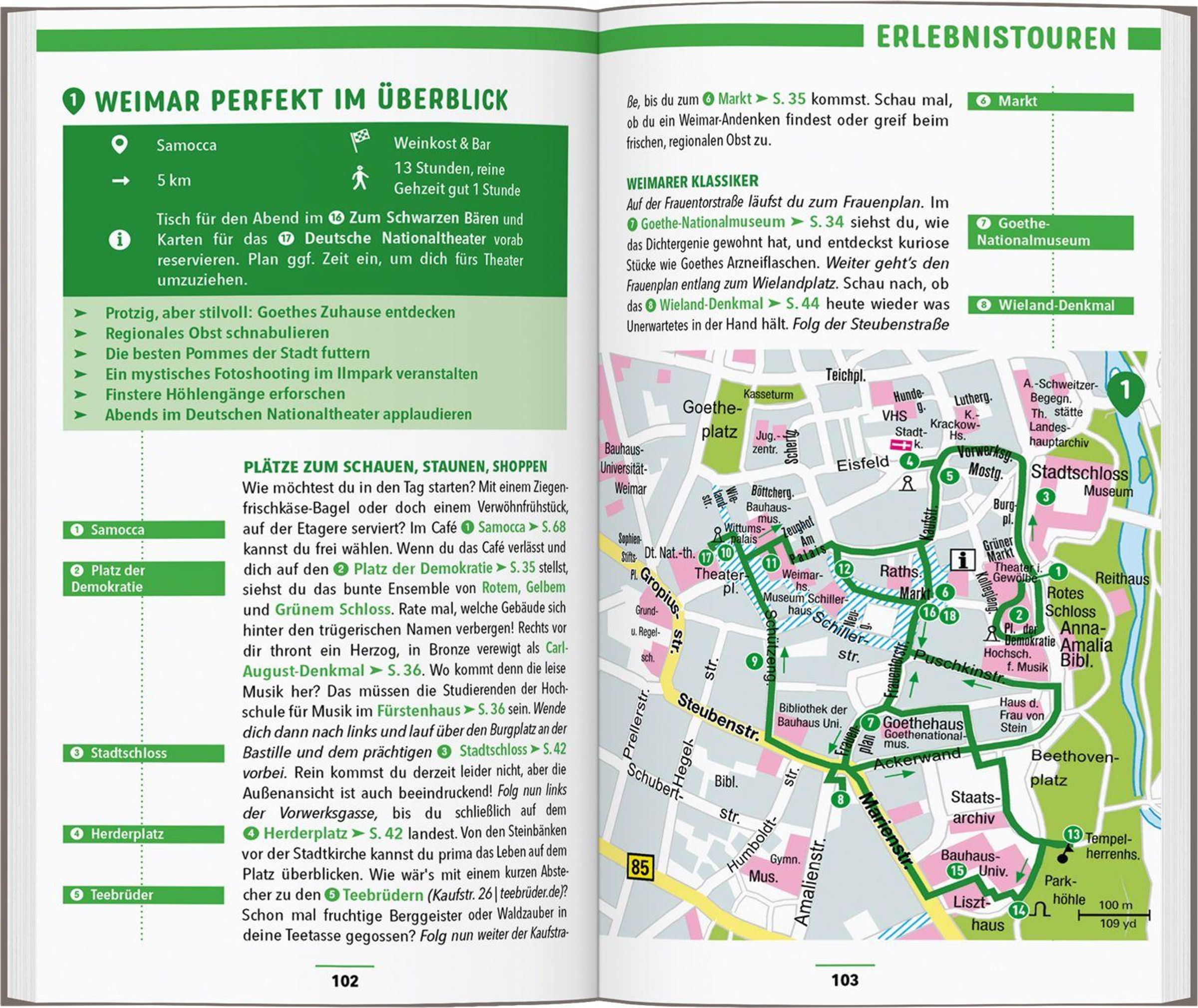 Verschlafenes Städtchen? Von wegen! Goethe und Schiller inmitten von Skatern, historische Fassaden mit modernster Projektionstechnik, Bach im Einklang mit Technosound - in Weimar treffen Gegensätze aufeinander. Ob Barhopping in der Altstadt, Sonnenbaden im historischen Park oder Bratwurst futtern auf dem Wochenmarkt: Mit dem MARCO POLO Reiseführer Weimar wird dein Städteurlaub zum Erlebnis!