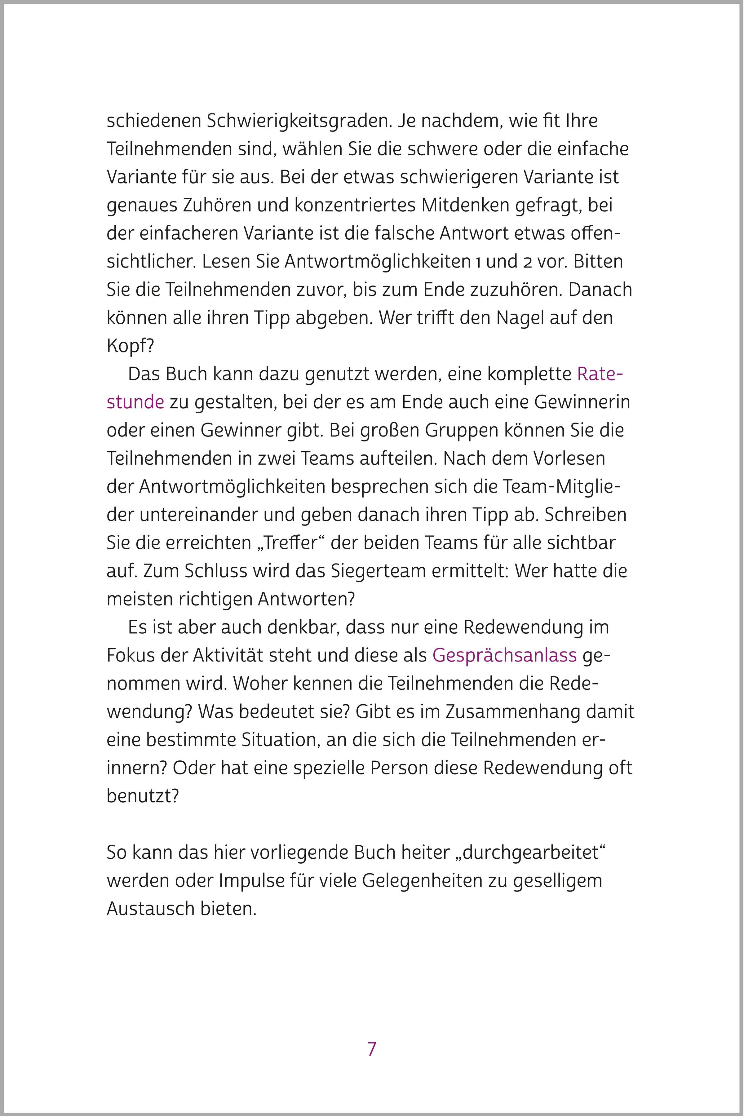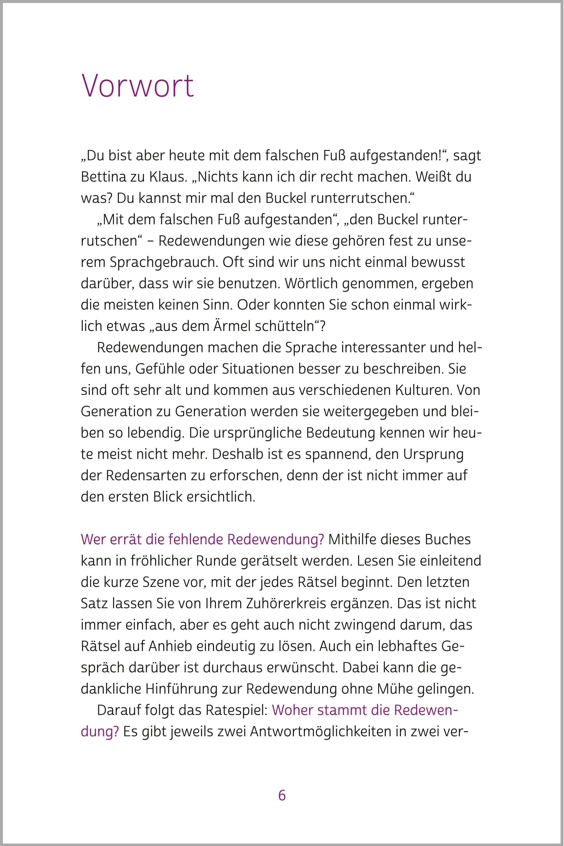Dieses Buch sorgt für gute Laune und Gesprächsstoff: In kurzen Geschichten fehlt jeweils eine Redewendung - und alle dürfen raten, welche gemeint ist. Danach wird's knifflig: Woher stammt die Redensart? Zwei Antwortmöglichkeiten, zwei Schwierigkeitsgrade - und jede Menge Spaß beim Miträtseln.