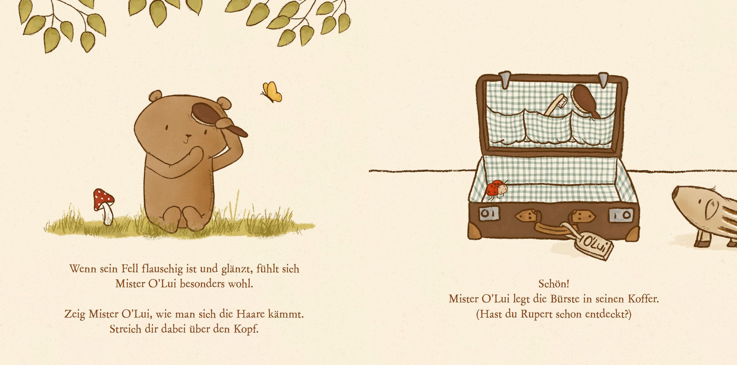Biberbär Mister O'Lui und sein bester Freund Rupert, das Streifenschwein, freuen sich auf eine große Reise! Doch erst mal heißt es: Koffer packen! Was Mister O'Lui mitnehmen will? Natürlich alles, was ihn glücklich macht! Hilfst du ihm, den Koffer zu packen? Zeig doch mal mit einfachen Bewegungen, wie schön eine warme Tasse Kakao in deinem Bauch kribbelt und wie lustig man mit den Zehen in bunten Ringelsocken wackeln kann. Toll gemacht - ab in den Koffer damit! Und im Nu kann die Reise losgehen! Ein Mitmach-Pappbilderbuch mit zwei Freunden, die man einfach ins Herz schließen muss!