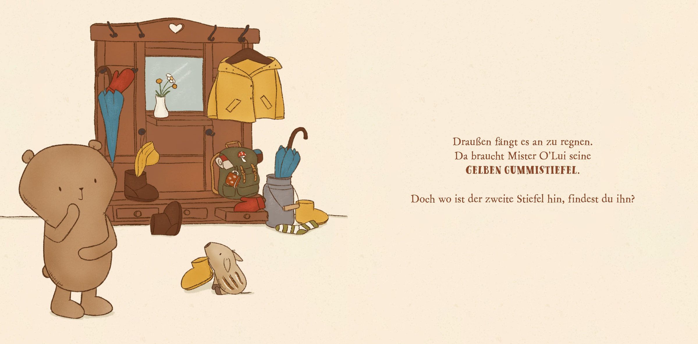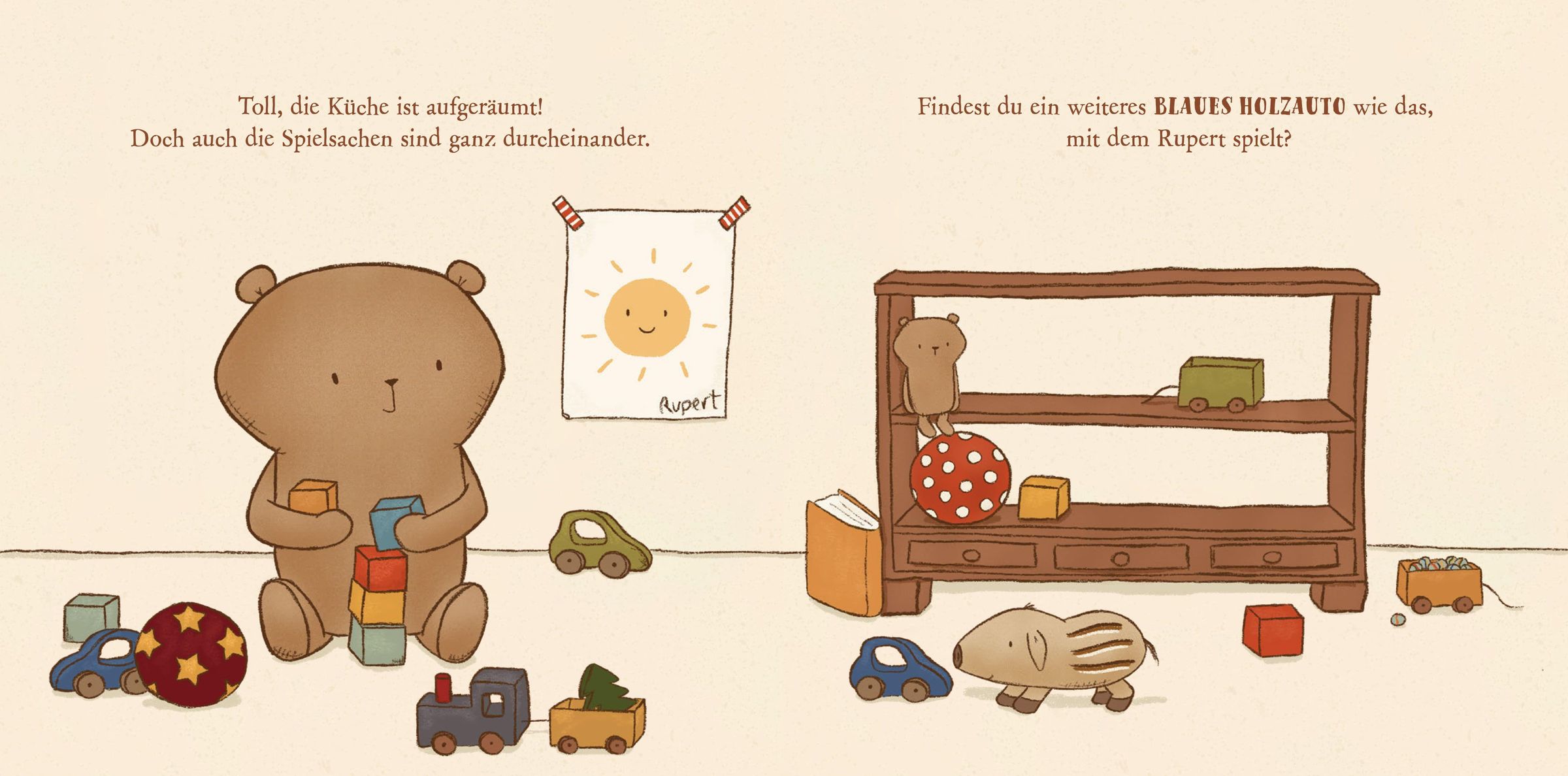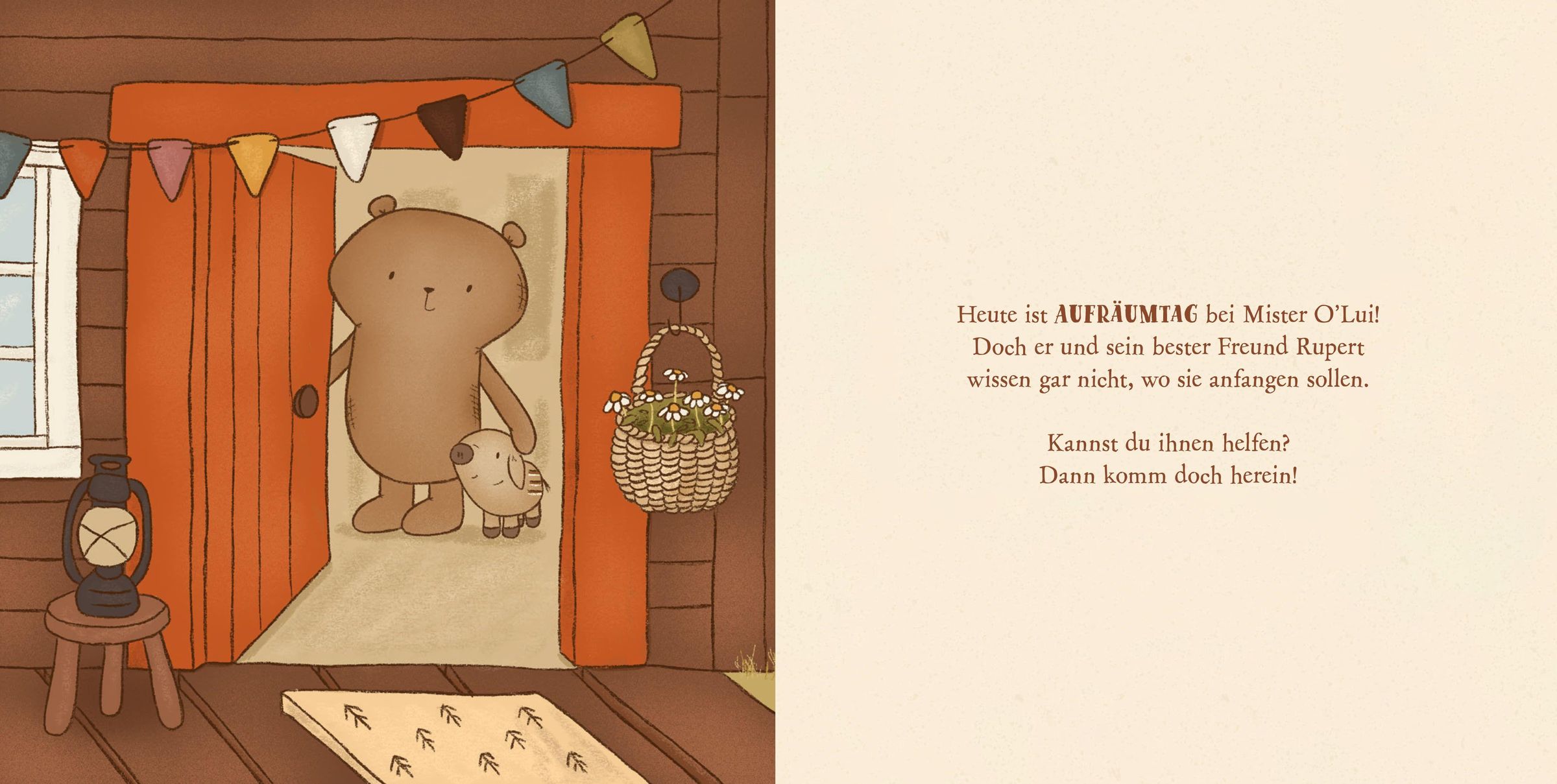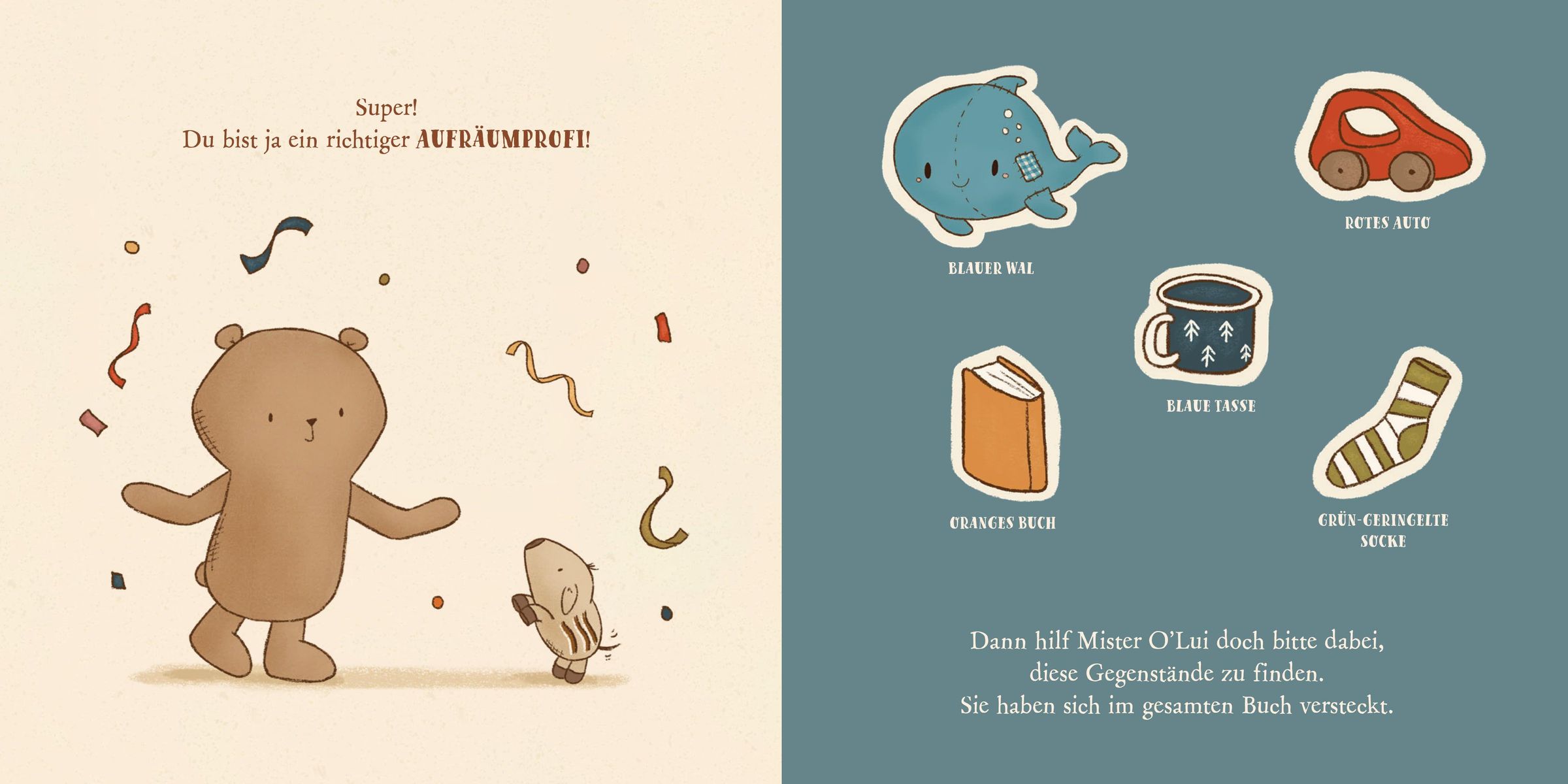 Nanu, wie sieht es denn hier aus? Mister O'Lui und sein bester Freund Rupert müssen dringend aufräumen. Doch das ist leichter gesagt als getan: In der Küche ist Ruperts Tasse verschwunden, im Garten wird eine weitere grüne Schaufel vermisst, und irgendwo hat sich die zweite gestreifte Socke versteckt. Hast du gut aufgepasst? Dann zeig dem Biberbären, wo er suchen muss!