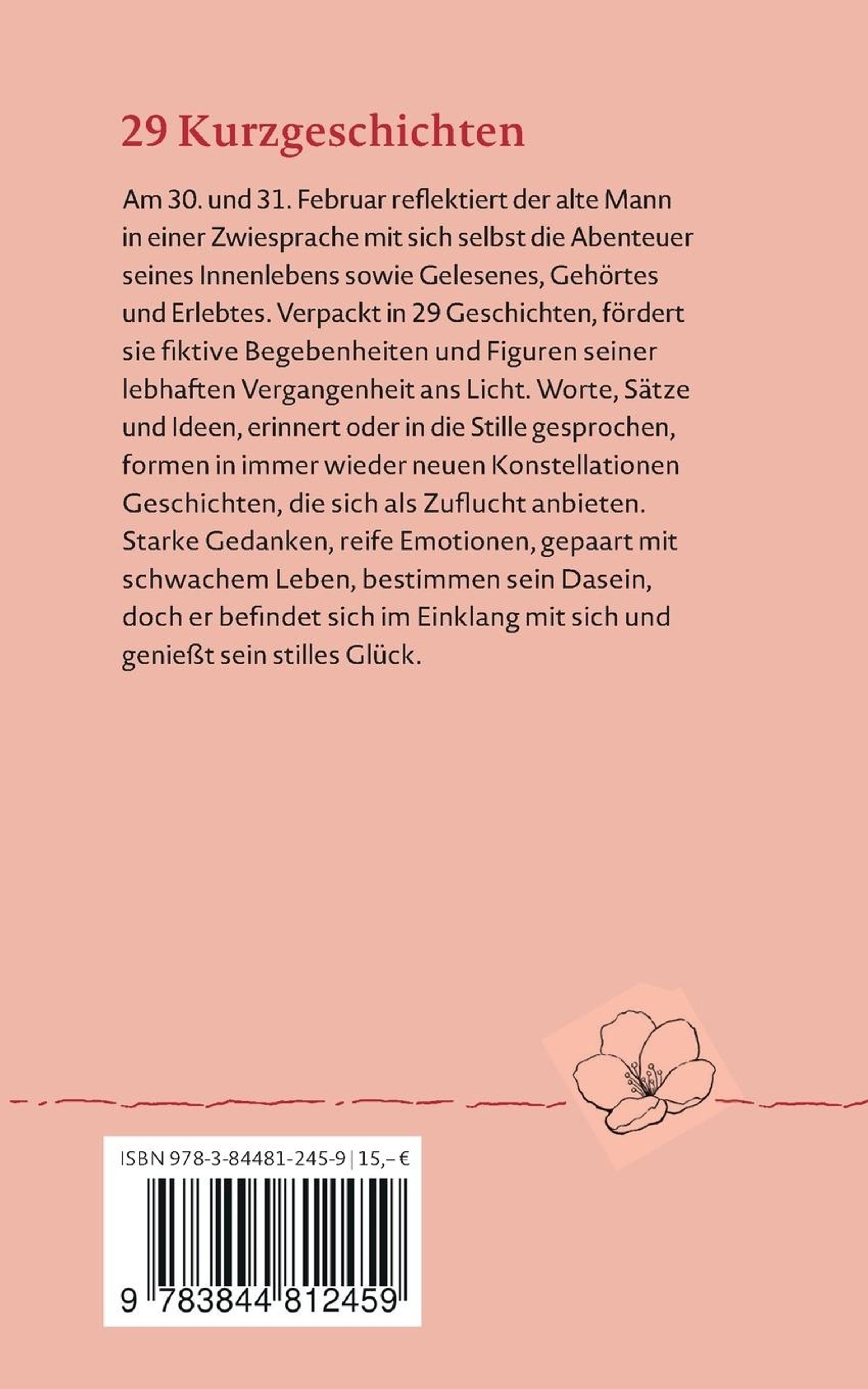 Am 30. und 31. Februar reflektiert der alte Mann in einer Zwiesprache mit sich selbst die Abenteuer seines Innenlebens sowie Gelesenes, Gehörtes und Erlebtes. Verpackt in 29 Geschichten, fördert sie fiktive Begebenheiten und Figuren seiner lebhaften Vergangenheit ans Licht. Worte, Sätze und Ideen, erinnert oder in die Stille gesprochen, formen in immer wieder neuen Konstellationen Geschichten, die sich als Zuflucht anbieten. Starke Gedanken, reife Emotionen, gepaart mit schwachem Leben, bestimmen sein Dasein, doch er befindet sich im Einklang mit sich und genießt sein stilles Glück.