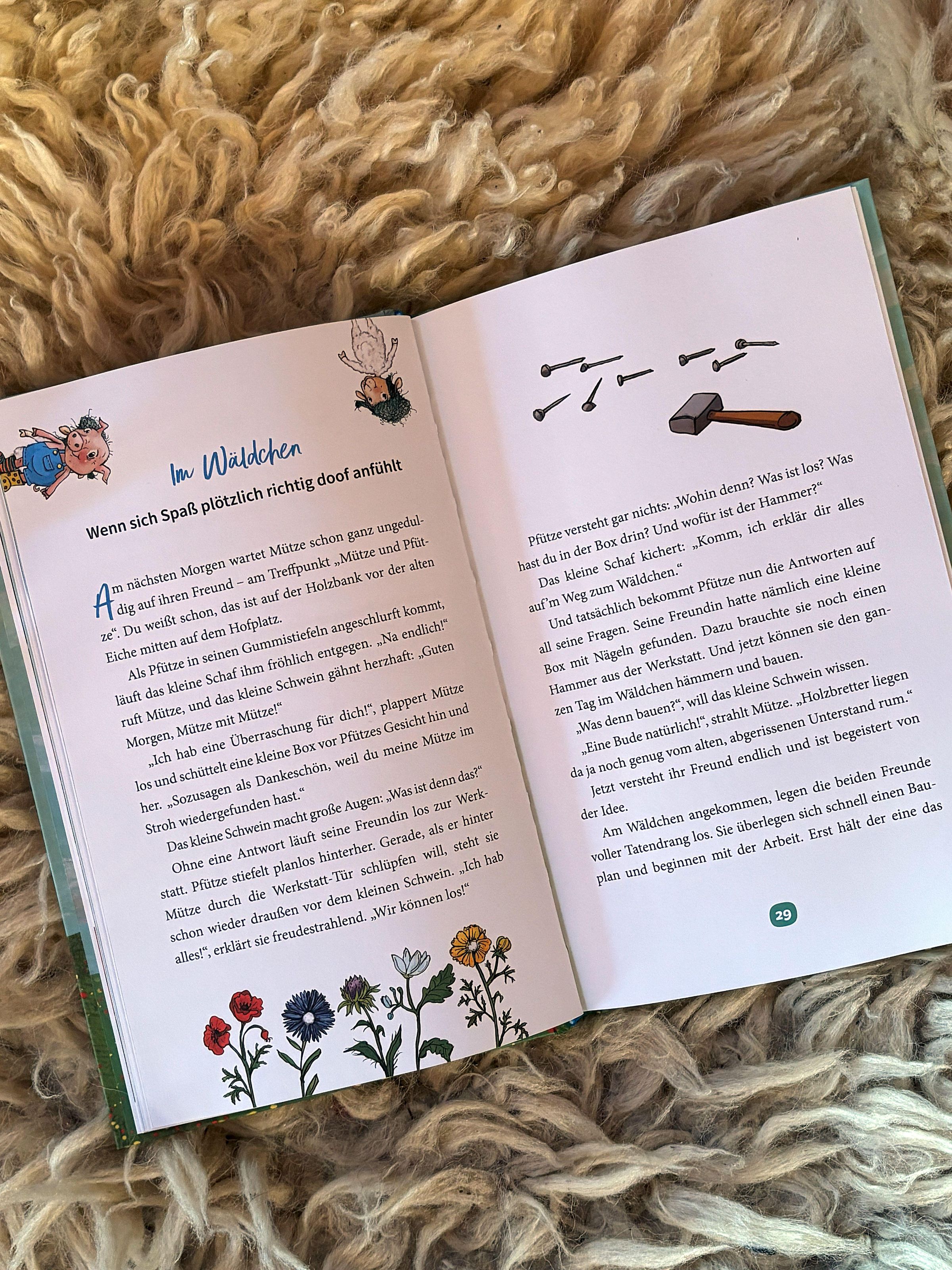 Mütze , das fröhliche Schaf, und Pfütze, das kleine Schwein, sind unzertrennlich. Zusammen erkunden sie den Bauernhof - und die Welt dahinter! Sie bauen eine geheime Bude im Wald, sausen quietschvergnügt die Rutsche auf dem Spielplatz hinab und erleben eine Nacht im Schweinestall, die ganz anders endet als gedacht ...