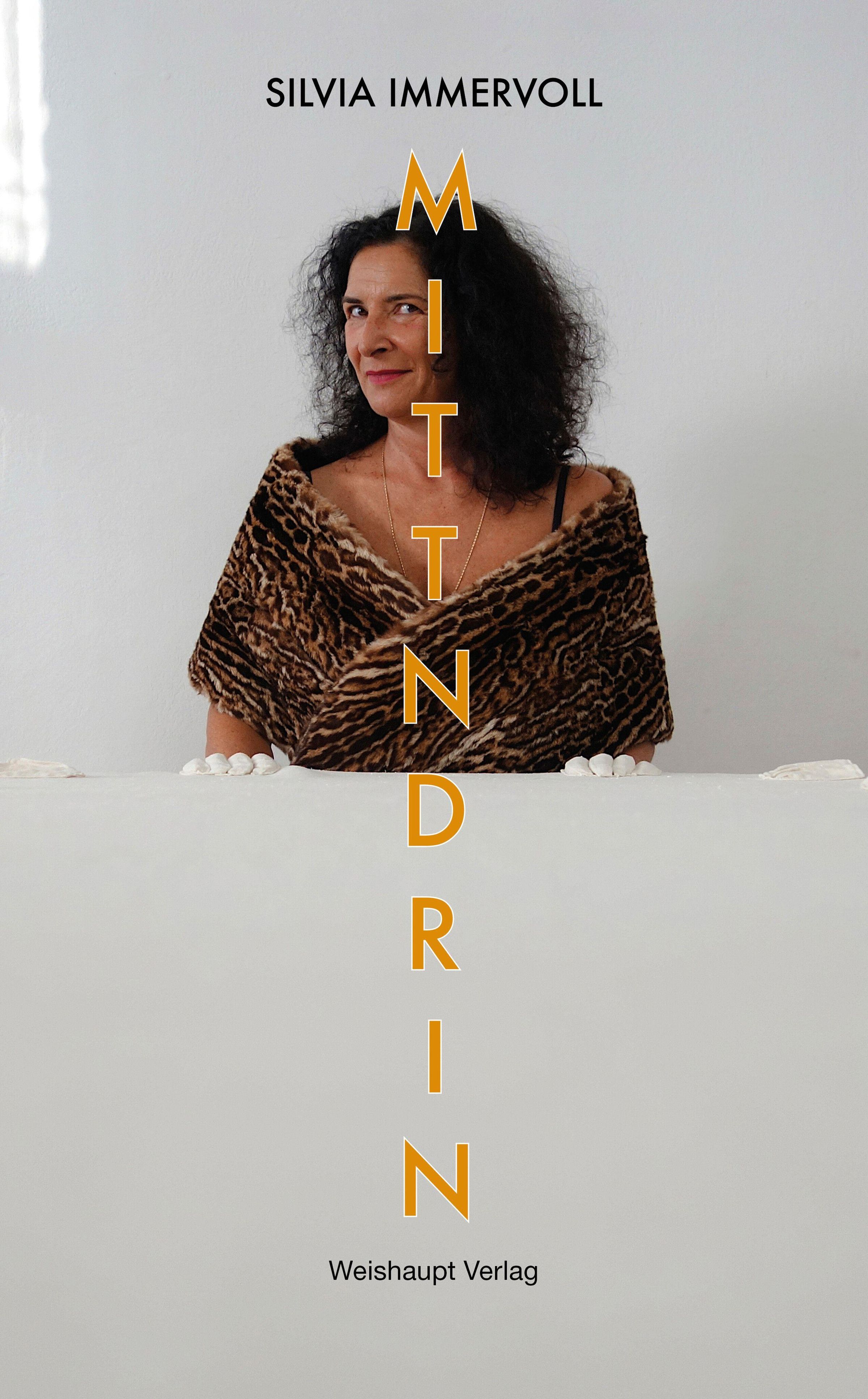 Text: "SILVIA IMMERVOLL", "MITTENDRIN", "Weishaupt Verlag". Frau in Felloptik-Schal vor hellem Hintergrund., Buch