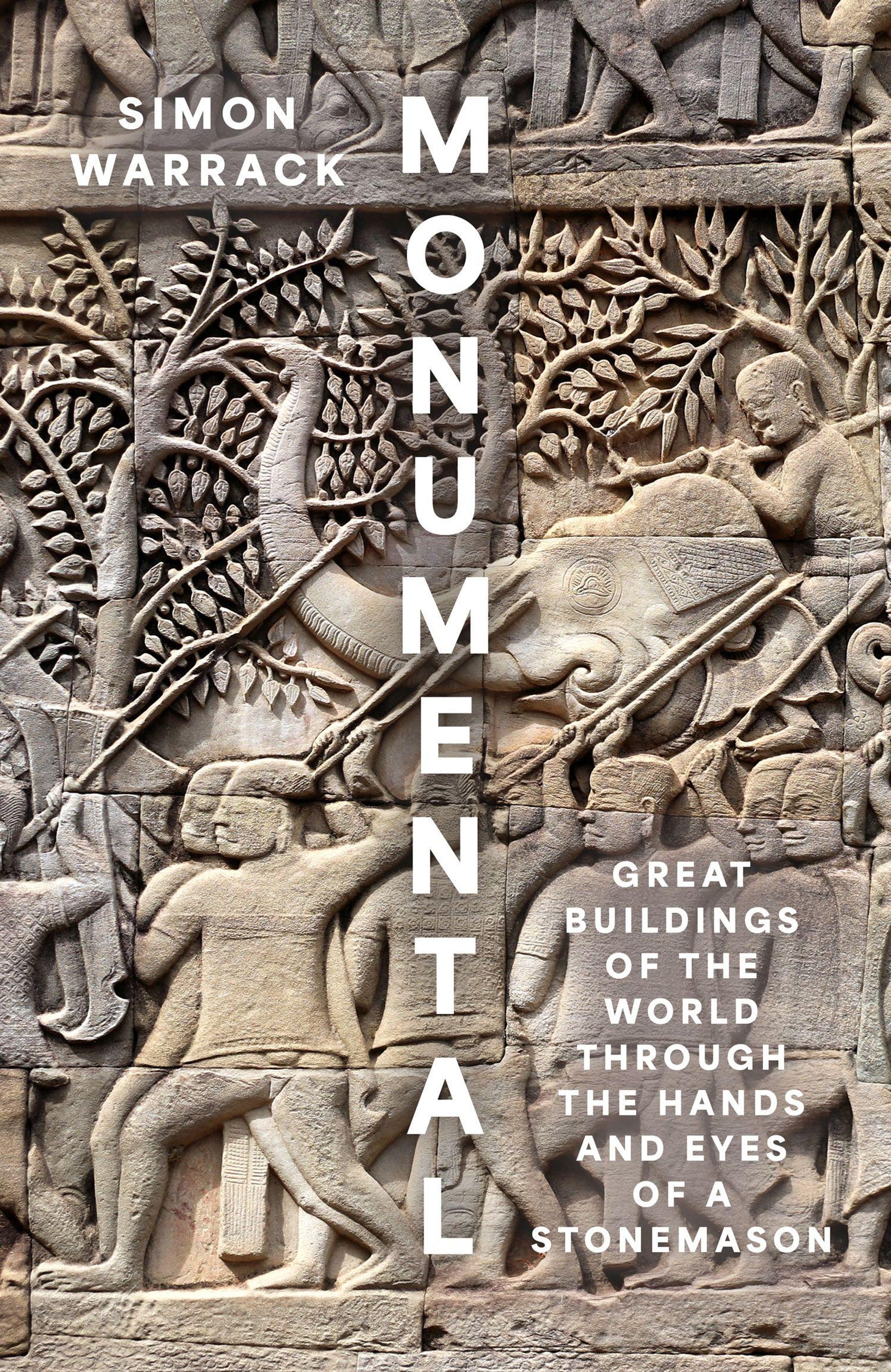 "MONUMENTAL" vertikal. "SIMON WARRACK" oben links. Steinrelief mit Menschen und einem Elefanten, reich an Details., Buch