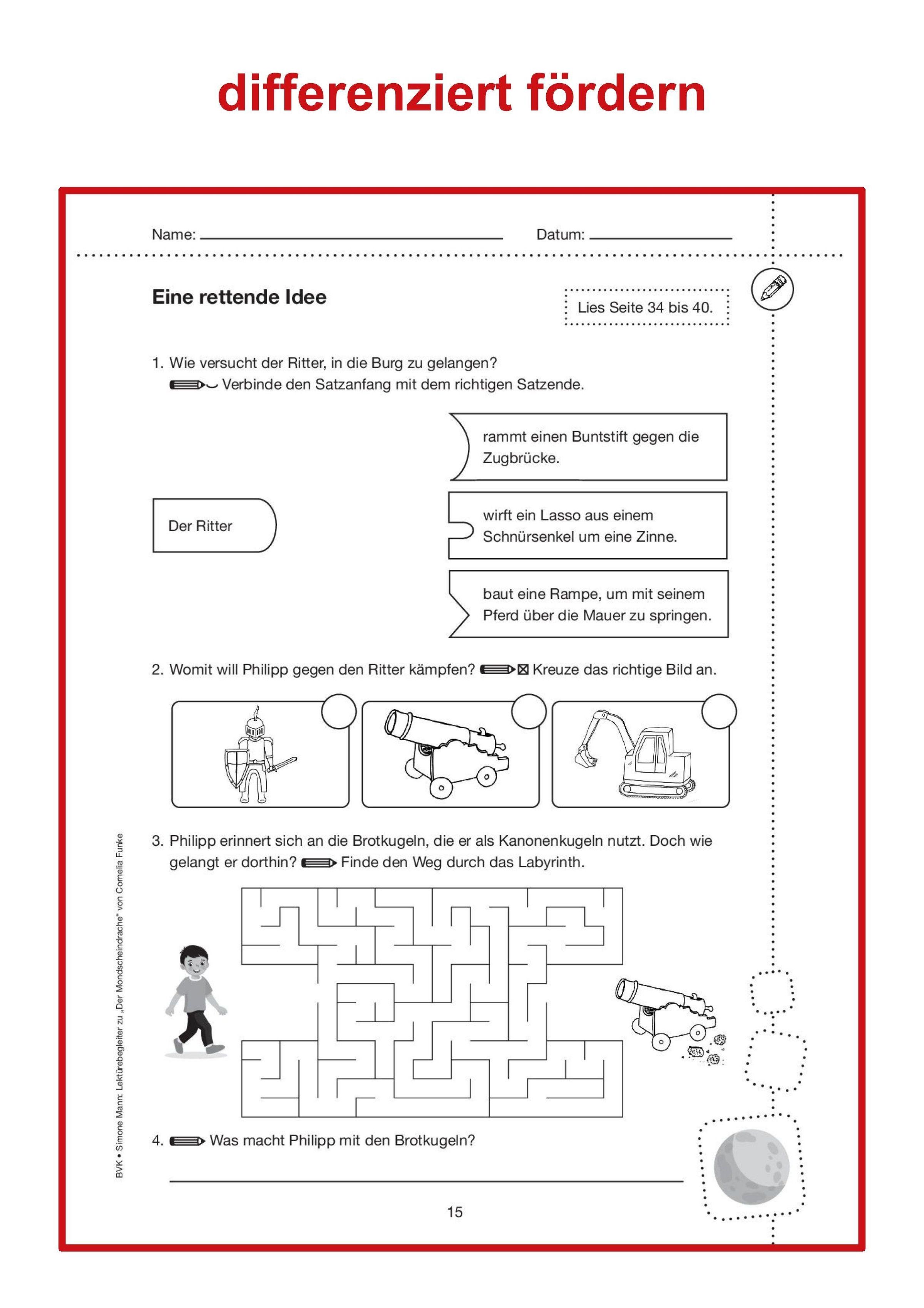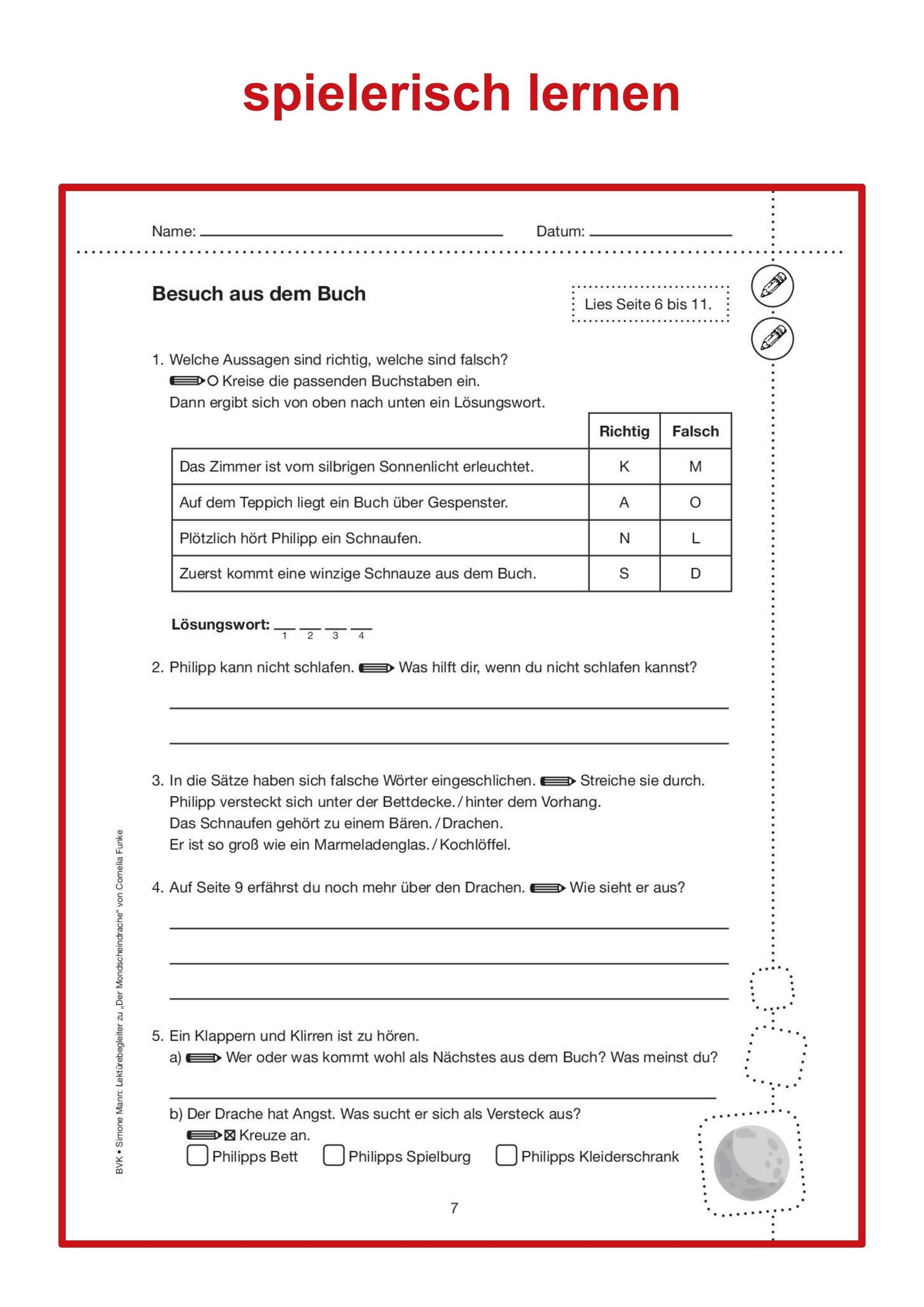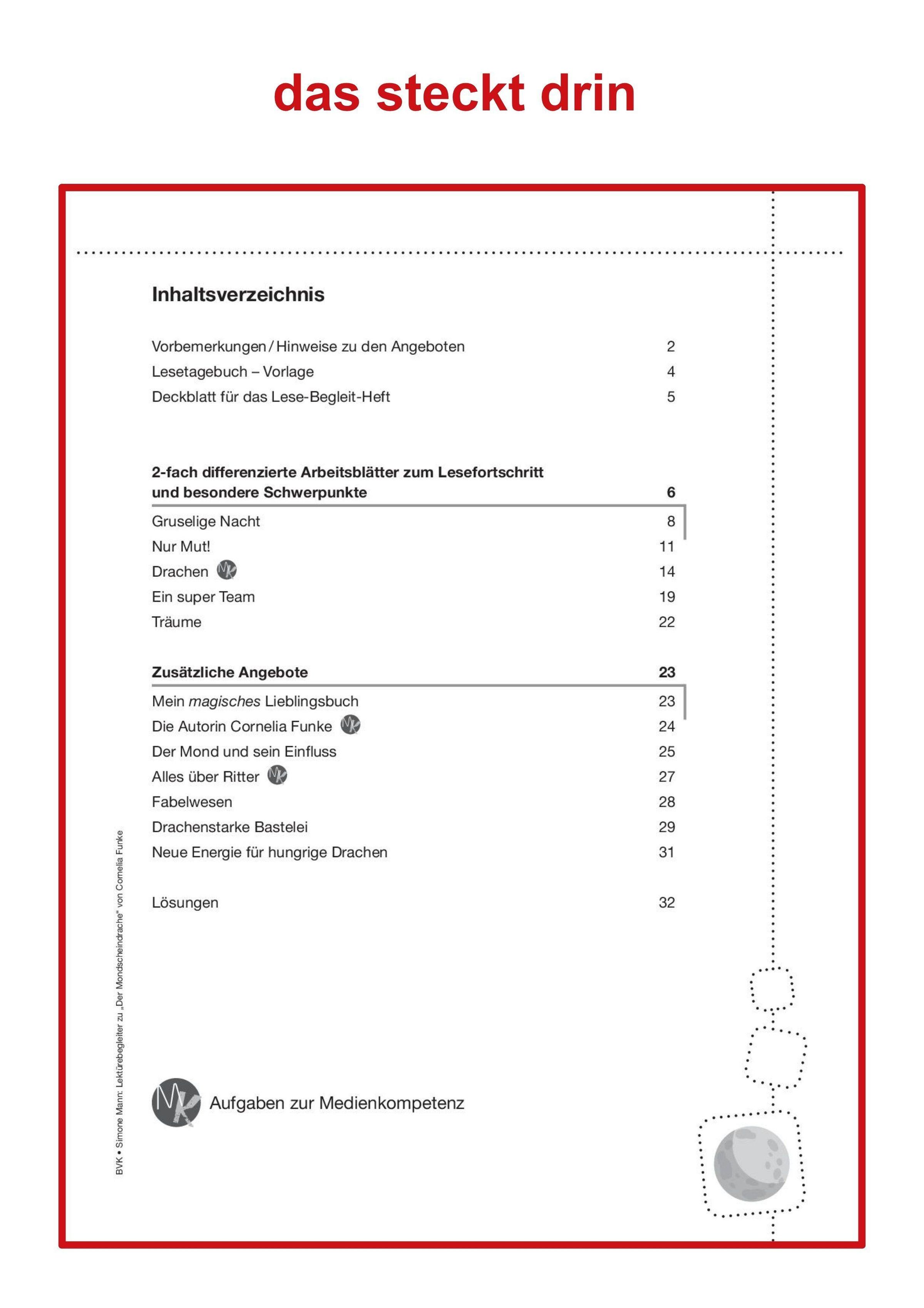 Das beliebte Kinderbuch von Cornelia Funke vereint gleich mehrere Themengebiete, die Kinder faszinieren: Fabelwesen, Ritter und Zauberei. Es geht aber auch um Mut, gemeinsame Stärke und darum, seine Angst zu überwinden. Der Lektürebegleiter begleitet mit zweifach differenzierten Arbeitsblättern den Lesefortschritt und bietet darüber hinaus Arbeitsblätter zu verschiedenen Themen des Buches. Die Kinder beschäftigen sich mit der Autorin des Buches, dem Mond, Rittern und Fabelwesen.