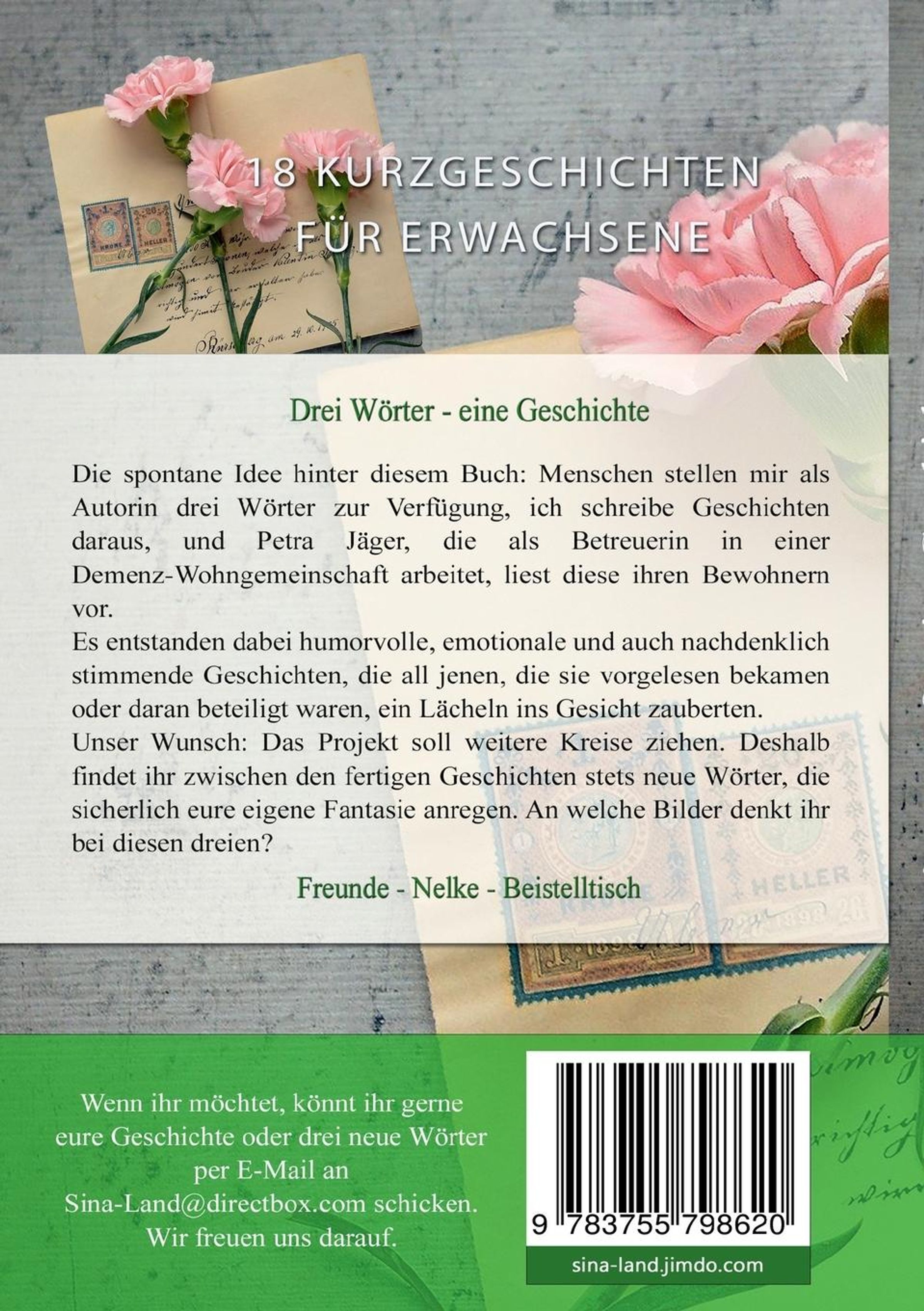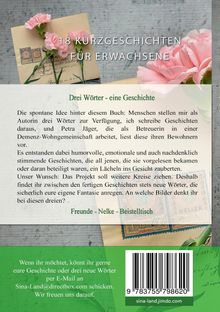 Die spontane Idee hinter diesem Buch: Menschen stellen mir als Autorin drei Wörter zur Verfügung, ich schreibe Geschichten daraus, und Petra Jäger, die als Betreuerin in einer Demenz-Wohngemeinschaft arbeitet, liest diese ihren Bewohnern vor. Es entstanden dabei humorvolle, emotionale und auch nachdenklich stimmende Geschichten, die all jenen, die sie vorgelesen bekamen oder daran beteiligt waren, ein Lächeln ins Gesicht zauberten. Unser Wunsch: Das Projekt soll weitere Kreise ziehen. Deshalb findet ihr zwischen den fertigen Geschichten stets neue Wörter, die sicherlich eure eigene Fantasie anregen. An welche Bilder denkt ihr bei diesen dreien?