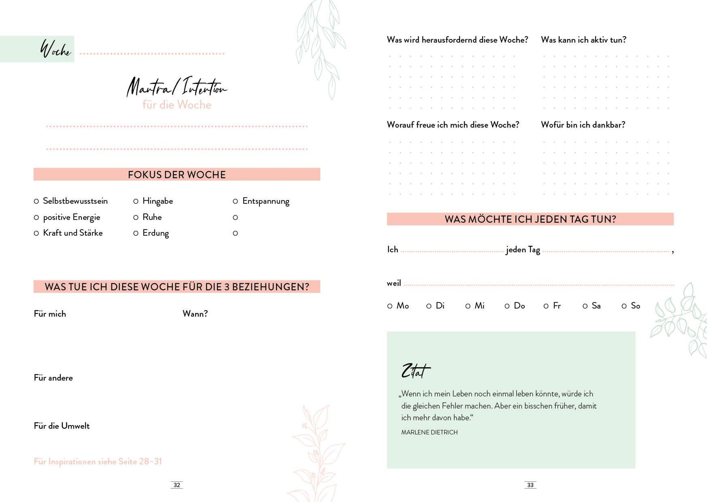 - Undatierte Eintrageseiten, auf denen du dich, deine Bedürfnisse und Ziele Woche für Woche reflektieren kannst