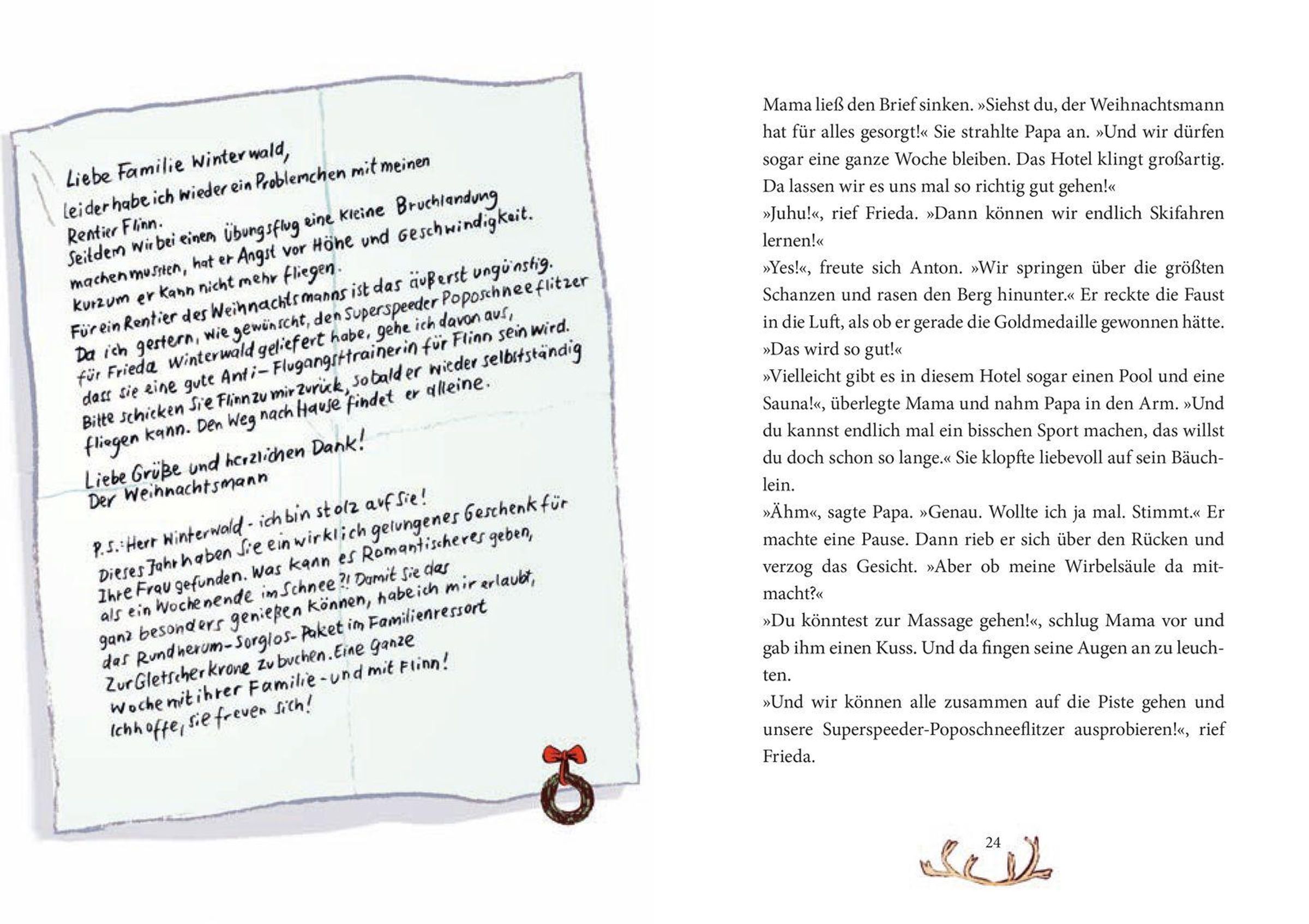 Papa Winterwald ist absolut sicher: Diese Weihnachtsferien werden Rentier-frei, denn die Familie verdrückt sich in den Skiurlaub ! Doch kurz vor der Abreise klingelt es und ein riesiges Paket steht vor der Tür. Im Innern - Überraffung! - sitzt Rentier Flinn, der seit neuestem unter Flugangst leidet. Keine Chance, dass er dieses Jahr den Schlitten vom Weihnachtsmann ziehen wird. Und wer könnte ihn besser heilen als Frieda, die sich schon im letzten Jahr so gut um Flinn gekümmert hat? Vielleicht verliert er beim Skifahren und Rodeln in den Bergen die Angst vor Höhe und Geschwindigkeit? Der Weihnachtsmann wünscht erholsame Ferien!