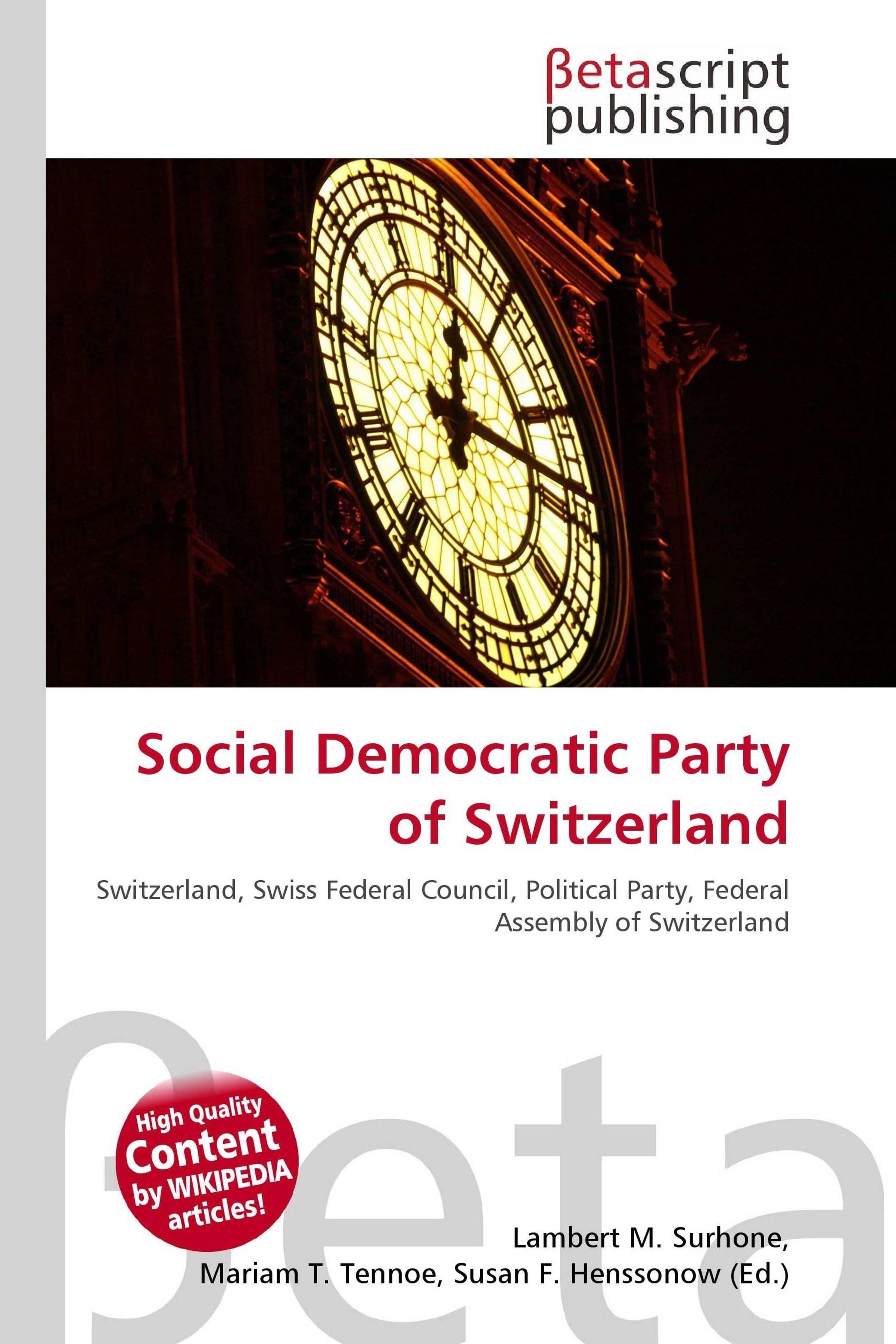 Please note that the content of this book primarily consists of articles available from Wikipedia or other free sources online. The Social Democratic Party of Switzerland (also rendered as Swiss Socialist Party; German: Sozialdemokratische Partei der Schweiz, SP; French: Parti socialiste suisse, PS; Italian: Partito Socialista Svizzero; Romansh: Partida Socialdemocrata de la Svizra) is a political party in Switzerland. It was founded on October 21, 1888, and is currently the second largest of the four leading coalition political parties in Switzerland. It is the left-most party with representatives in the Swiss Federal Council. It is also the second largest political party in the Swiss parliament. The current members in the Swiss Federal Council are: Micheline Calmy-Rey and Moritz Leuenberger.